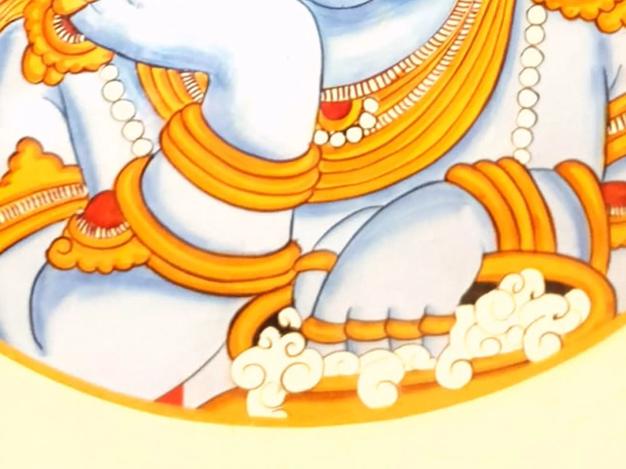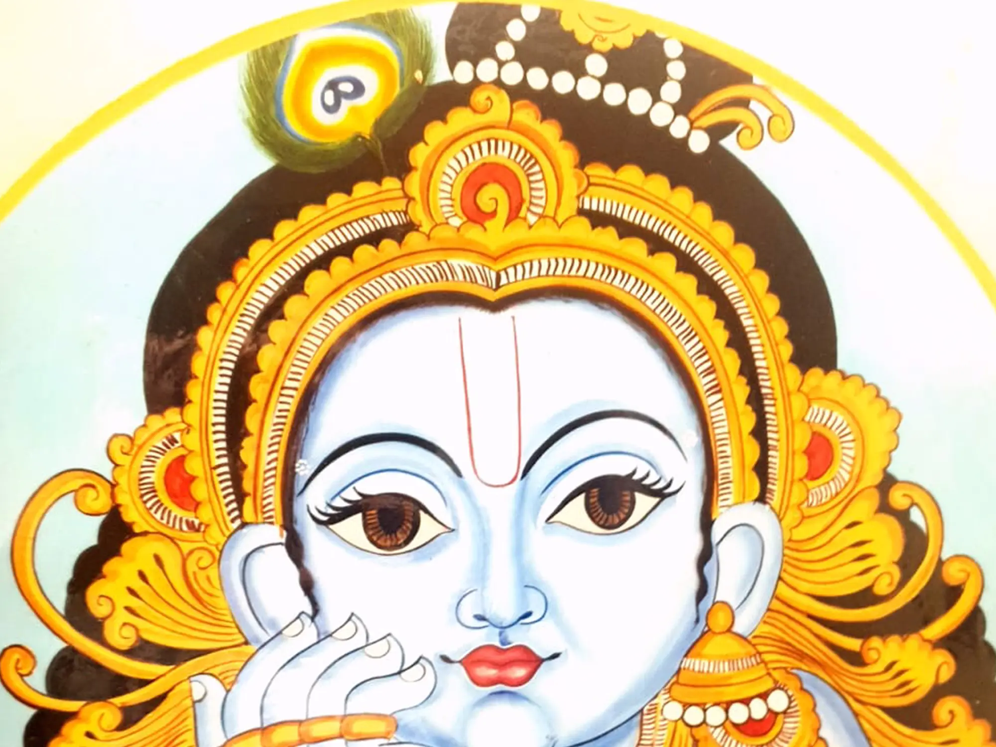 Akriti Bhardwaj's painting on MDF Wood captures the essence of Bal Gopal in Kerala Mural Style with unparalleled charm. The depiction showcases the divine child deity, sitting amidst a serene backdrop, engrossed in play with a pitcher of butter. Adorned with intricate jewelries and a captivating mukut, Bal Gopal radiates innocence and divine grace.