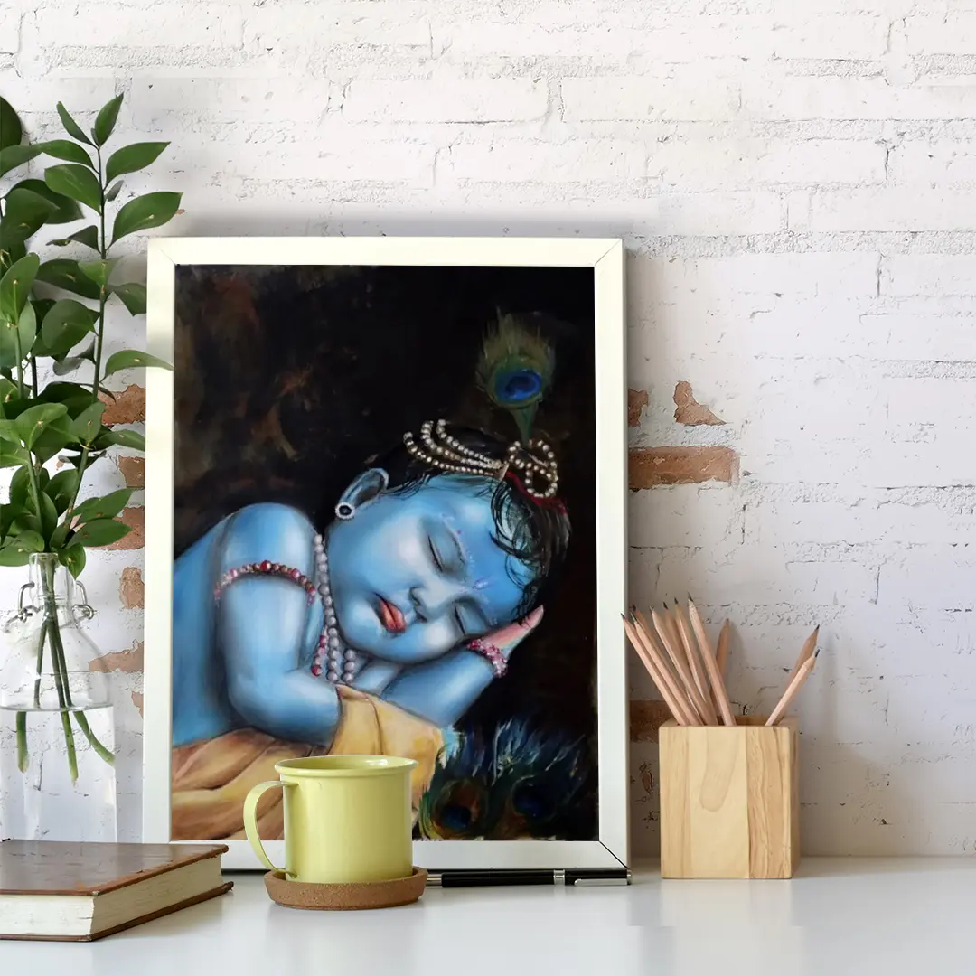 The captivating azure skin tone, rendered with such subtle gradations, evokes a sense of divinity and otherworldly beauty. You'll appreciate the soft blush on the cheeks and lips, suggesting the gentle slumber of a beloved deity. Adornments of pearls and precious stones, along with the iconic peacock feather crowning the figure, are depicted with a realism that elevates the visual experience, while the rich, dark background provides a dramatic contrast, making the subject truly ethereal. This creation measures 11.70 inches in height and 8.60 inches in width, a perfect size to command attention without overwhelming its surroundings.
