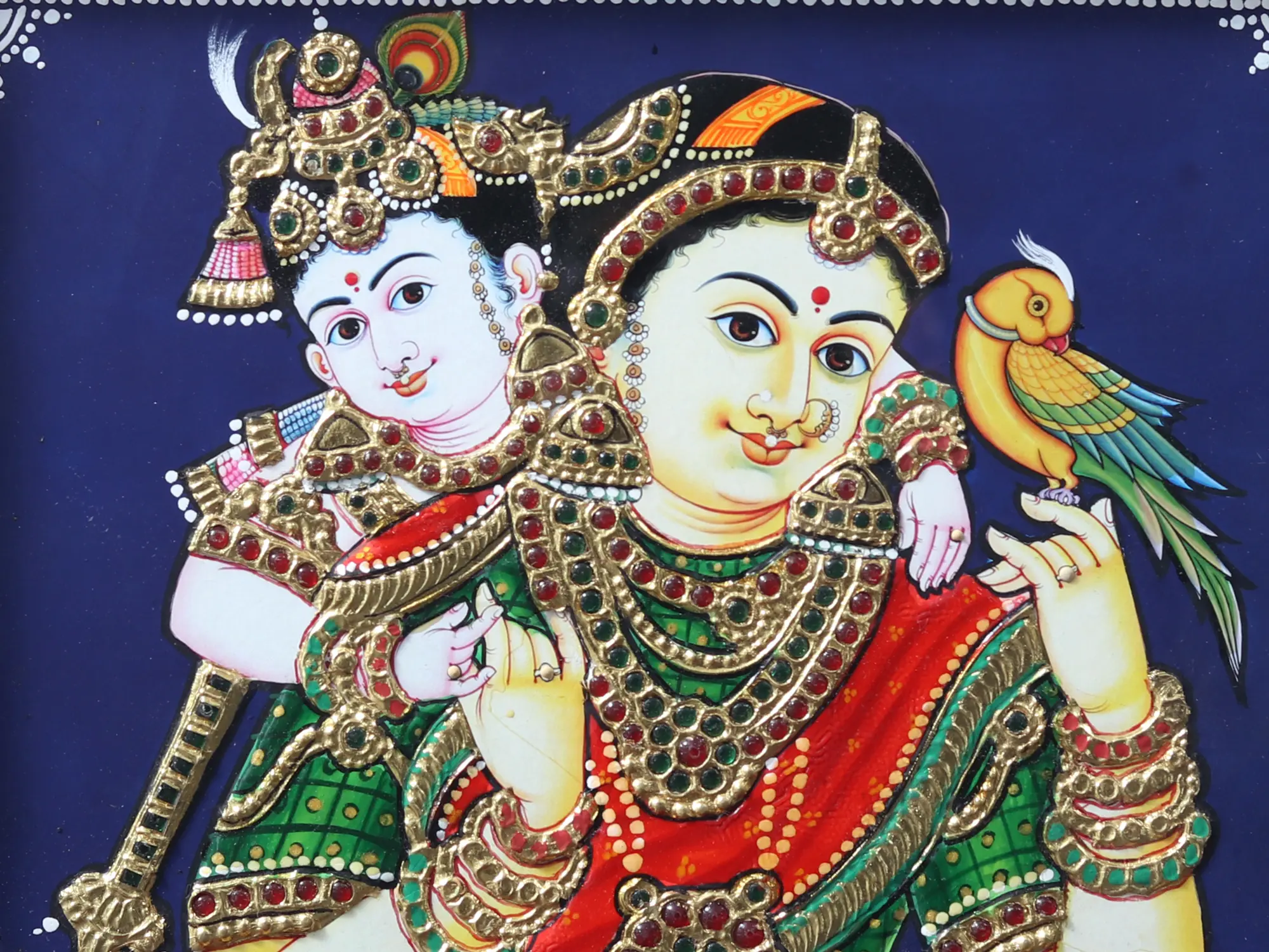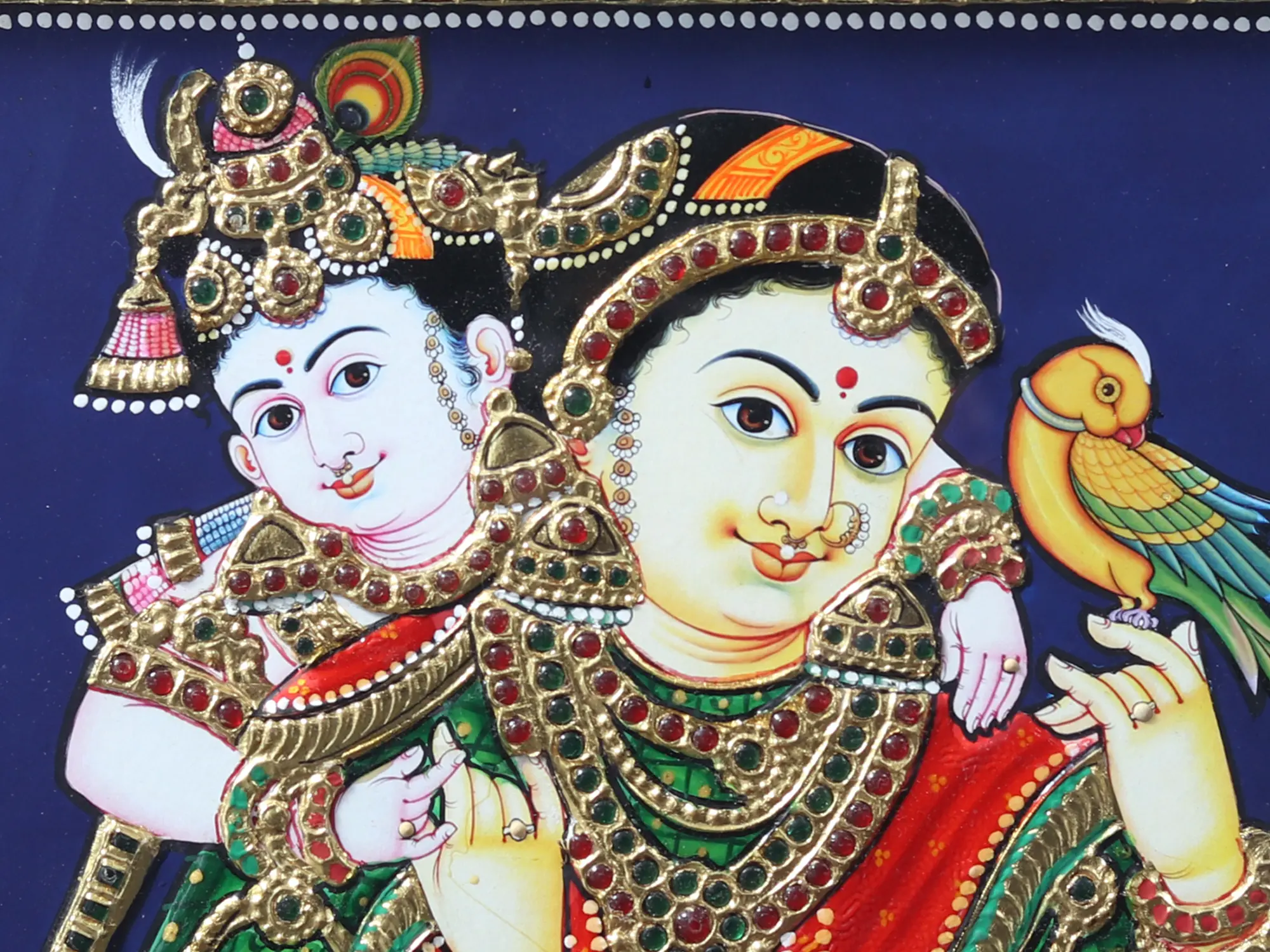 Tanjore painting is a traditional form of art in the South Indian style and was started by the inhabitants of a small town known as Thanjavur of Tamil Nadu. This gives it another name called “Thanjavur painting”. This painting draws its figures, designs, and inspiration from the time when Vedic culture was prevalent in India. Certain remarkable features of a Tanjore painting distinguish it from other paintings. Some of these are pure gold or gold foil coating on gesso work, the use of rich and vivid colors, and the inlay of cut-glass or semi-precious and precious stones. The subjects of most of the Tanjore paintings are Hindu Gods, Goddesses, and saints. The main devotional figure is portrayed in the central portion of the painting and is usually surrounded by various secondary figures.