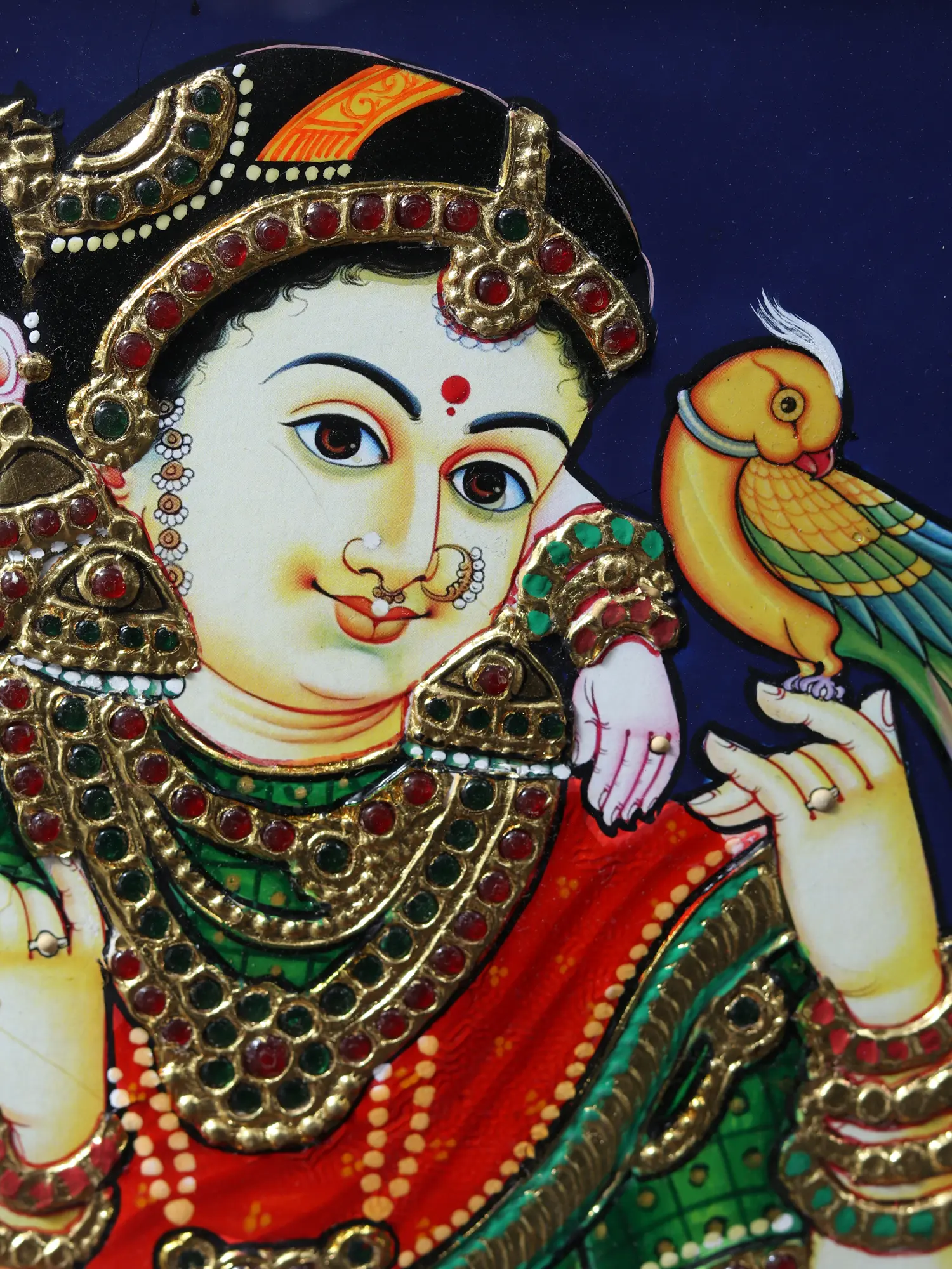 This masterpiece is brought to life through the renowned Tanjore painting technique, a cherished art form originating from the southern Indian state of Tamil Nadu. Each detail is meticulously rendered by skilled artisans, employing traditional methods passed down through generations. Vibrant, mineral-based pigments are expertly applied, enhanced by the shimmering brilliance of genuine gold foil work. The intricate ornamentation, from the delicate jewelry to the richly adorned attire, is a testament to the extraordinary craftsmanship and dedication poured into its creation.