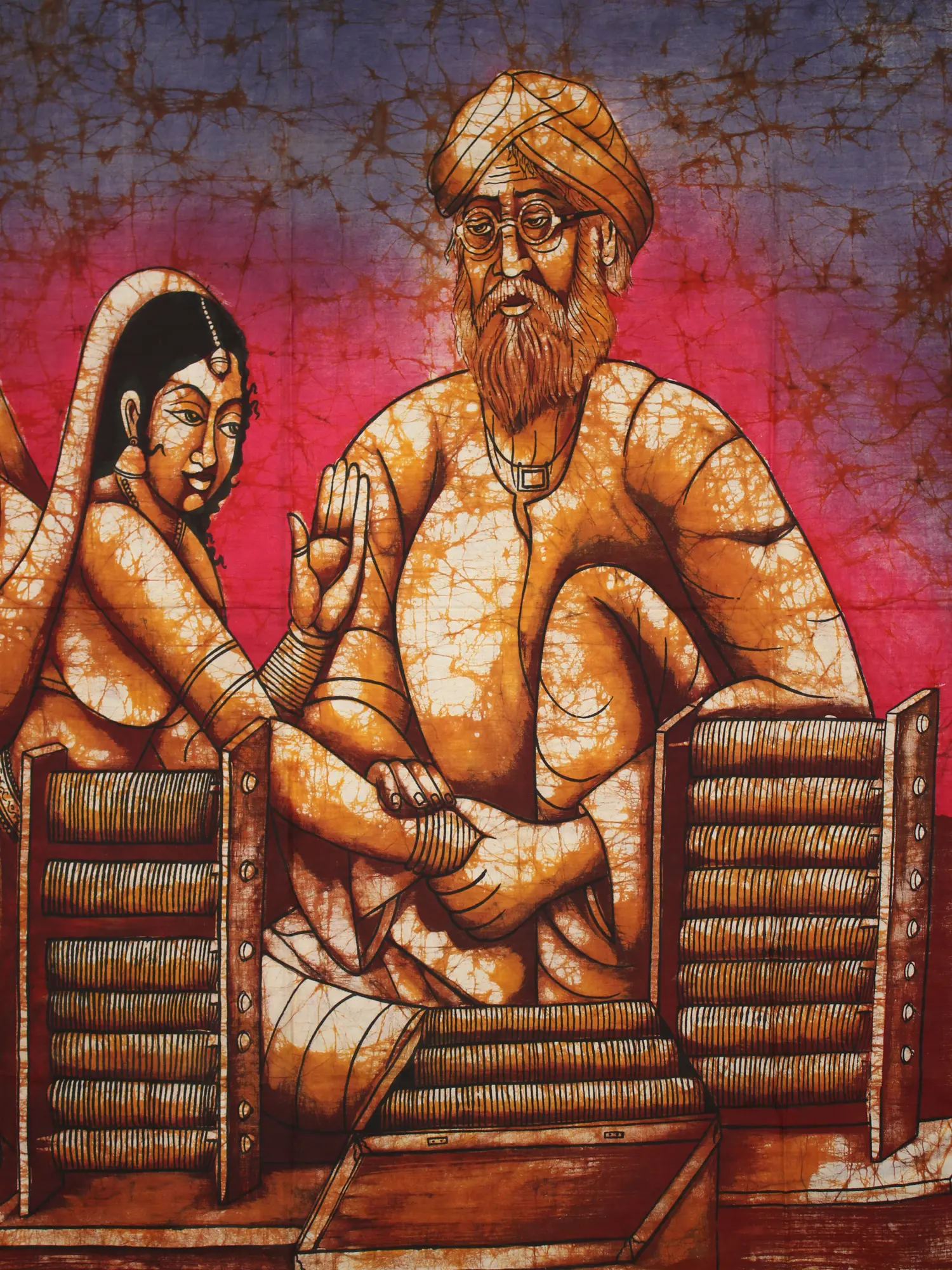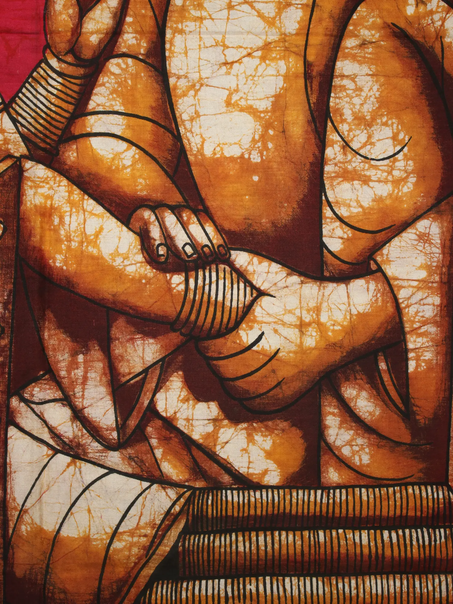 The figures, bathed in orange tones resembling sepia, exude an antique charm, emphasizing the timeless quality of the bangle seller's narrative. The contemplative subject, adorned with glasses, becomes a focal point, embodying the introspective spirit of Naidu's poetry, making this Batik a poignant visual interpretation of the verses.