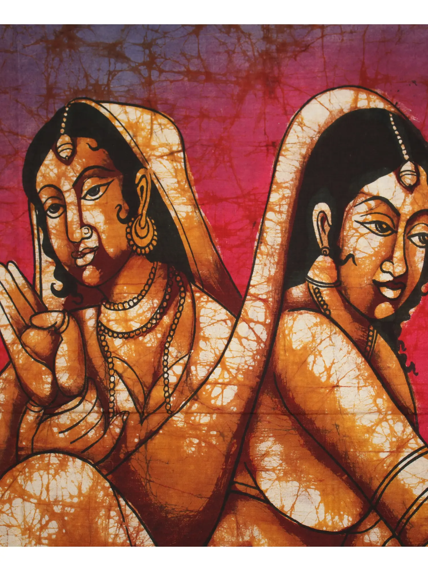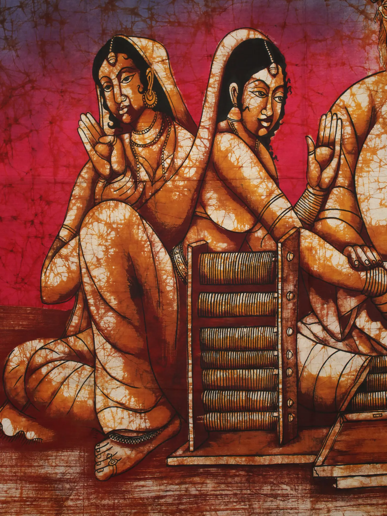 This Batik Painting, portraying a Bangle Seller, pays homage to Sarojini Naidu's evocative poem. The use of vibrant purple and pink hues creates a dramatic backdrop, emphasizing the emotional intensity of the scene. Cracks formed by the sinking paint through the wax evoke a sense of temporal fragility, mirroring the poignant themes in Naidu's verses.