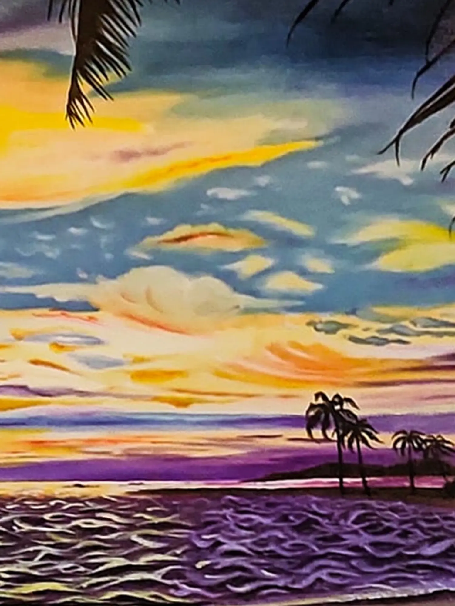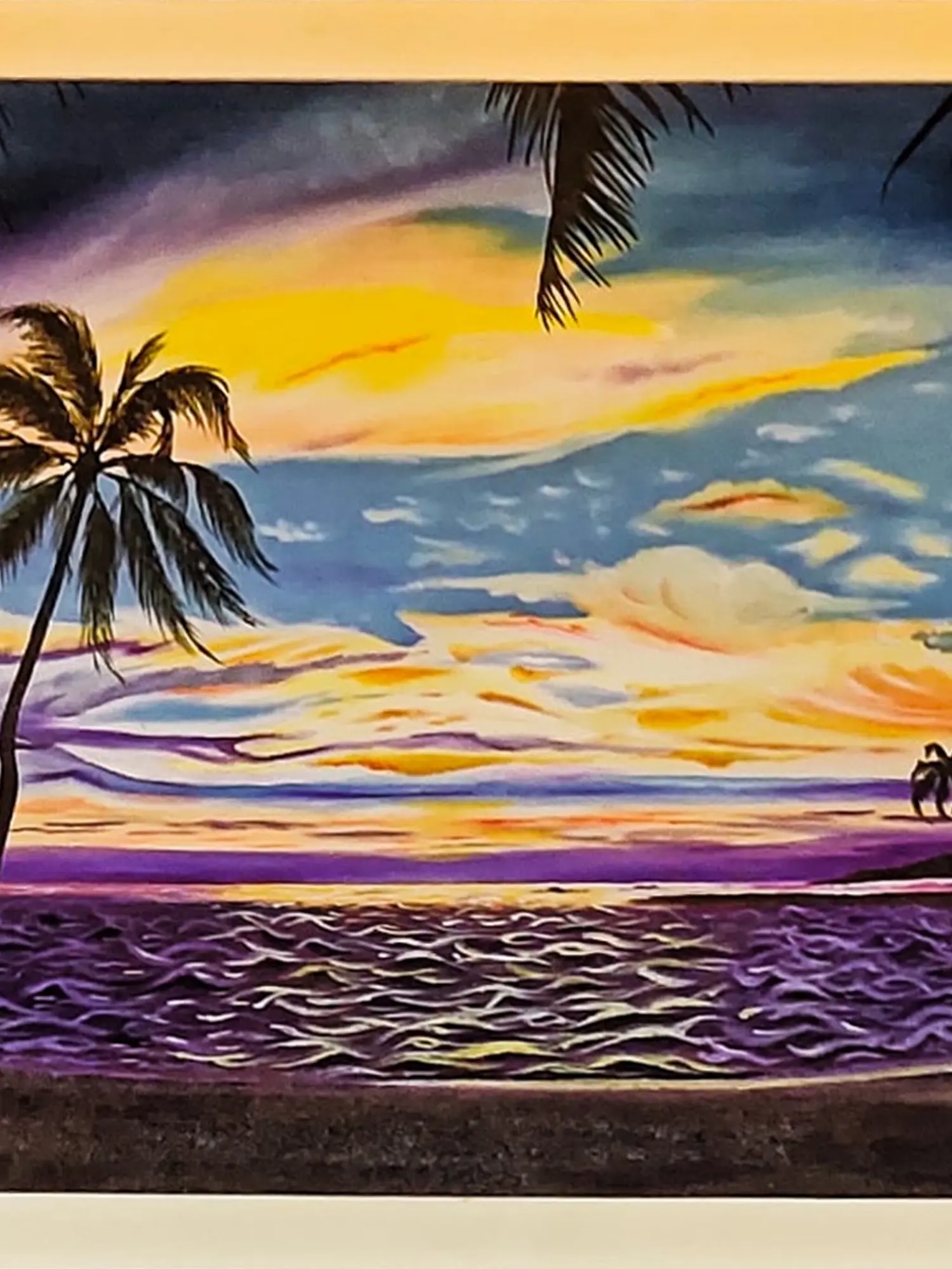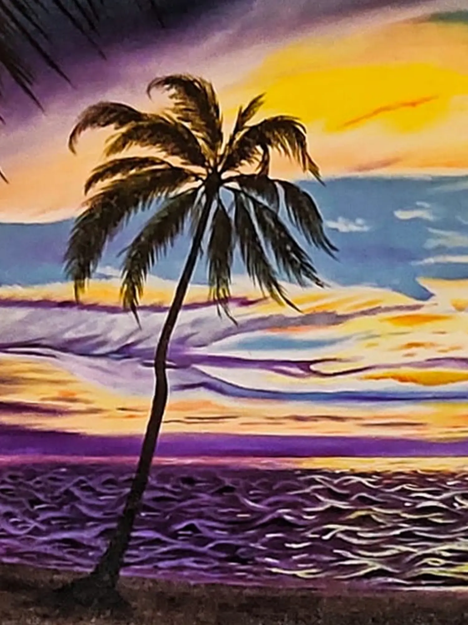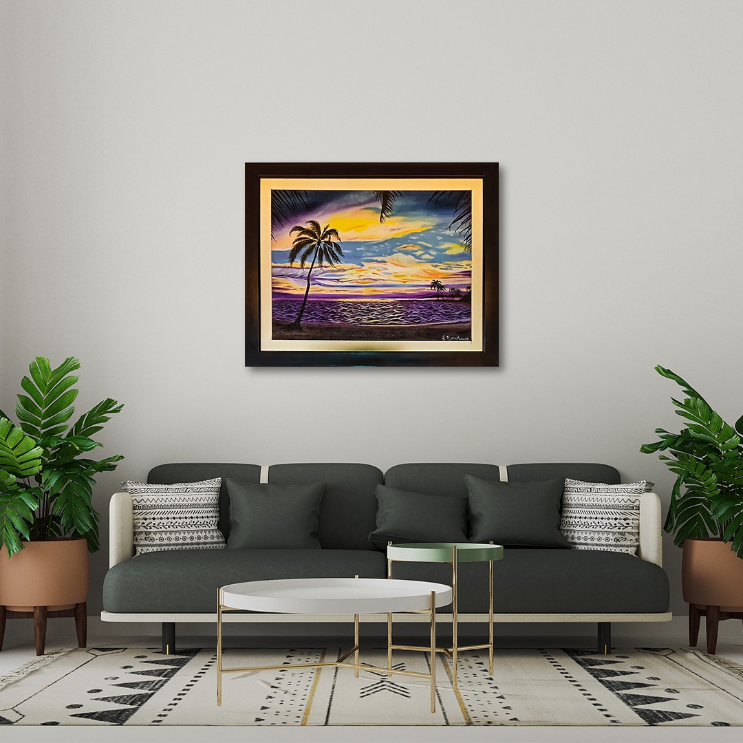 Completing the serene scene, a lone palm tree stands in the corner, enhancing the tropical ambiance. Randhawa's meticulous use of color and composition transports viewers to the peaceful shores, where the harmonious convergence of nature's elements unfolds in a captivating sunset tableau.