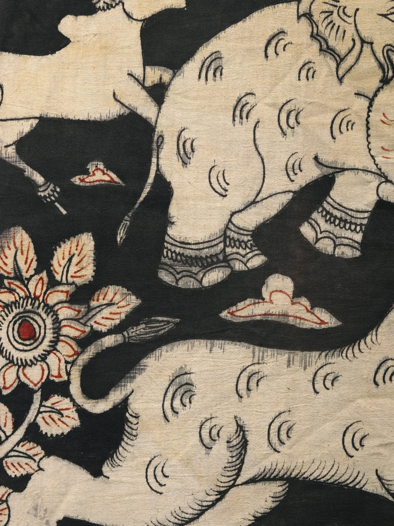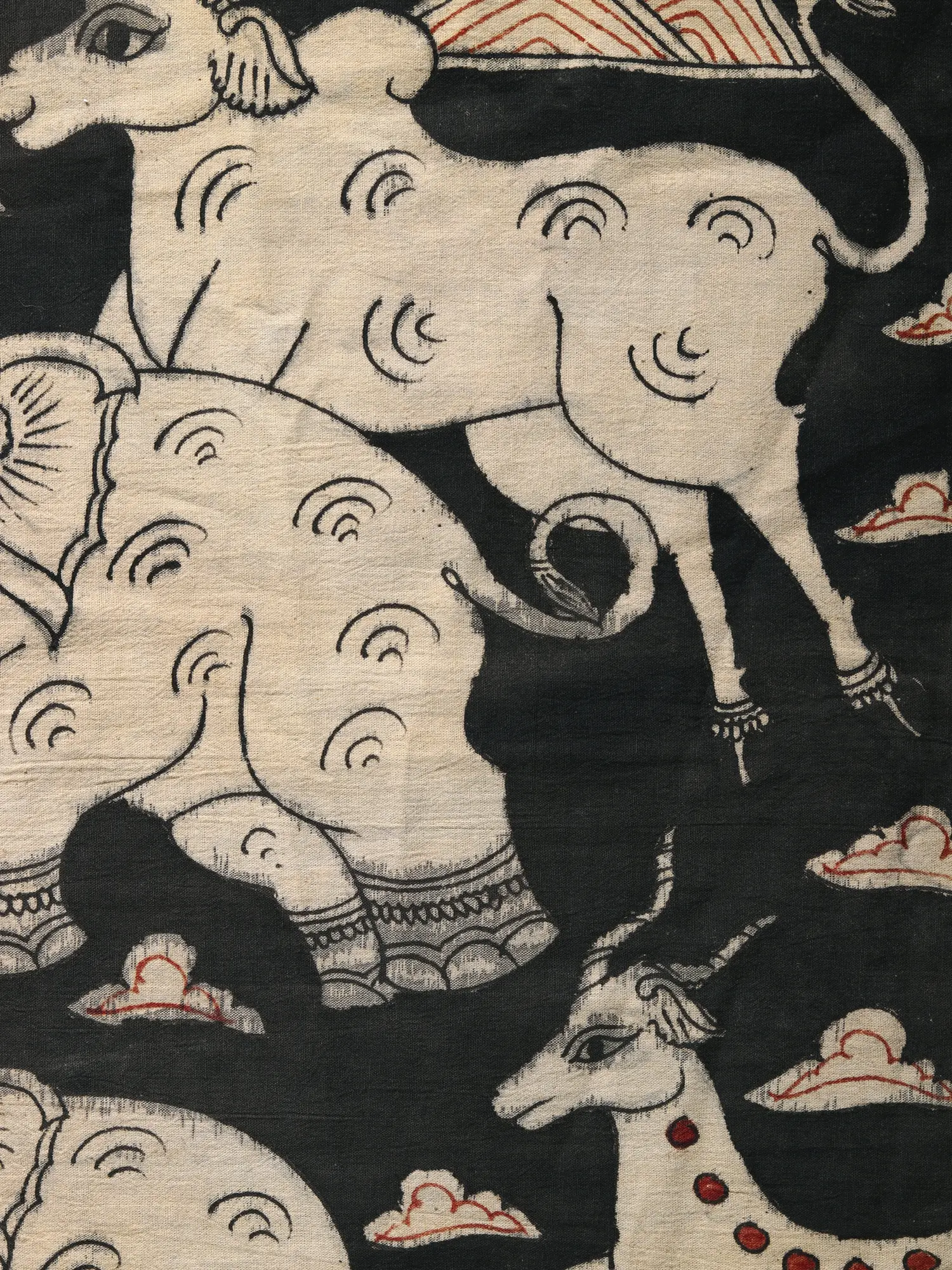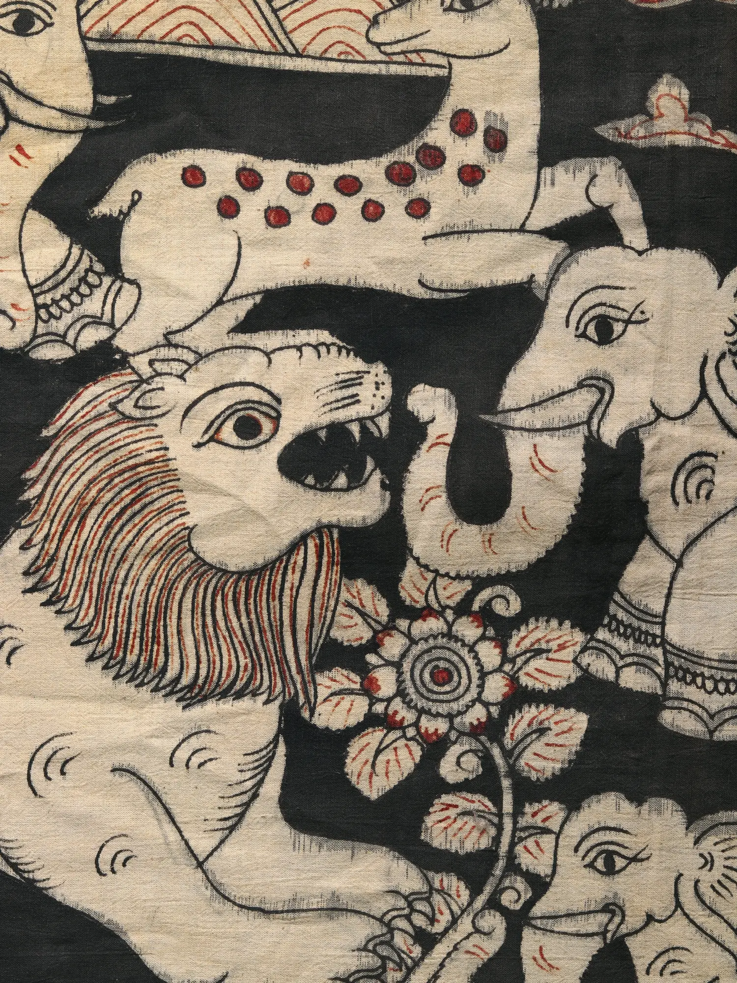 The deliberate use of black enhances the stark contrast, allowing each creature and element to emerge vividly. This masterpiece not only captures the raw beauty of the wild but also showcases the prowess of Kalamkari in bringing the essence of nature to life with a bold and visually striking palette.