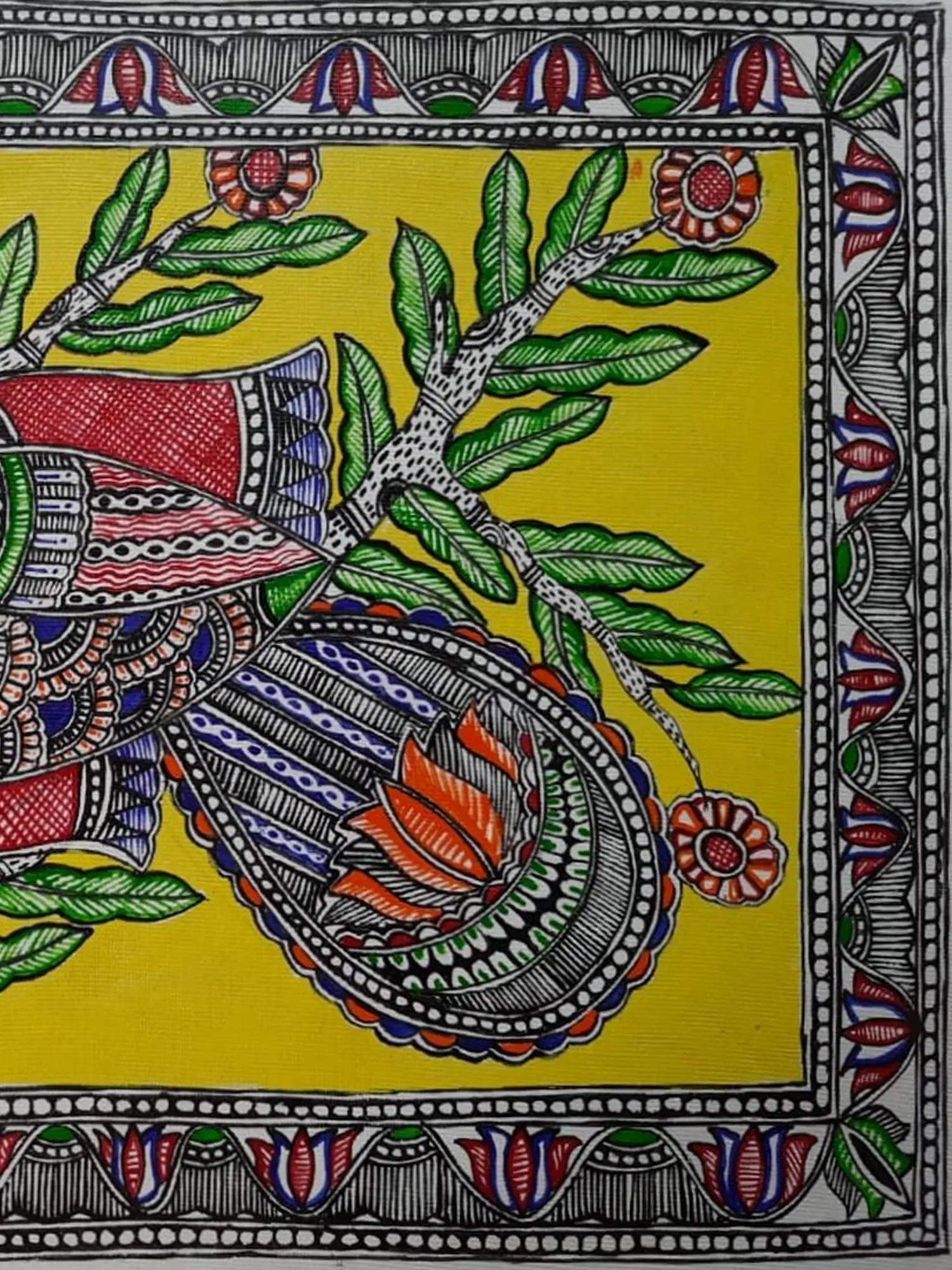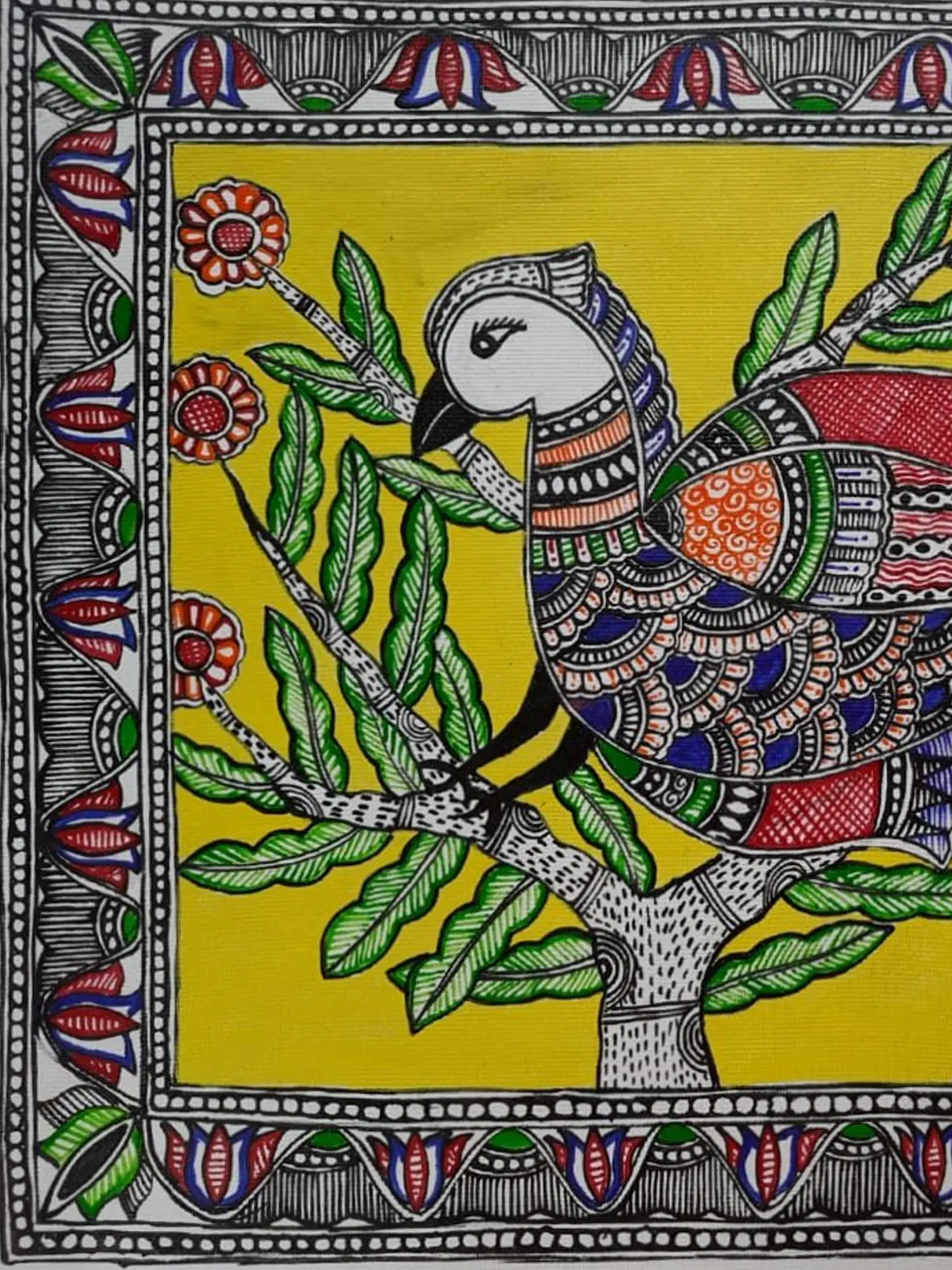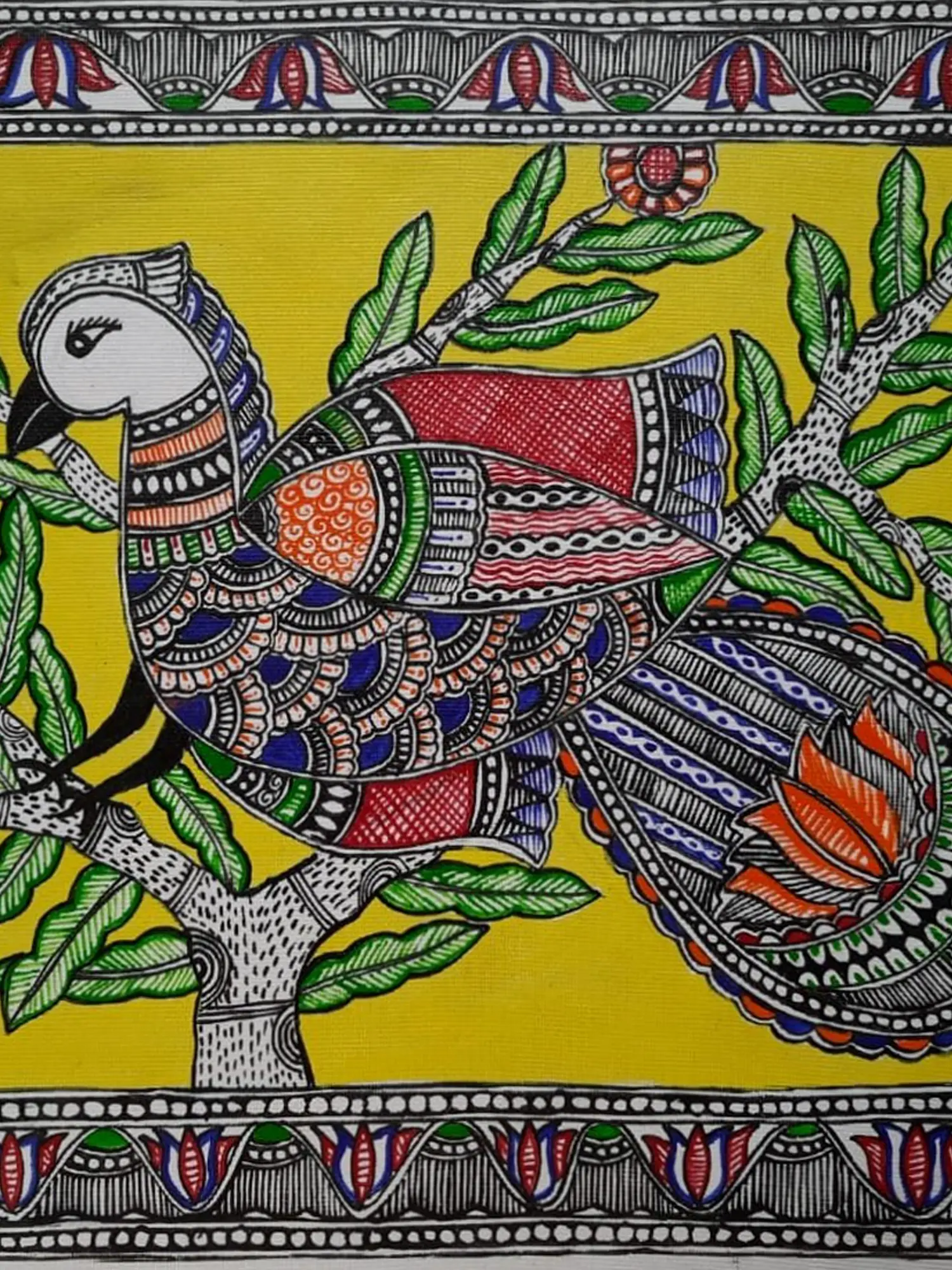 The focal point is a beautifully rendered bird, adorned with an exquisite array of patterns and colors, perched gracefully on a stylized tree branch. Lush green leaves and delicate floral motifs frame the central subject, all set against a radiant yellow background that amplifies the vibrancy. A meticulously detailed border, featuring traditional geometric and floral elements, encircles the artwork, adding a polished and refined finish. This creation measures 12 inches in height and 15 inches in width, offering a substantial yet versatile presence.