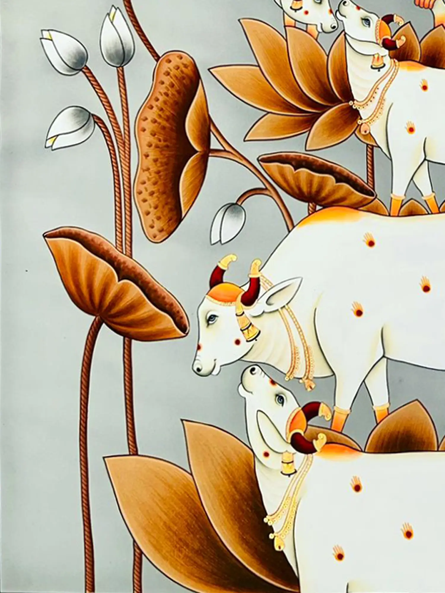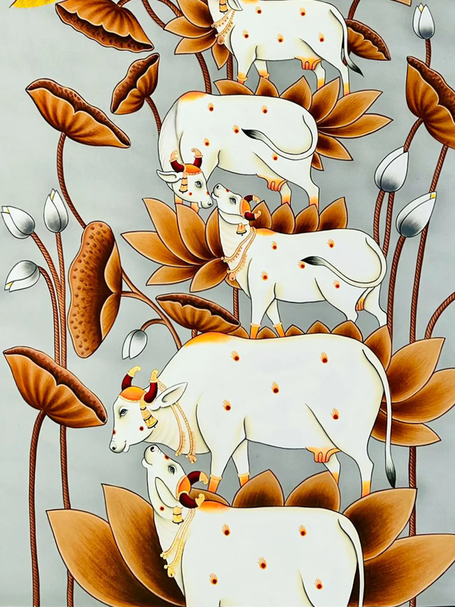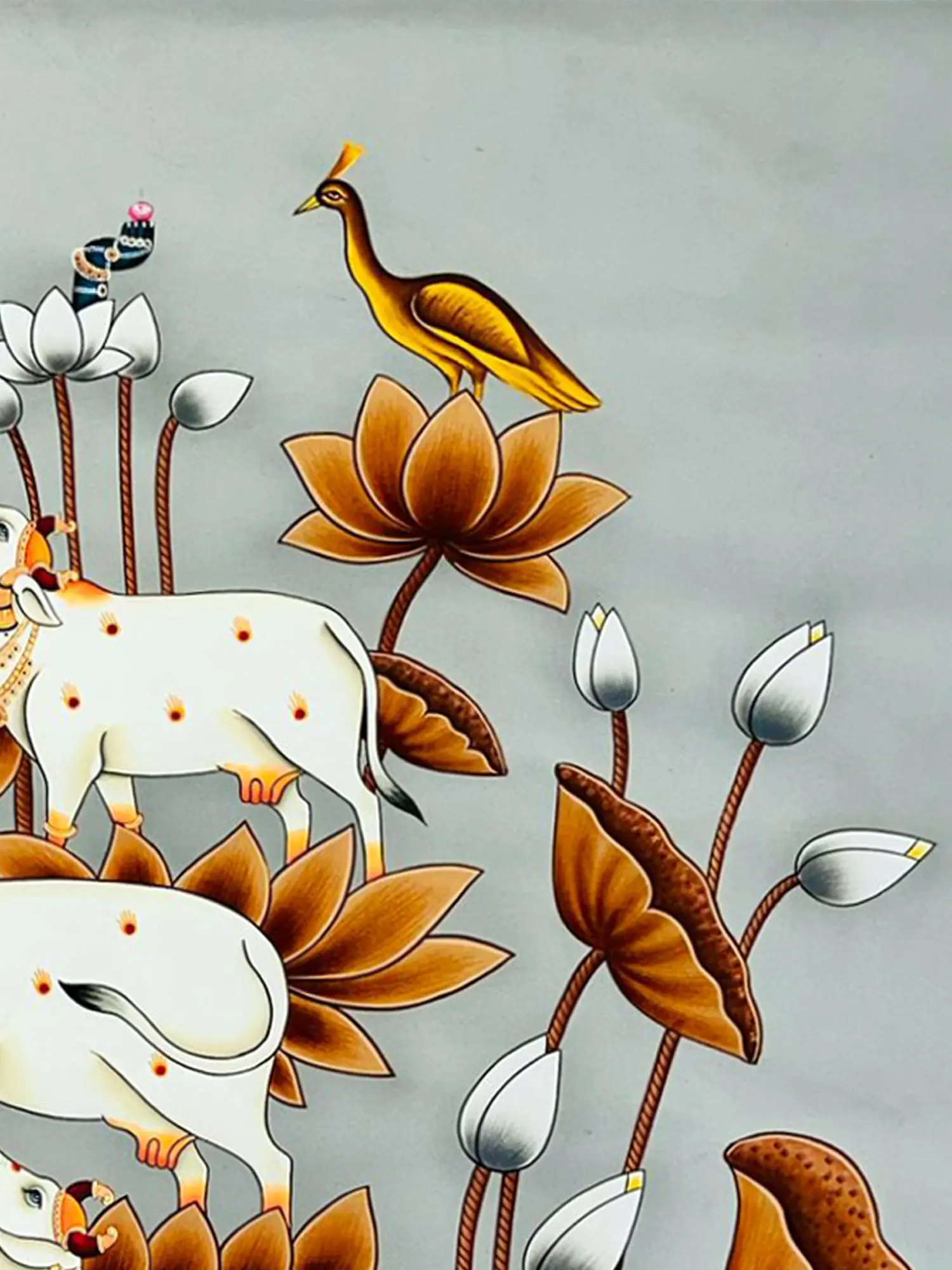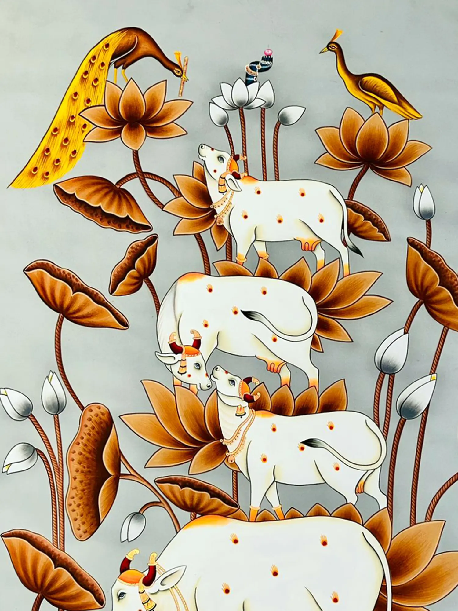 Gaze upon the striking presence of serene cows, their forms rendered with an ethereal grace against a backdrop of blooming lotuses. Observe the majestic peacock, its plumage a cascade of golden iridescence, perched with an air of regal composure. The composition, spanning an impressive 48 inches in height and 36 inches in width, commands attention while maintaining an exquisite delicacy. Notice the intricate adornments on the cows and the subtle yet impactful detailing on the birds, each element contributing to a harmonious visual symphony.