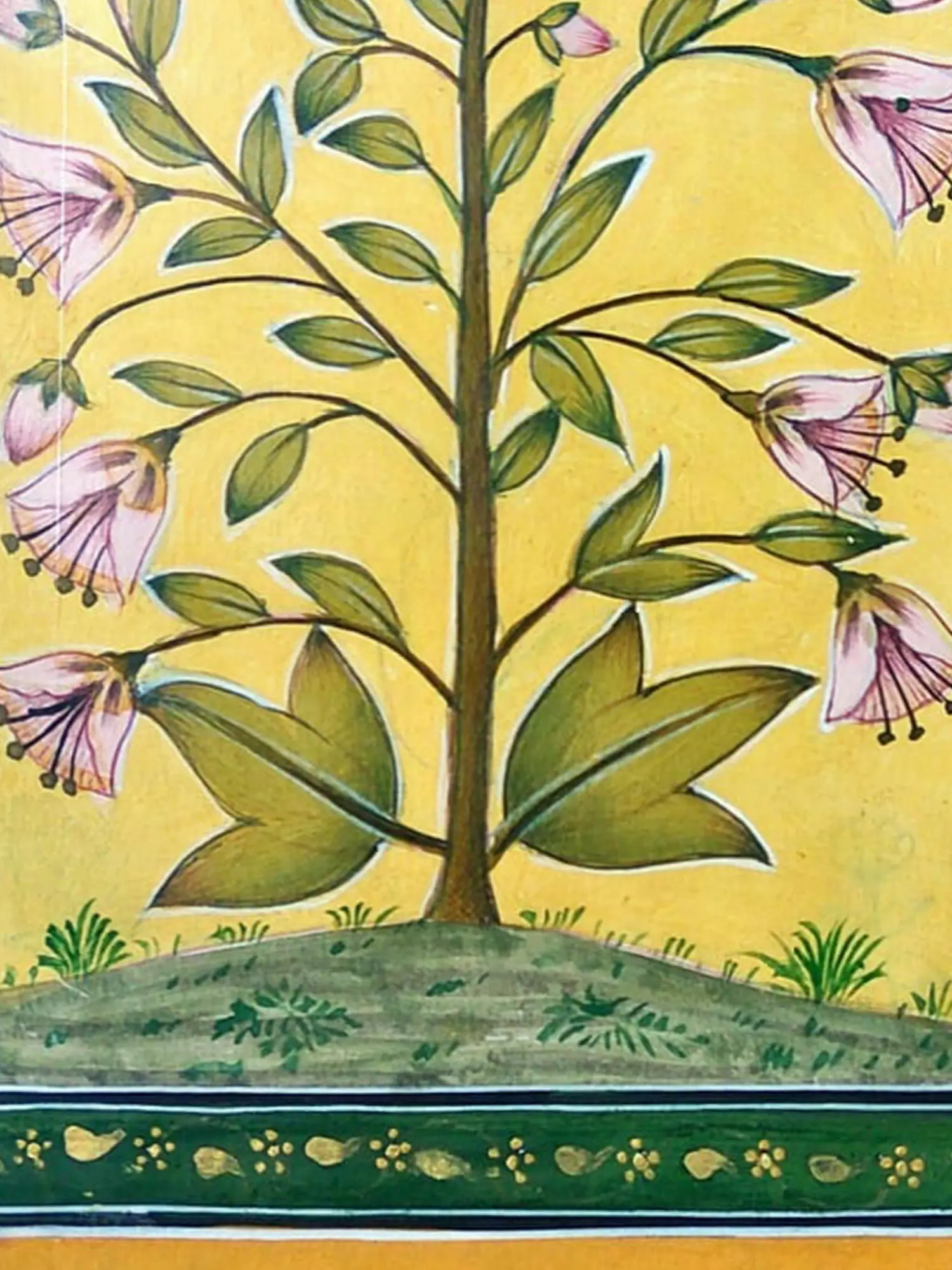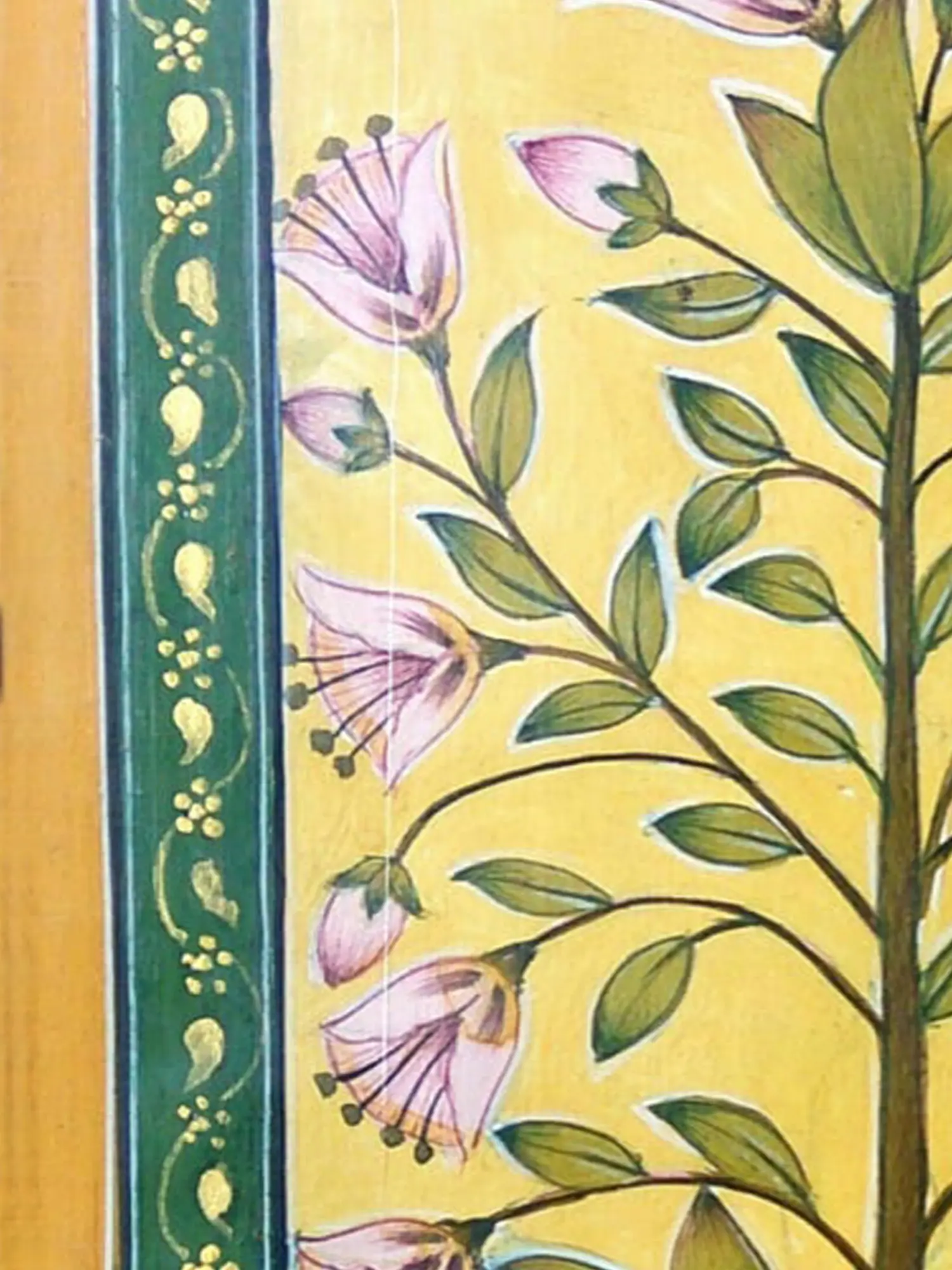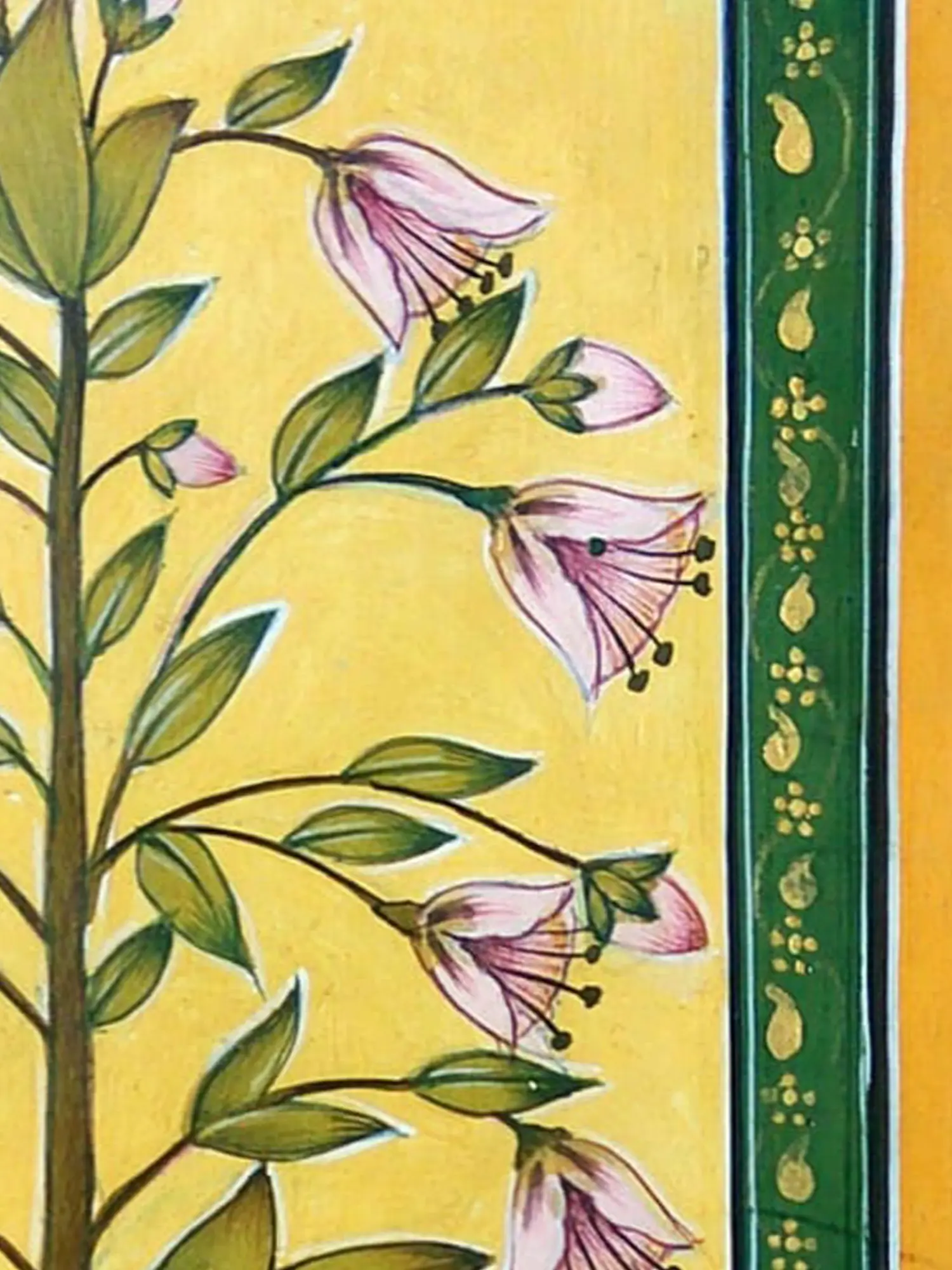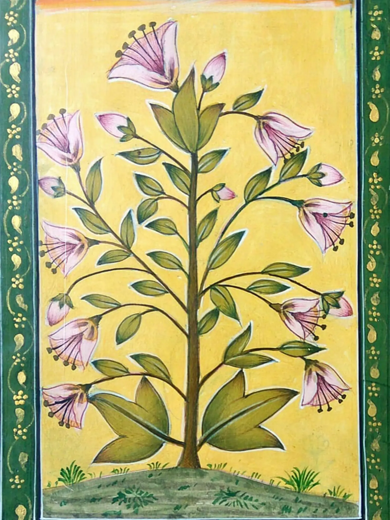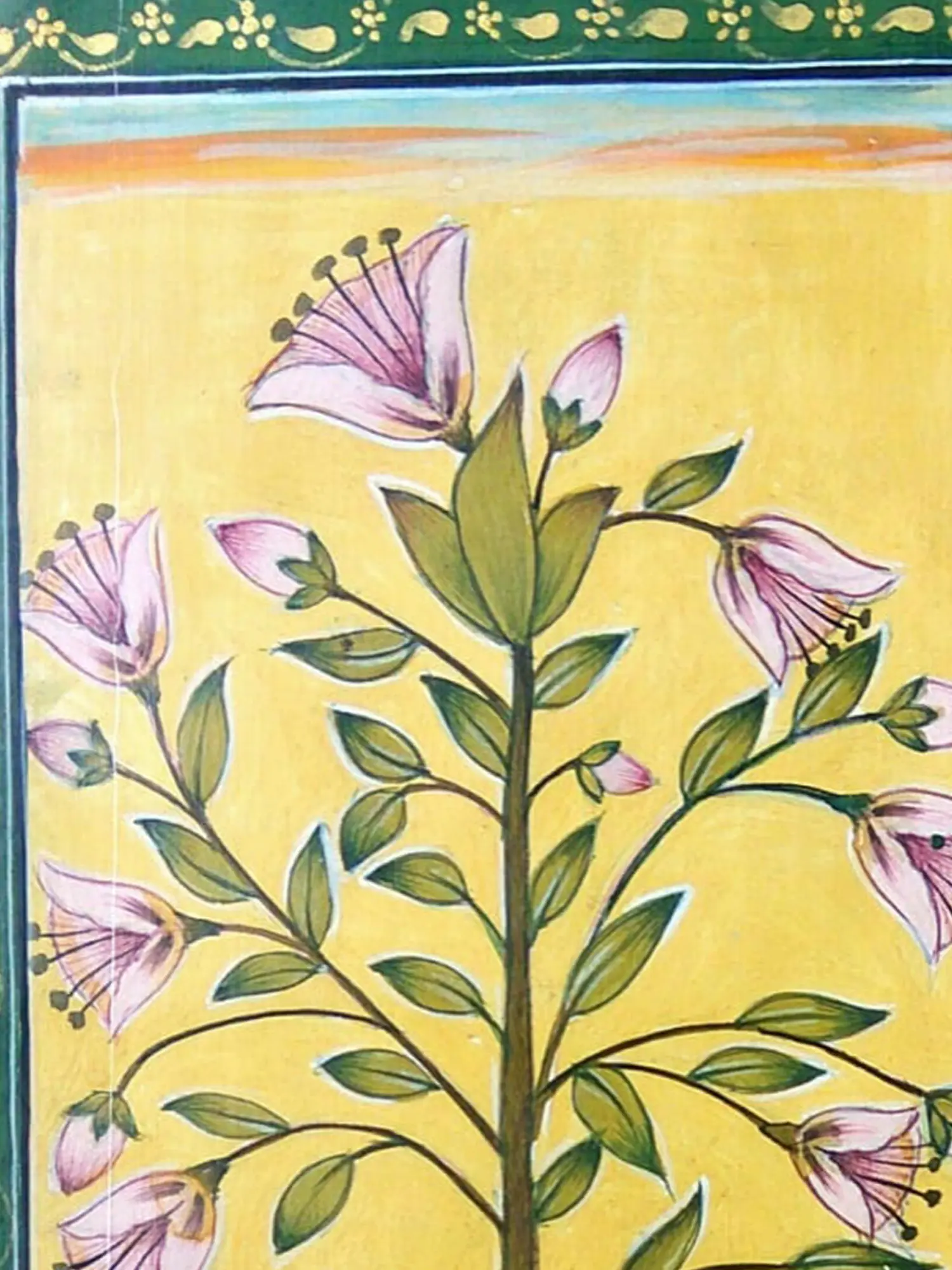 Observe the harmonious composition, where a central branch bursts forth with gracefully rendered flowers, their soft pink petals unfurling against a vibrant, sun-kissed yellow backdrop. The artist’s skilled hand is evident in the subtle shading and the precise rendering of each leaf and bud, creating a sense of lively growth. Encased within a decorative border of deep green adorned with gold motifs, the central imagery is thoughtfully framed, enhancing its visual appeal and lending a refined finished look.