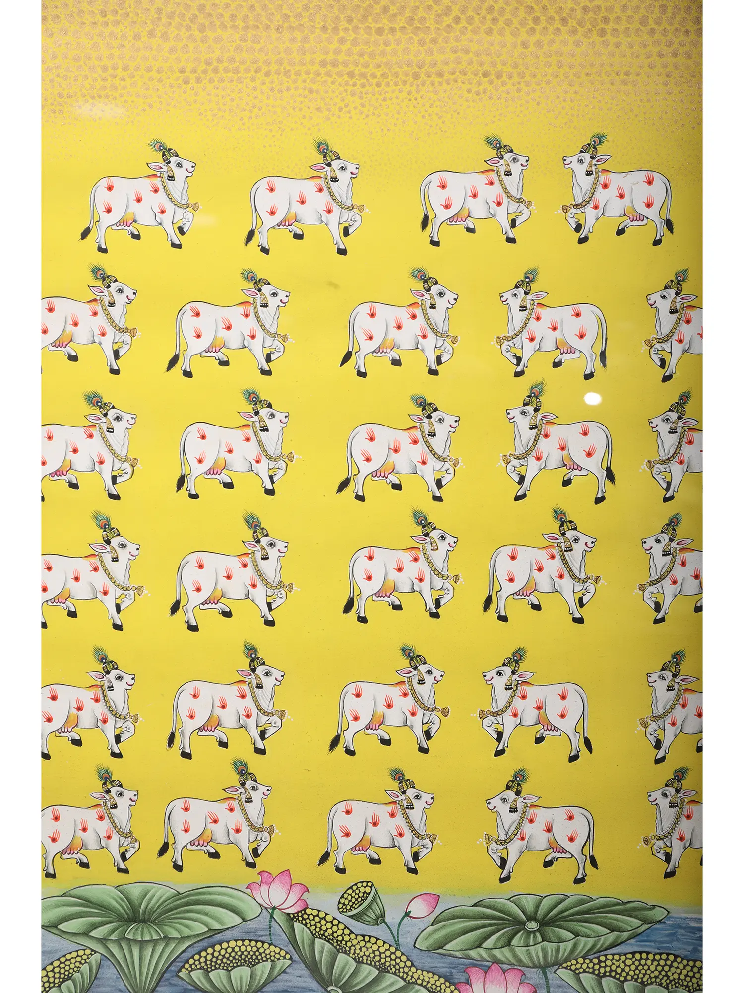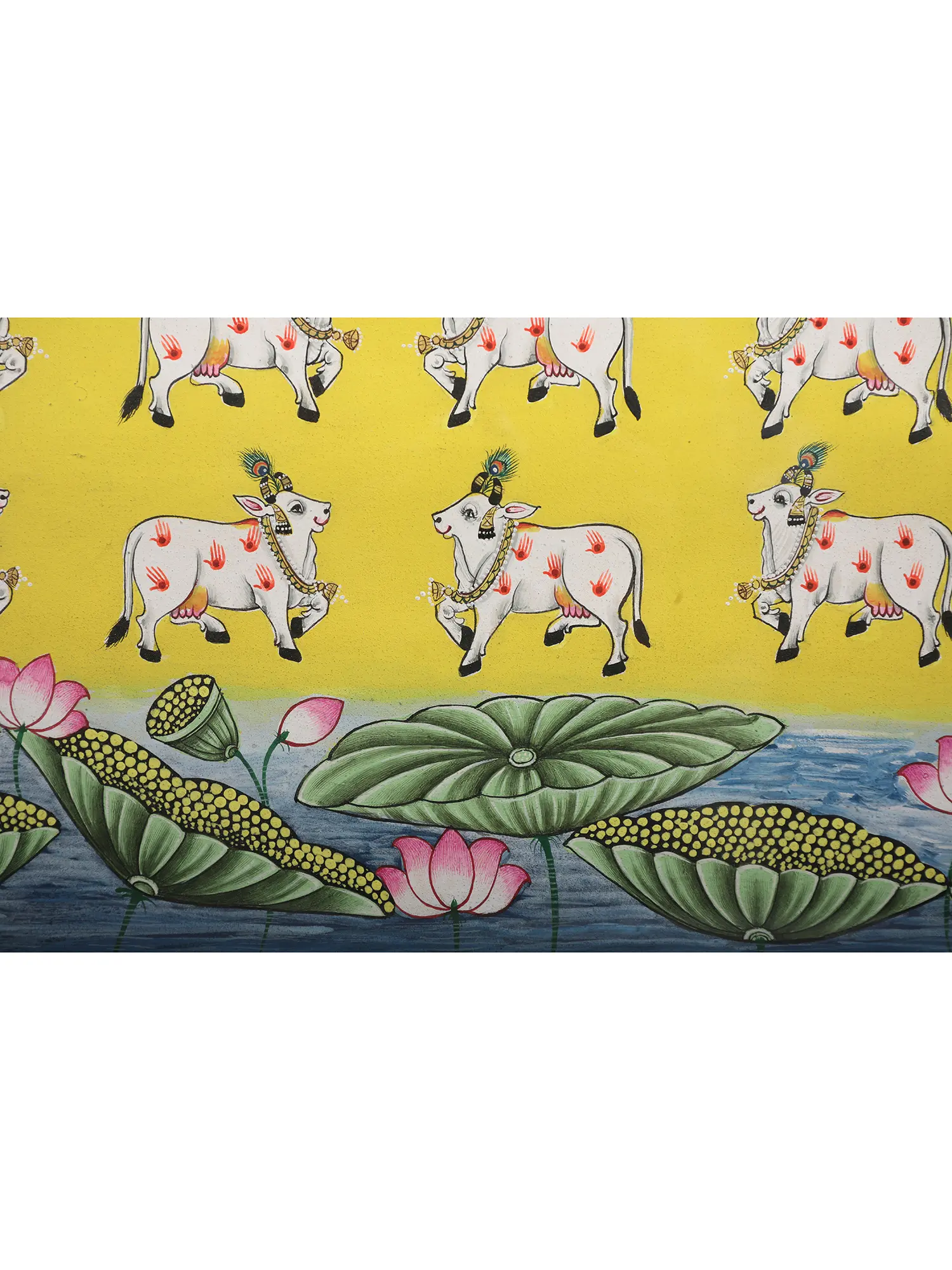 The "Kamal Talai With Cows" Pichwai is painted on high-quality cotton silk using natural colors. This ensures the painting's longevity and vibrant hues while staying true to the traditional techniques of Pichwai artistry. The meticulous detailing of the cows and the lotus flowers showcase the artist's exceptional skill and patience, with every element meticulously crafted to capture the essence of the subject matter. The 31.5-inch by 31.5-inch dimension of the framed artwork makes it a perfect addition to any living room or sacred space, serving as a visual focal point that evokes feelings of peace, tranquility, and reverence. The painting arrives framed in a dark wood frame, enhancing its visual appeal and protecting it from damage. This piece is not merely a painting; it is a tangible representation of faith, tradition, and the artistic heritage of Rajasthan.