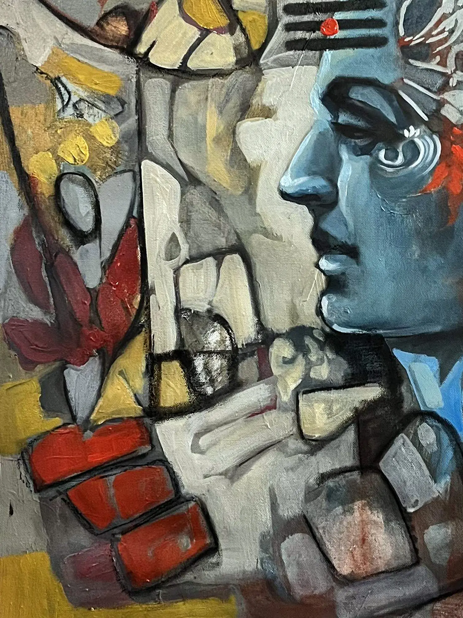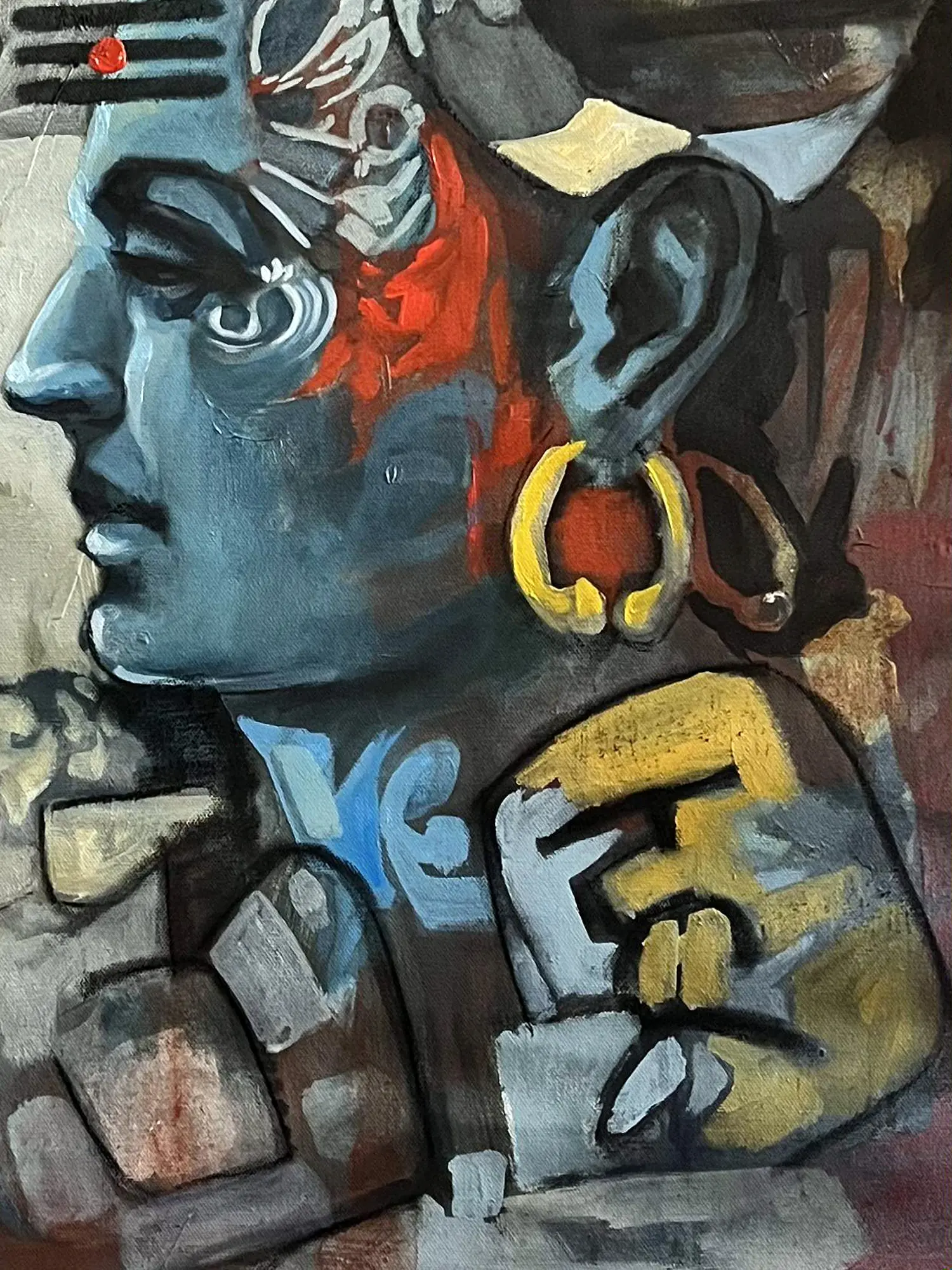 Measuring a substantial 30 inches in height and 24 inches in width, this artwork commands attention without overpowering its surroundings. The compelling use of color and form creates a dynamic yet balanced composition, drawing your eye across the canvas to discover new details with each viewing. The striking blue hue of the central figure is juxtaposed with earthy tones and sharp geometric shapes, evoking both the ethereal and the grounded.
