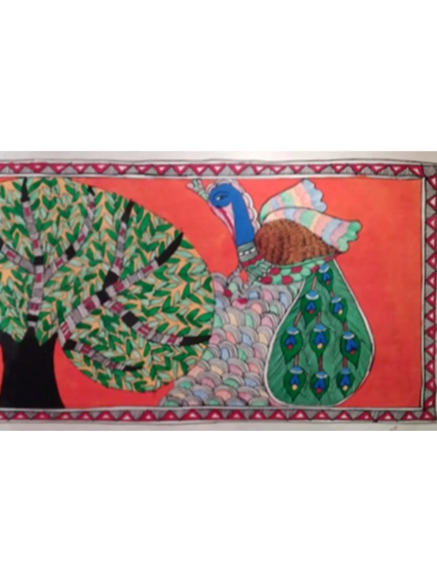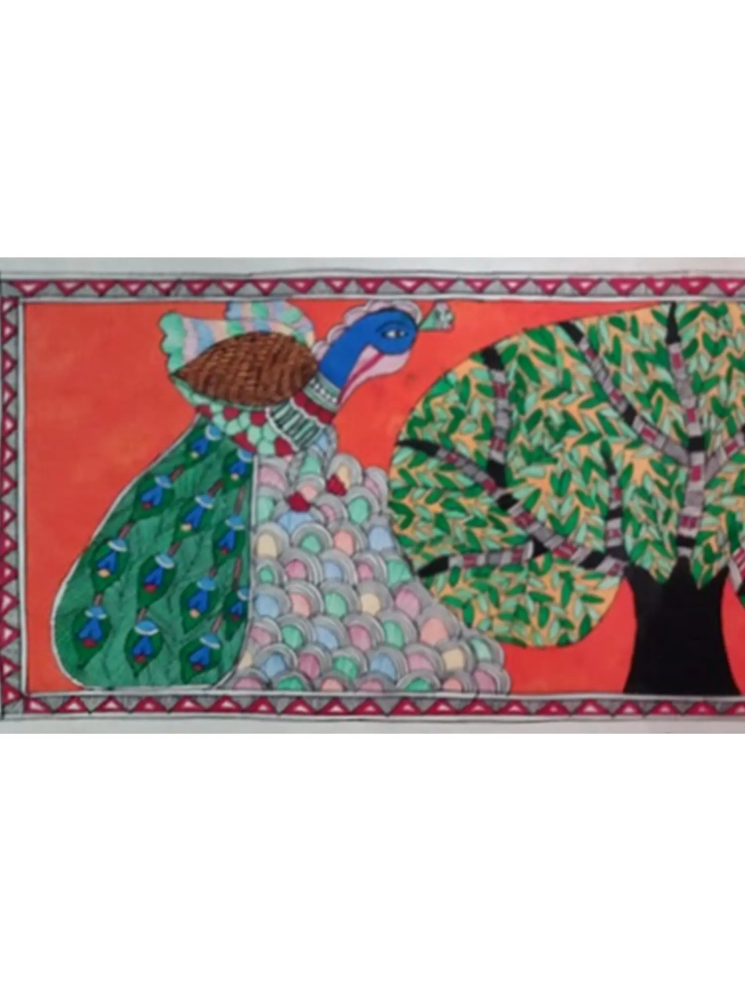 Archana Jha's Madhubani masterpiece features two resplendent peacocks flanking a majestic tree, a symbol of natural harmony and divine beauty. The peacocks, adorned with vibrant plumage, exude elegance and grace, while the tree stands as a silent witness to their magnificence. Through intricate patterns and vivid colors, Jha captures the essence of life's intricate dance, where the beauty of nature intertwines with the spiritual realm.
