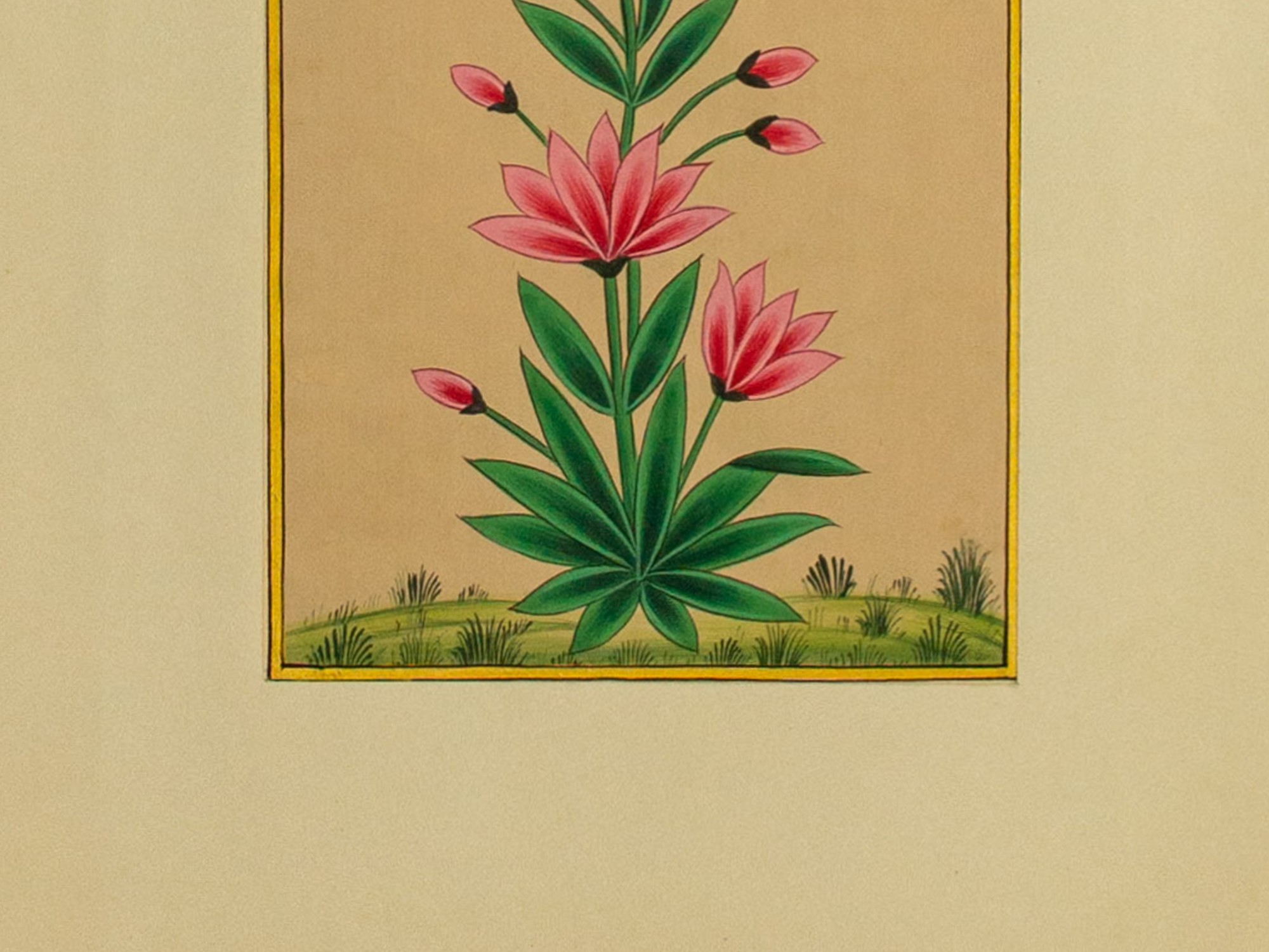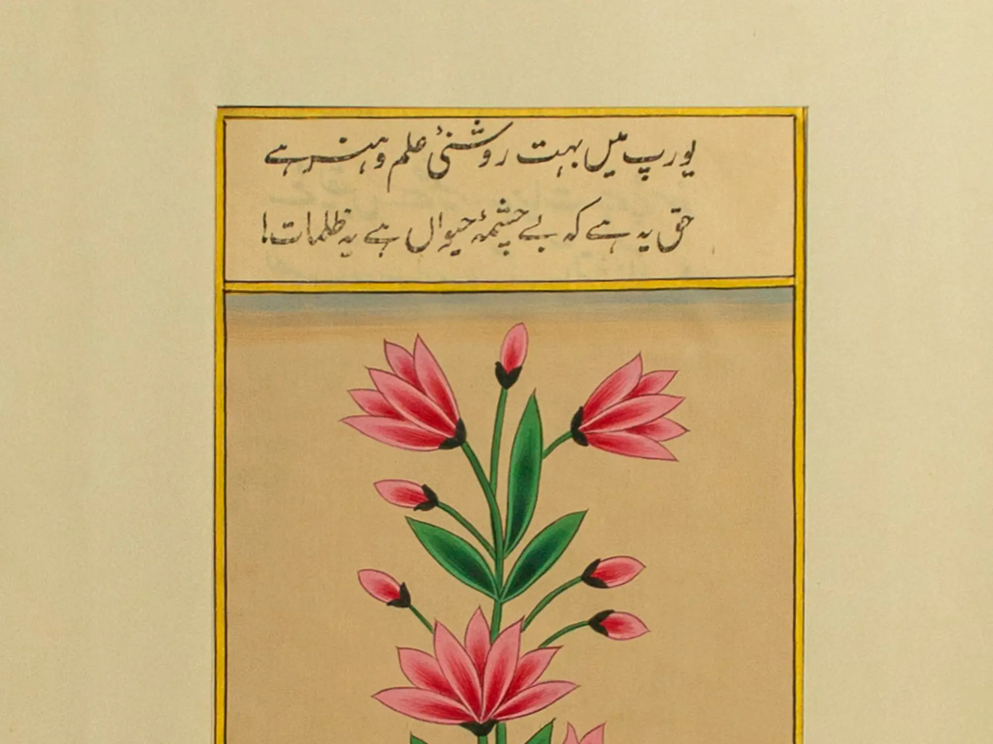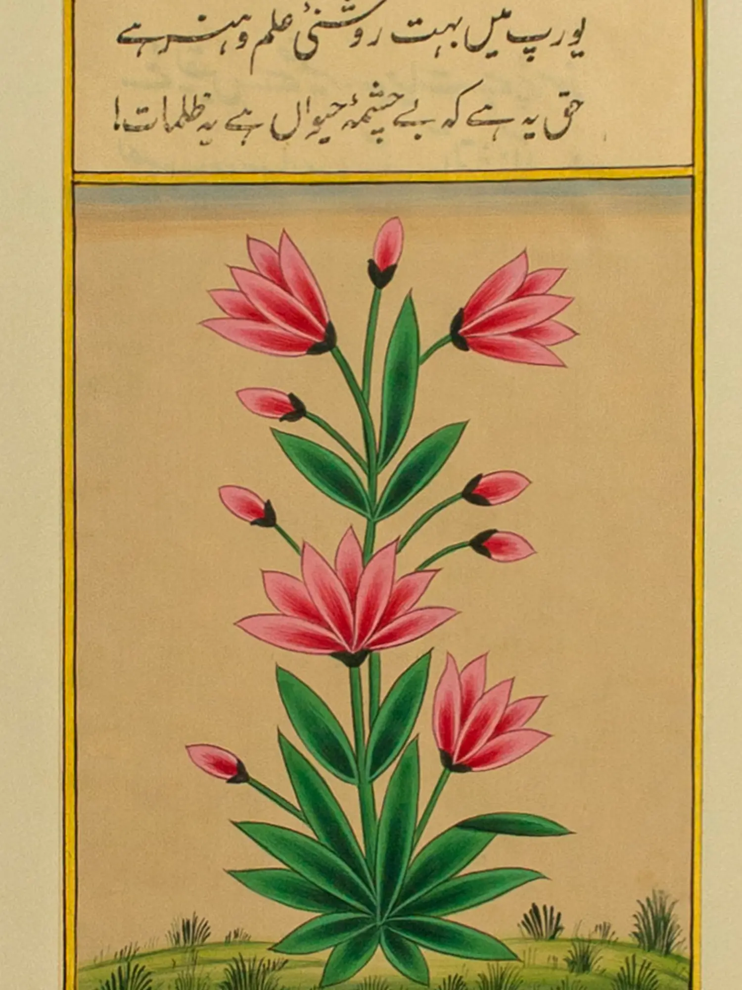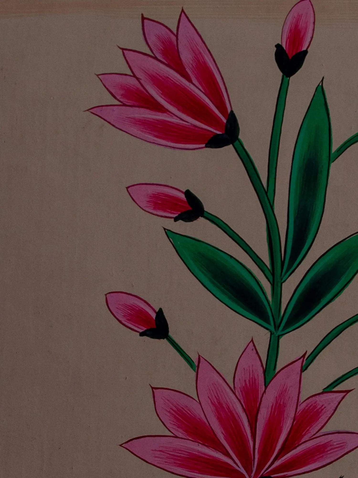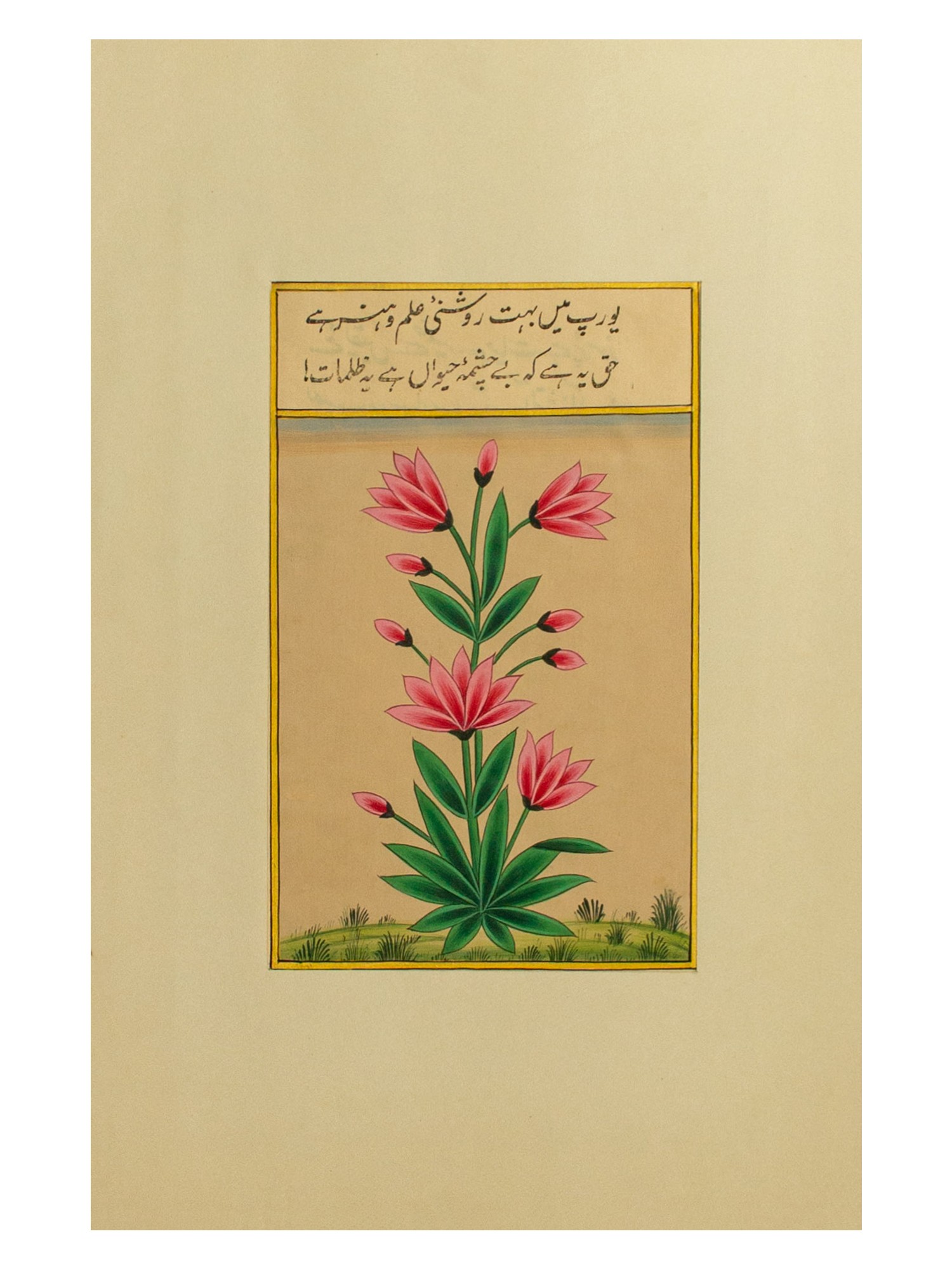Transport yourself to the grandeur of Mughal art with this gorgeous piece of art with persian calligraphy executed in natural stone colours on paper. The artist's mastery in Mughal-style painting is evident in the delicate portrayal of pink blooms, adorned with simple yet rich patterns. This artwork not only adds a touch of regality to your space but also serves as a homage to the rich artistic heritage of the Mughal era.