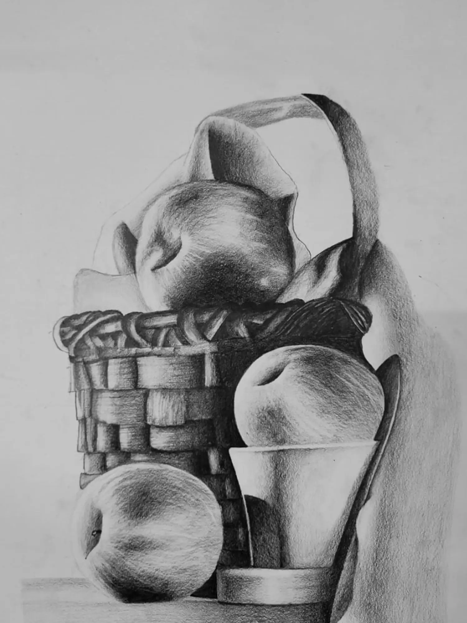 This drawing invites contemplation, rendered in the timeless medium of graphite on paper. The artist, Suman Das, demonstrates mastery of shading and form. The subjects are carefully arranged, inviting the viewer to pause and appreciate the quiet beauty of the everyday. The careful rendering of light and shadow across the basket and the rounded fruit evokes a sense of tangible reality. The textures are subtly conveyed, from the woven structure of the basket to the smooth surfaces of the fruit. The drapery adds a touch of elegance to the otherwise simple composition. The artwork's classic monochrome palette adds to its overall effect, allowing you to appreciate the composition and subtle nuances of the artwork.