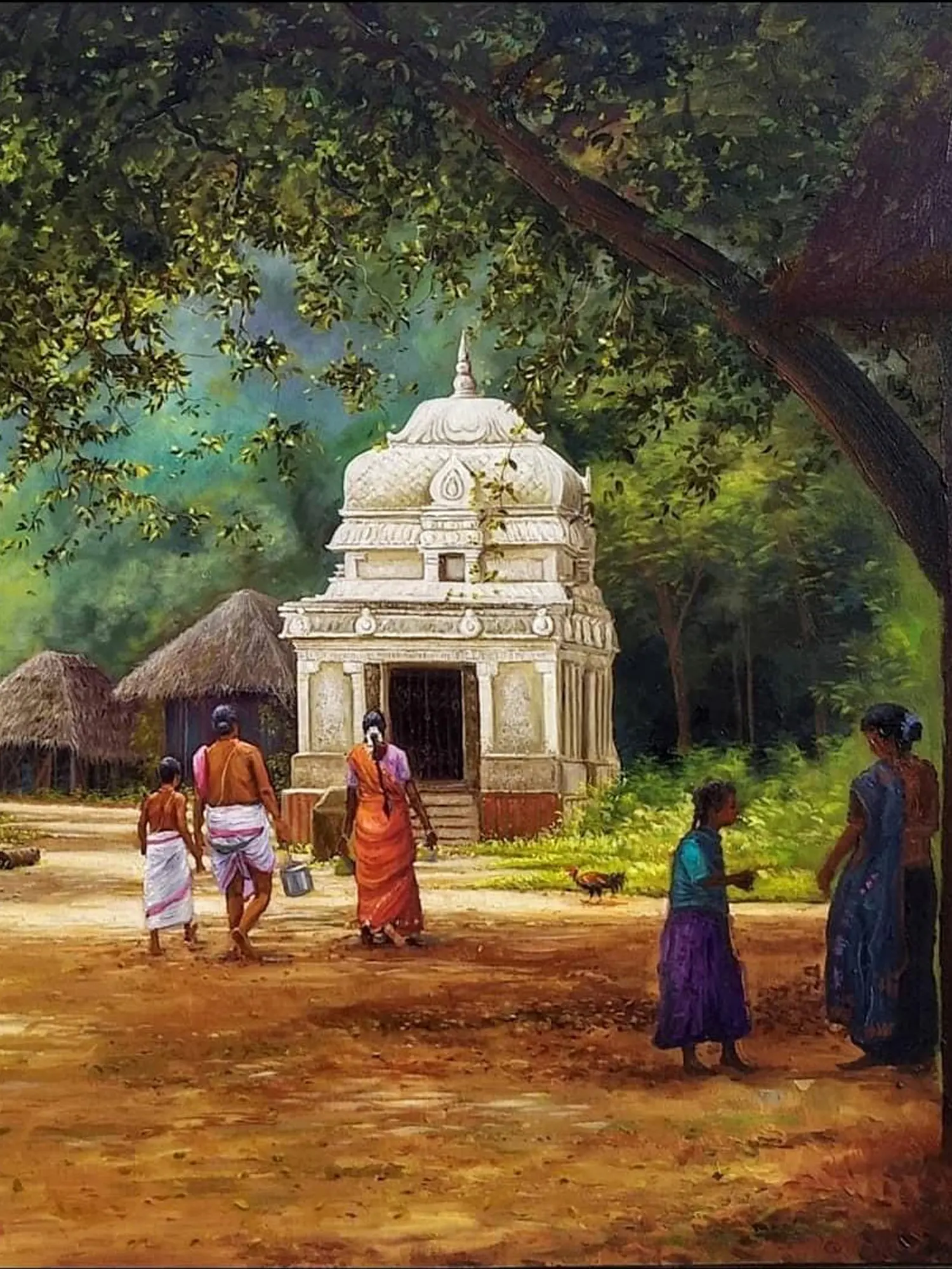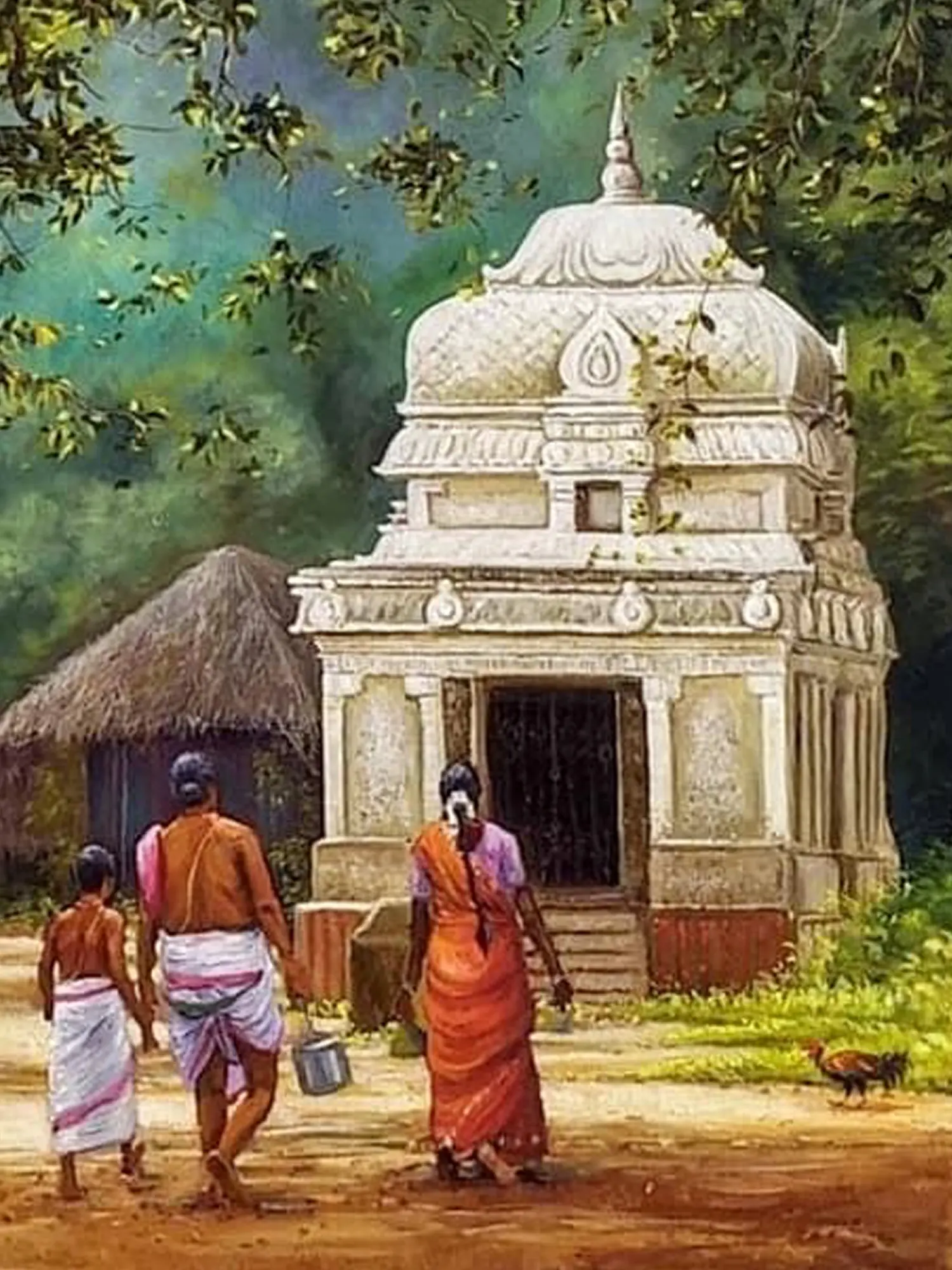 This portrayal of a village temple evokes a deep connection to cultural heritage and spiritual devotion. The architectural style suggests ancient traditions, hinting at a lineage of faith passed down through generations. The presence of villagers, seemingly engaged in their daily routines or approaching the sacred space, speaks to the integral role of such spiritual centers in community life. It is a visual ode to timeless customs and the enduring power of belief.