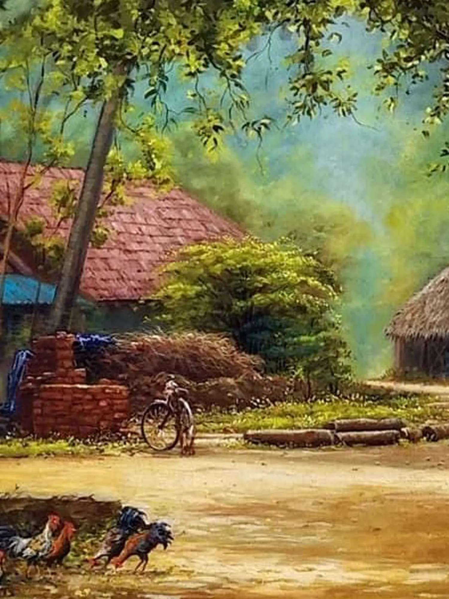 Experience a moment of serene contemplation and the quiet hum of village life, captured with breathtaking realism. You'll be transported to a timeless scene, where faith and community intertwine amidst the embrace of nature's verdant beauty. This masterpiece invites you to pause and reflect on the simple yet profound rhythms of existence.