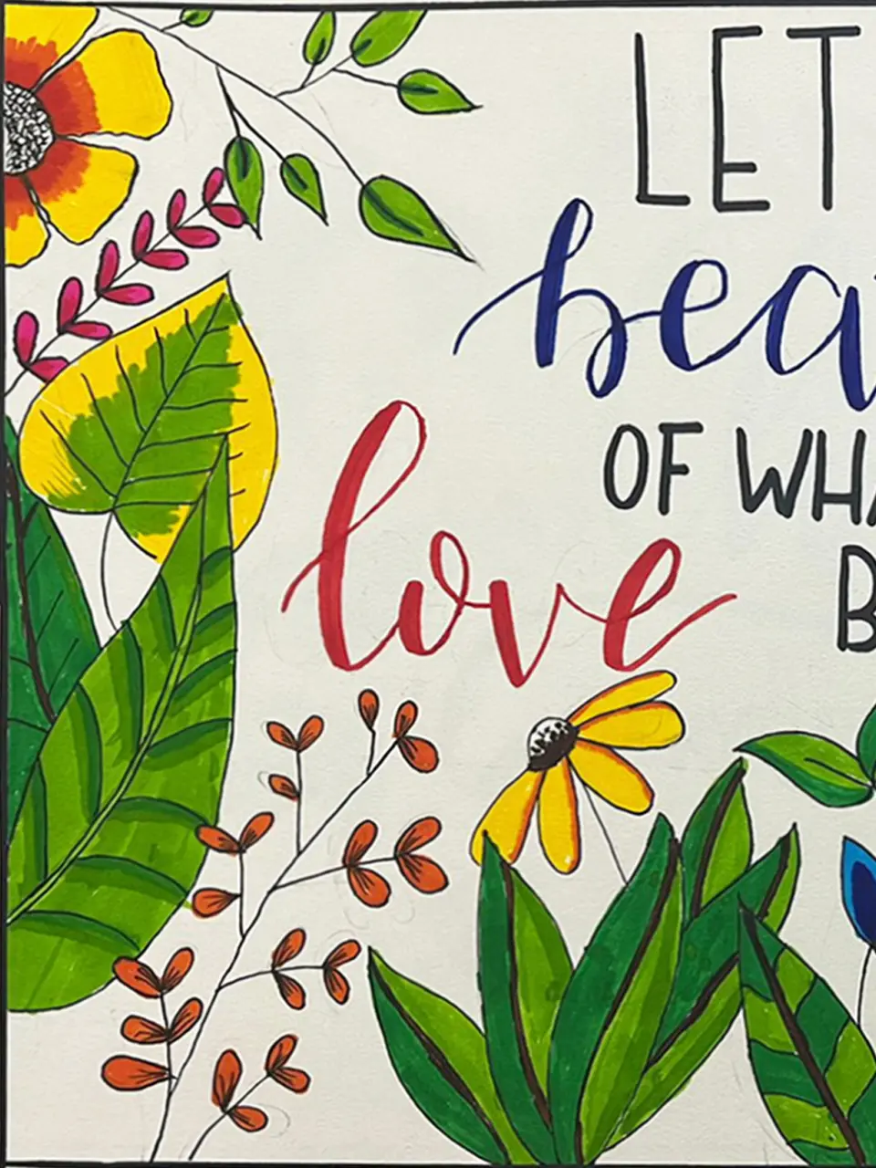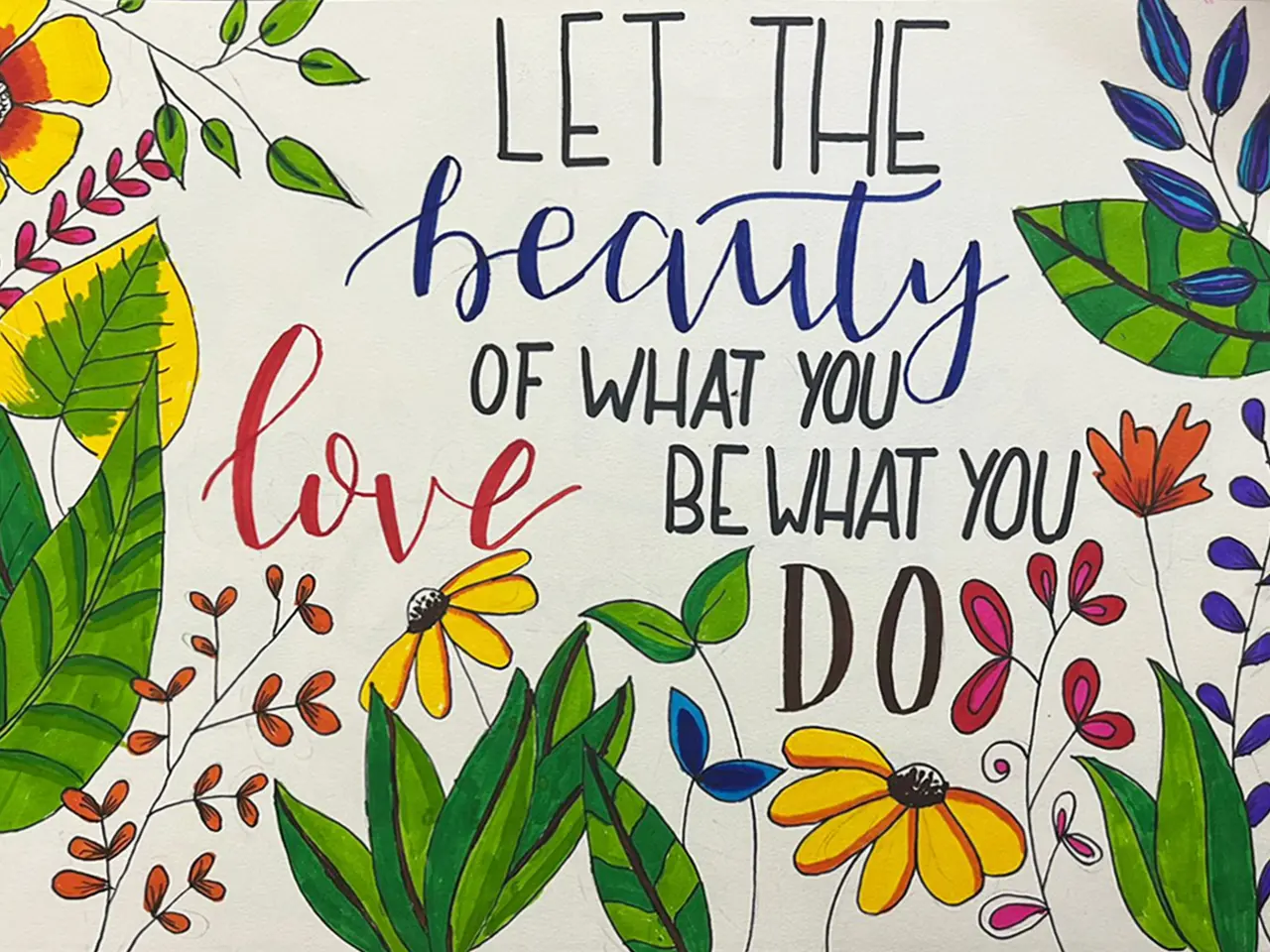The quote holds a lot of significance and encourages people to do their work with a feeling of love and excel in their field. The use of multiple colors to write the quote and draw the flowers around the frame brings a kaleidoscopic view. The framed presentation enhances the overall aesthetic, transforming it into a timeless piece.