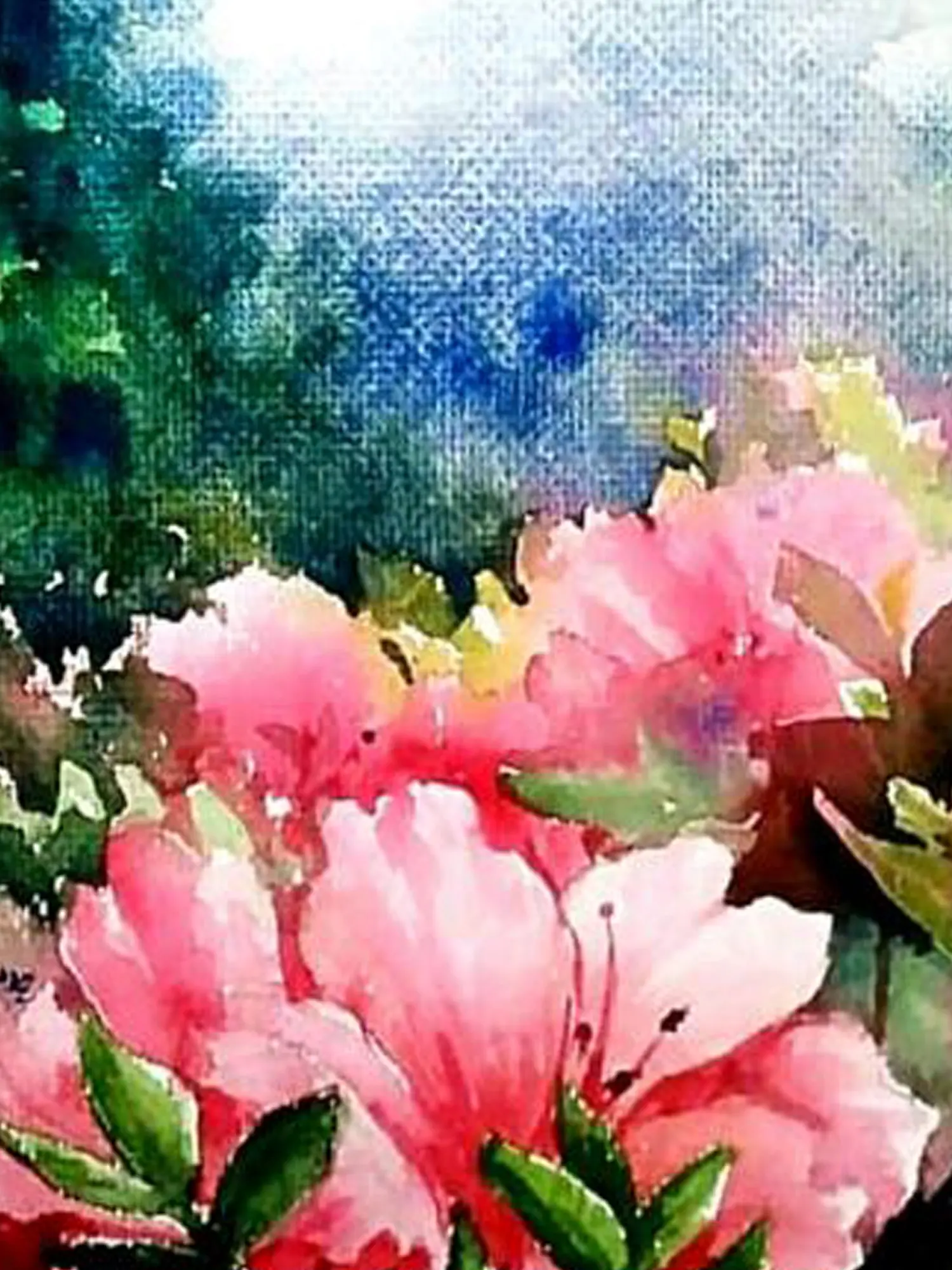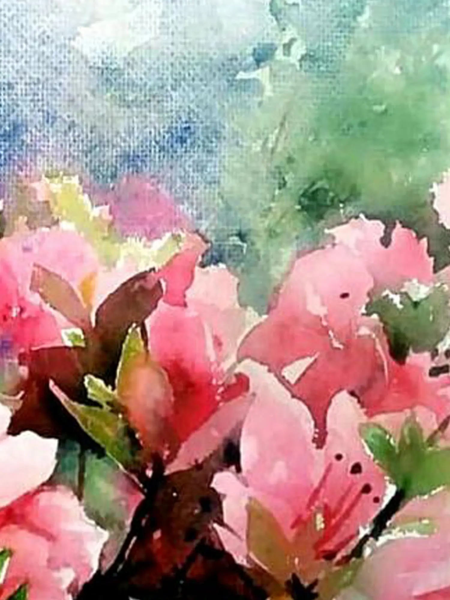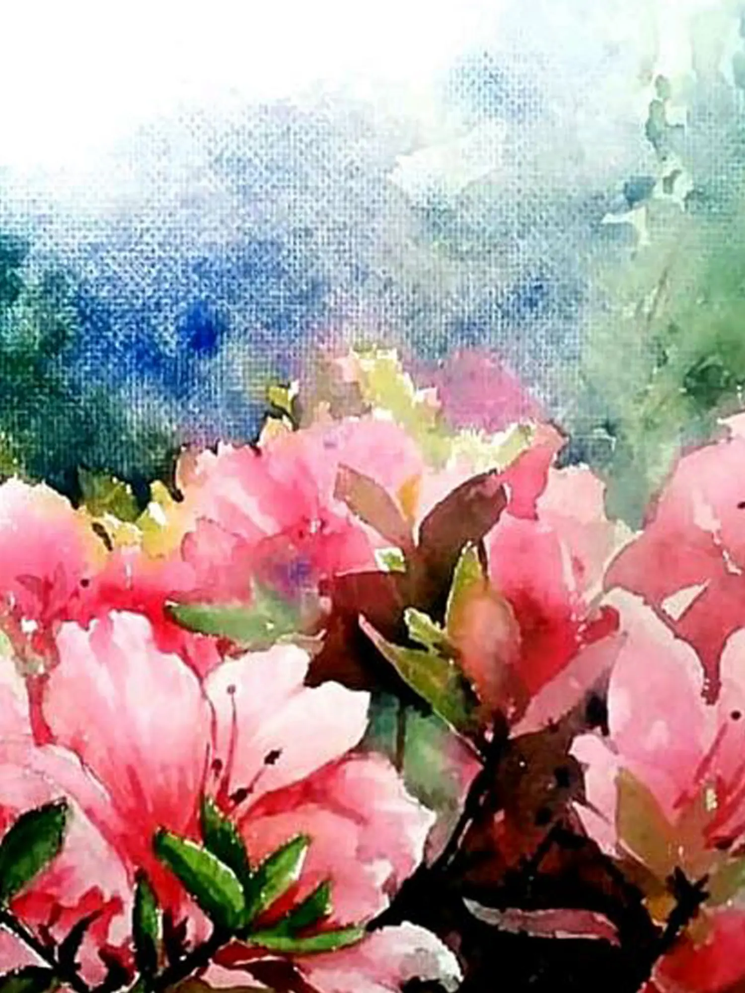 Cherry blossoms, with their ephemeral beauty, symbolize nature's transient grace. In Dipa Talukder's watercolor on paper, this fleeting allure is masterfully captured. The delicate pink blossoms gracefully blanket the lower portion, evoking the charm of springtime, while the ethereal light blue above adds a serene backdrop.