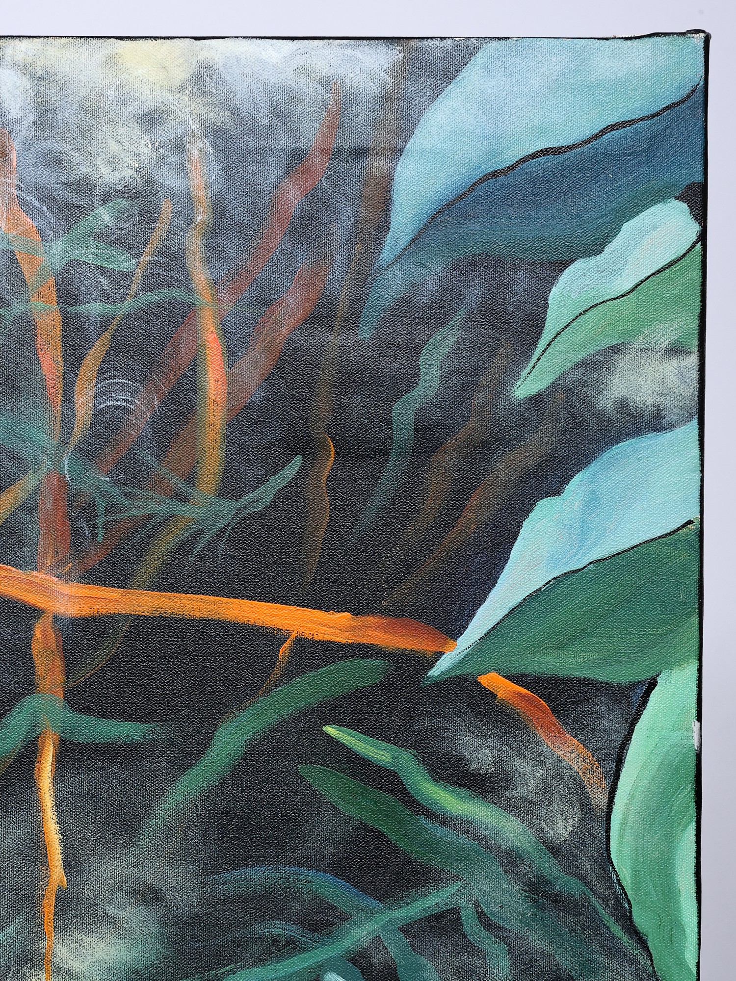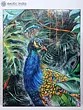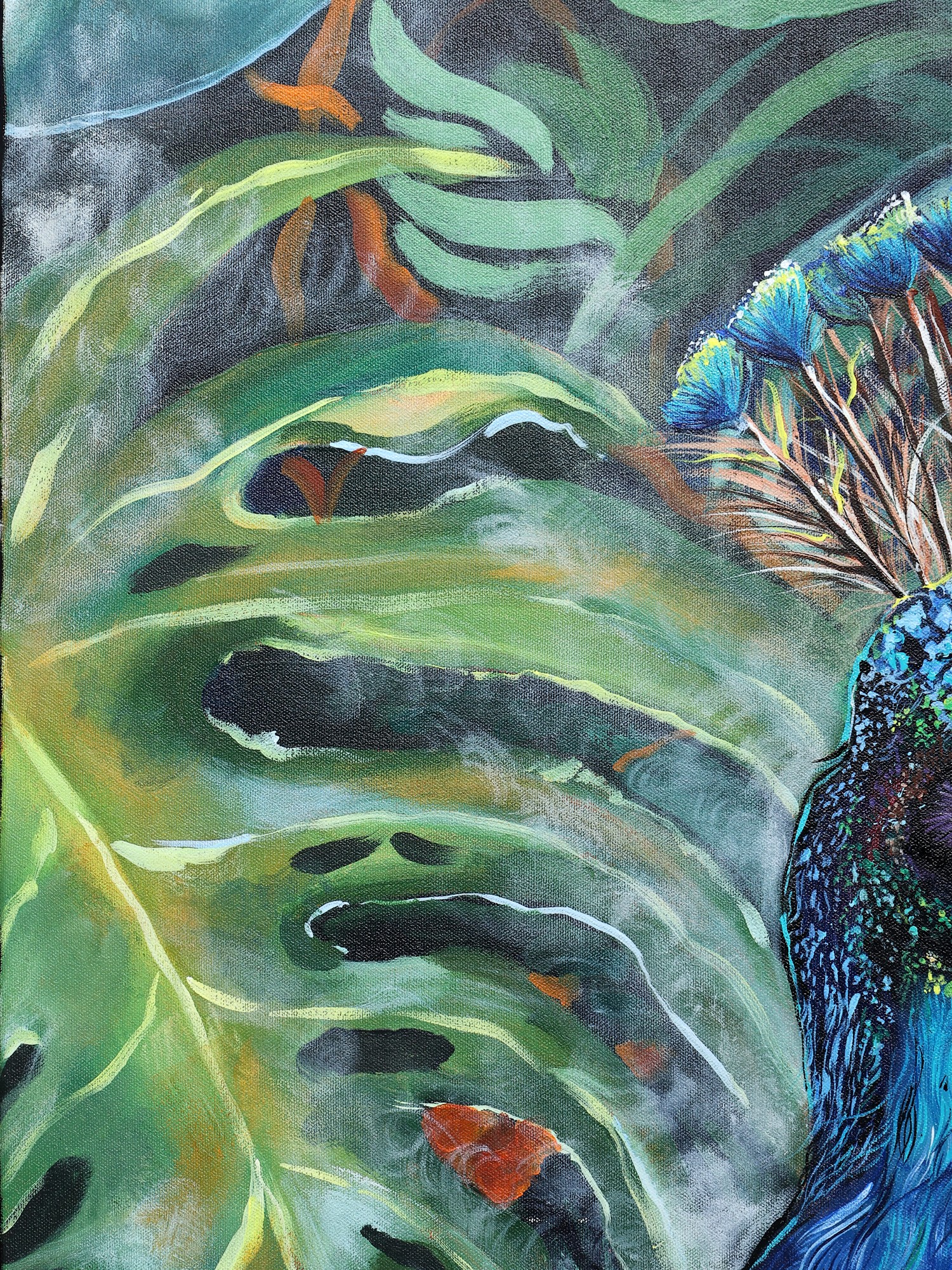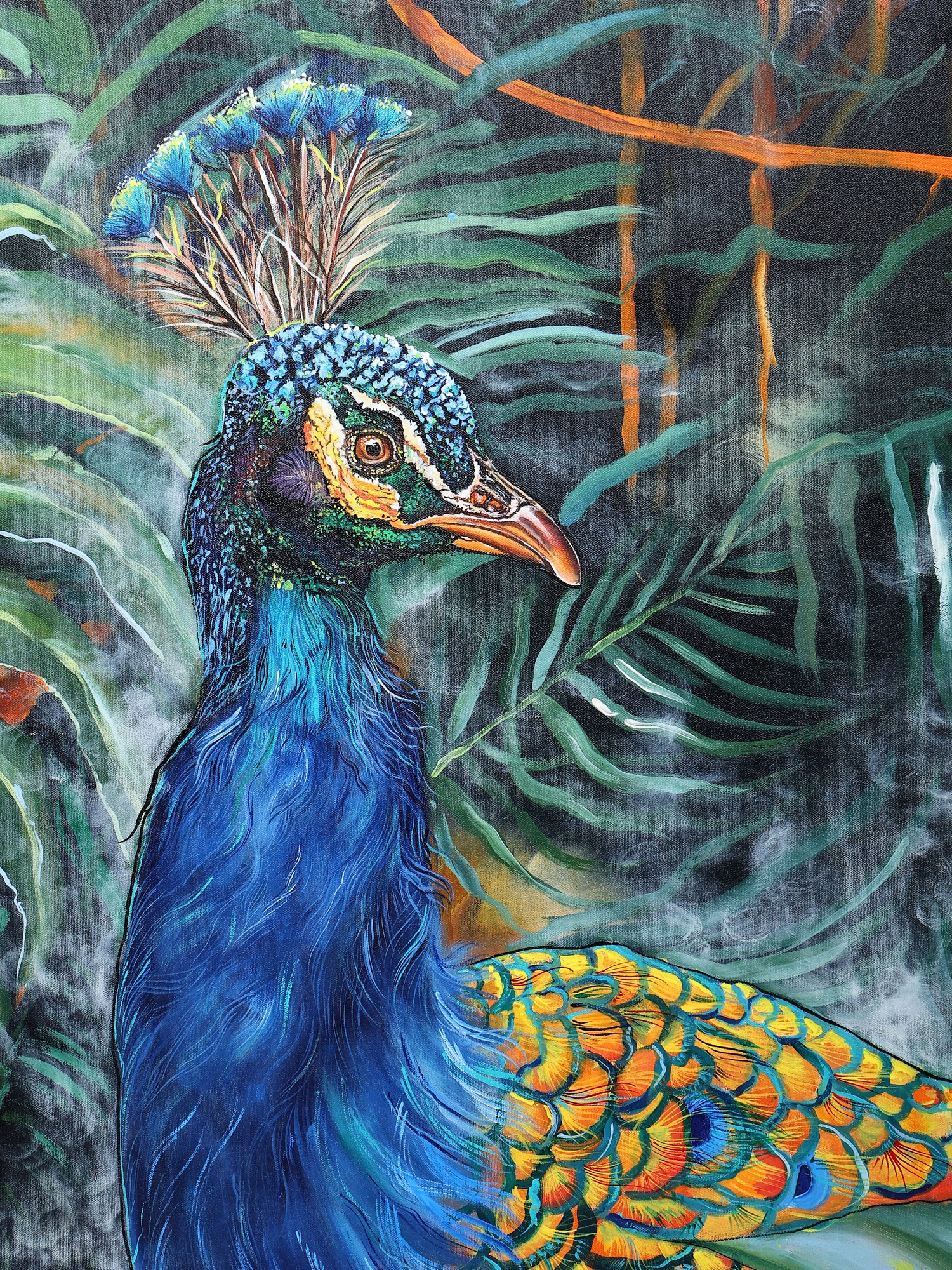 The artist has masterfully employed a rich palette to depict the peacock in its natural, verdant habitat. The deep blues and vibrant greens of the bird's neck and body transition seamlessly into the fiery oranges and blues of its tail feathers, creating a striking visual contrast. The textured application of acrylic paint adds depth and a tactile quality to the feathers, making them almost seem to shimmer. Surrounding the majestic bird is an abundance of lush foliage, painted with broad, expressive strokes. The varying shades of green, from deep emerald to lighter, almost translucent hues, suggest a dense, tropical environment, perhaps a hidden sanctuary where this avian jewel reigns supreme. The subtle use of mist or atmospheric haze in the background adds a sense of mystery and depth, drawing the viewer’s eye towards the central subject.