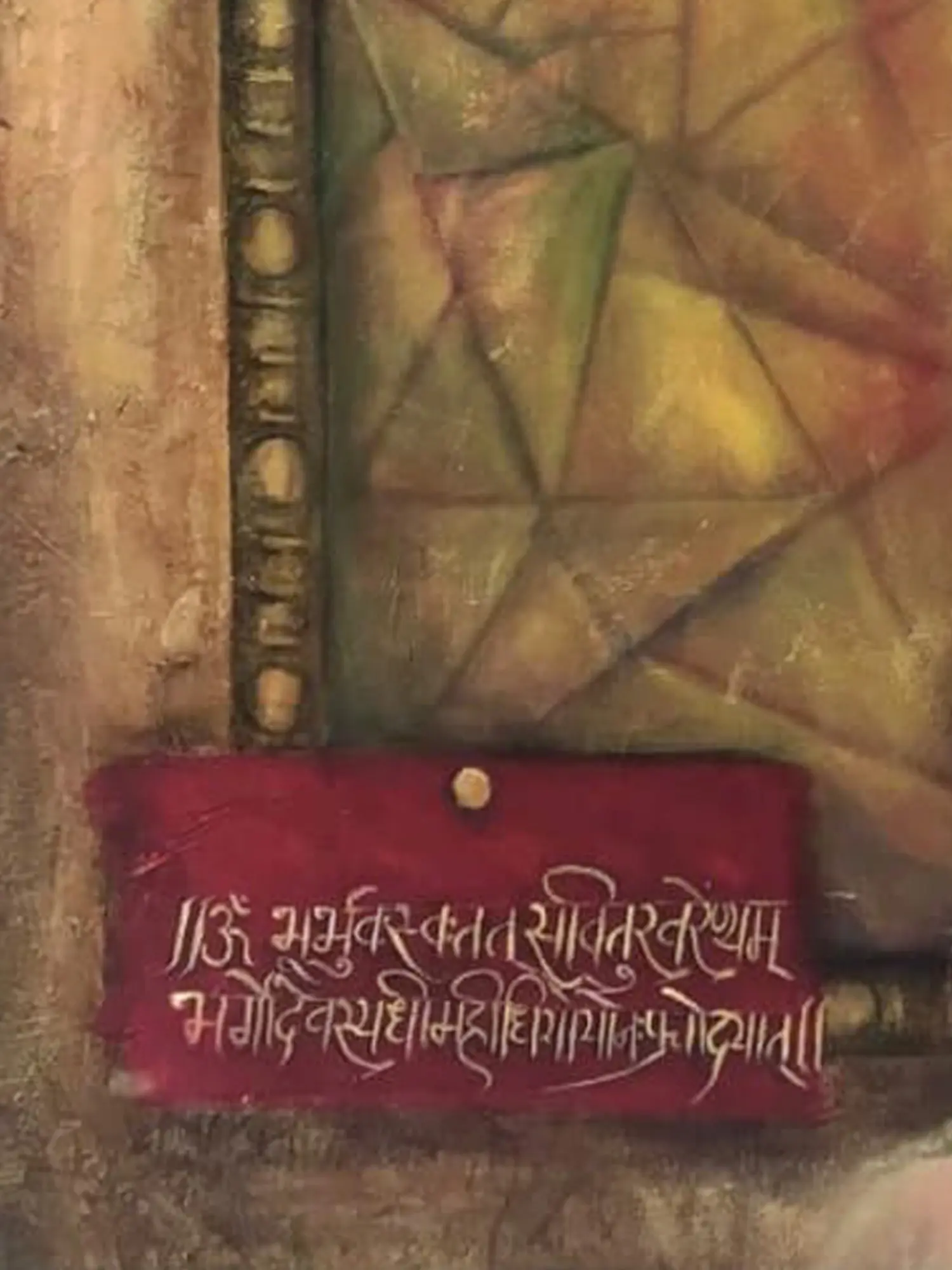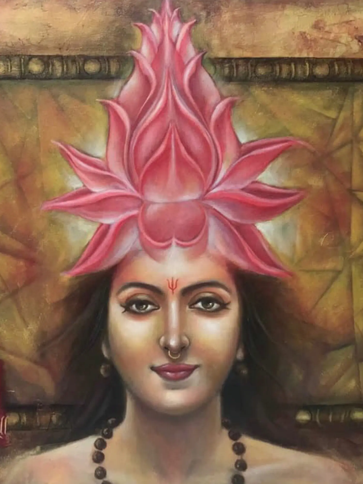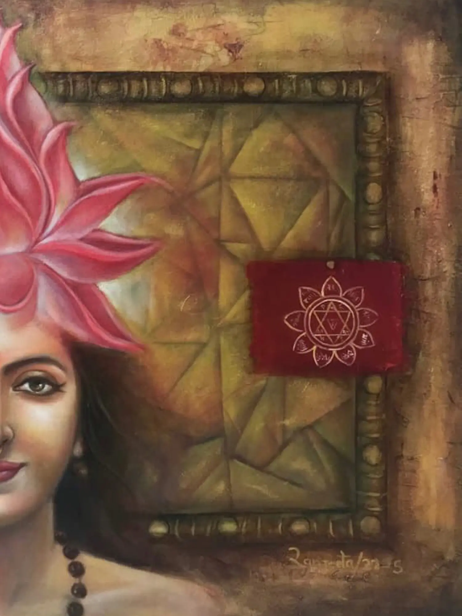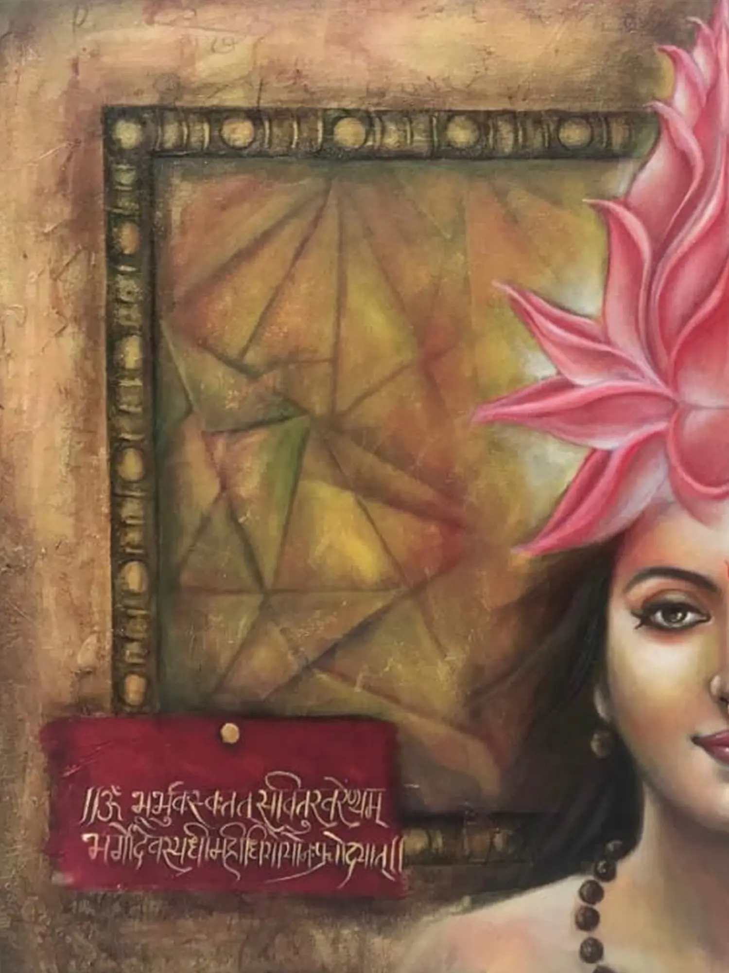 The artwork is imbued with rich symbolism. The lotus crown not only signifies spiritual awakening but also connects the subject to goddesses such as Lakshmi, the Hindu goddess of wealth, prosperity, and fortune, often depicted with a lotus in her hand or seated upon a lotus throne. The lotus is a symbol of beauty emerging from mud and represents the ability to rise above life's challenges to find enlightenment. The background's geometric patterns suggest a cosmic order, possibly hinting at the interconnectedness of all things within the universe. The inclusion of Sanskrit script adds another layer of depth, possibly containing mantras or verses that resonate with the painting's overall spiritual message. The red amulet-like object, with its geometric design, subtly hints at protective amulets used in various spiritual and cultural traditions to safeguard against negativity or bring good fortune.