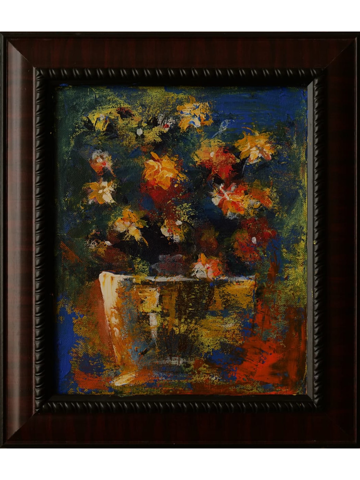 This unframed work, measuring a delightful 12 inches in height and 10 inches in width, presents a harmonious composition. The interplay of bold blues, radiant yellows, and passionate reds evokes a sense of dynamism and life. You will find yourself captivated by the subtle nuances of color blending and the expressive application of paint, which lends a palpable texture to the surface.