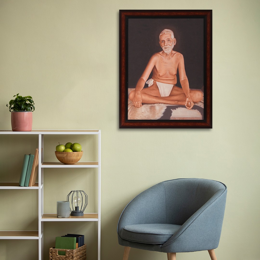 The background is kept completely dark, with a little touch of light shade mixed in to give the primary image the appearance of a dazzling halo, thus presenting the subject as the most enlightened and divine being. According to the history of painting, portraiture has played a significant role in immortalizing a person, a movement, or simply a trend. Sri Ramana Maharshi's portraiture simply allows his followers to be blessed while staring at his tranquil visage, which drips with love for his children.