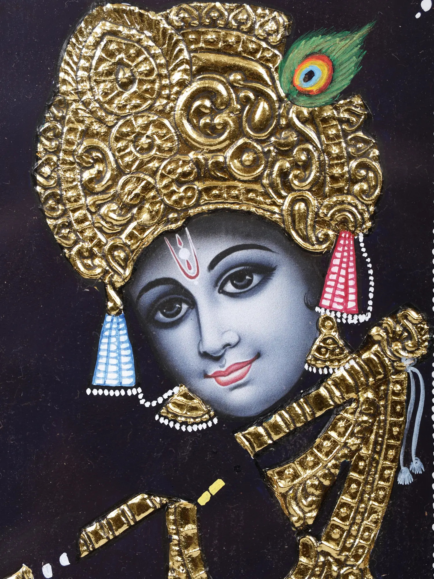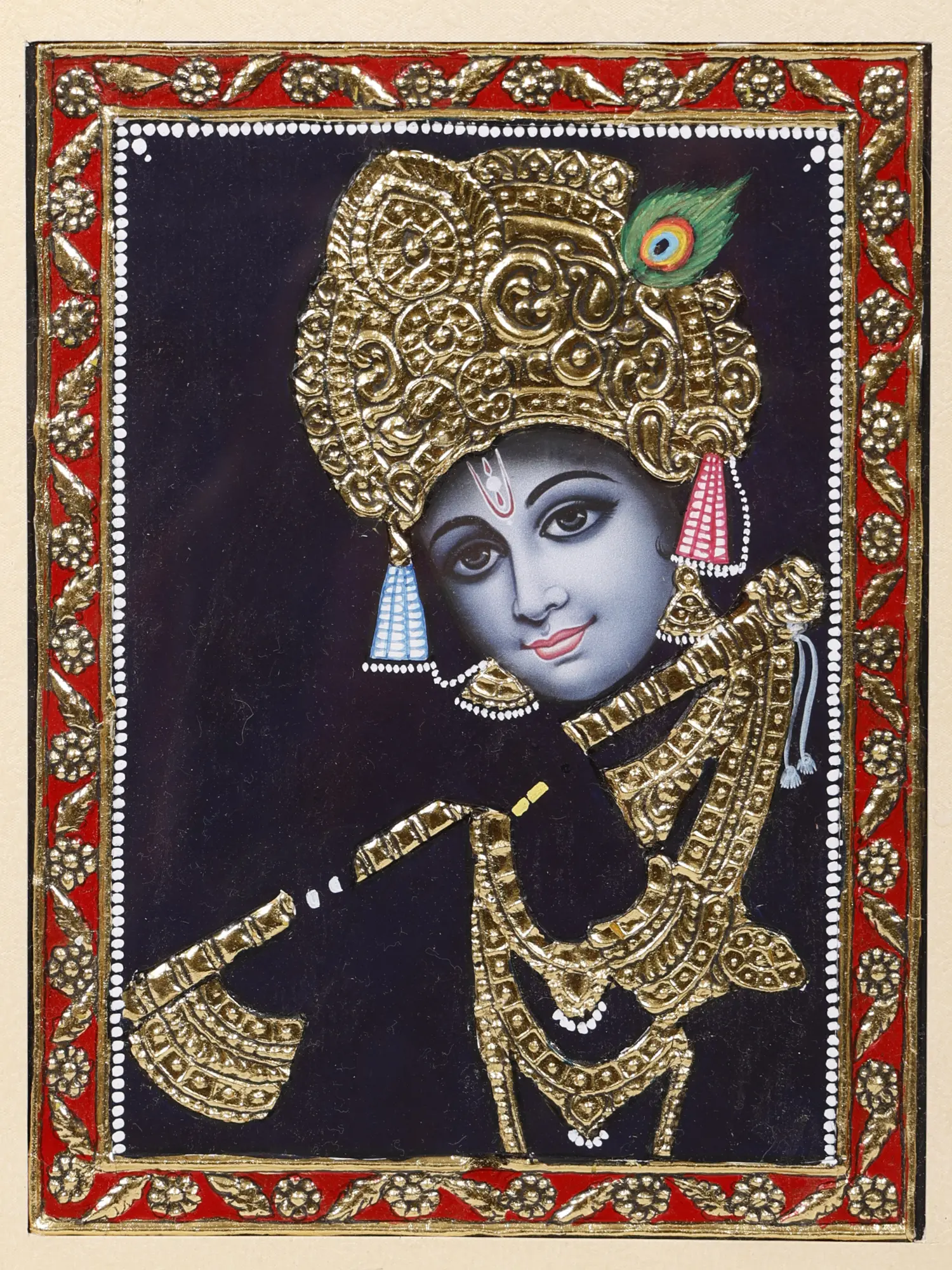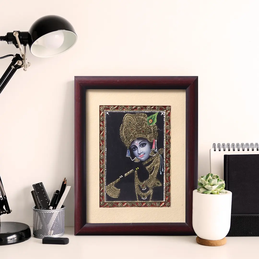 Bhagawan Krishna, the divine flutist, takes centre stage in this framed Tanjore creation. His enchanting music, the call of the soul, resonates through his melodious flute. The golden detailing mirrors the ethereal quality of his divine tune. As you gaze upon this artwork, let the music of Krishna's flute transport you to a realm where time stands still, and your heart dances to the rhythm of eternal love and bliss.