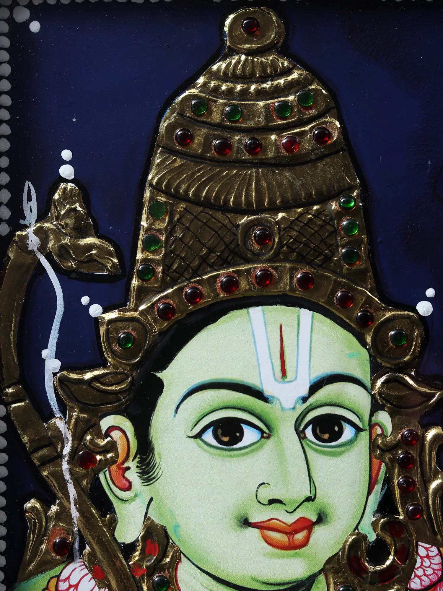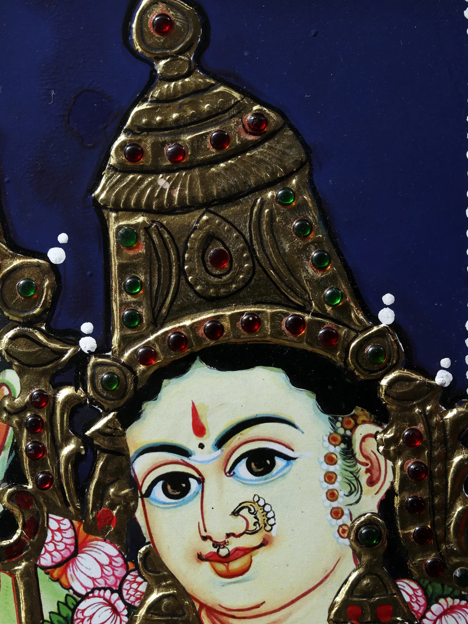 Tanjore painting is a traditional form of art in the South Indian style and was started by the inhabitants of a small town known as Thanjavur of Tamil Nadu. This gives it another name called “Thanjavur painting”. This painting draws its figures, designs, and inspiration from the time when Vedic culture was prevalent in India. Certain remarkable features of a Tanjore painting distinguish it from other paintings. Some of these are pure gold or gold foil coating on gesso work, the use of rich and vivid colors, and the inlay of cut-glass or semi-precious and precious stones. The subjects of most of the Tanjore paintings are Hindu Gods, Goddesses, and saints. The main devotional figure is portrayed in the central portion of the painting and is usually surrounded by various secondary figures.