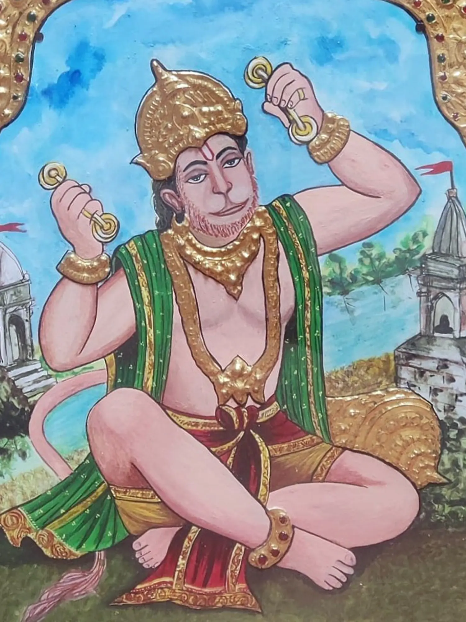 His hands raised to play the Khartal, Hanuman has a meditative bliss on his face, an expression of his inner happiness as he drinks the nectar of Ram-Nam.