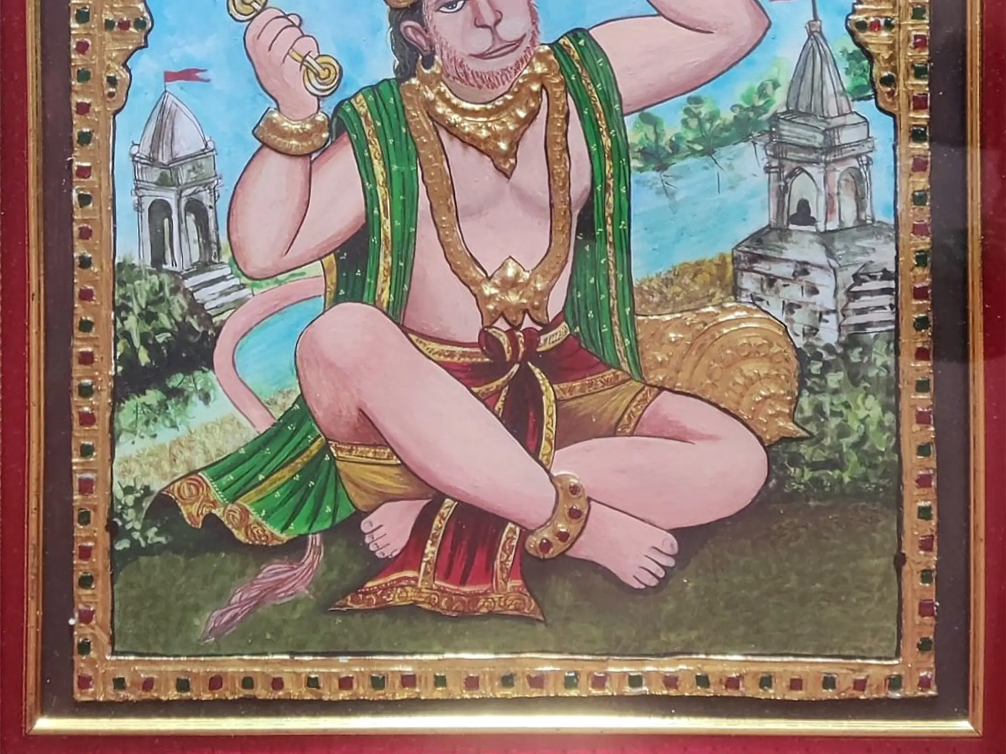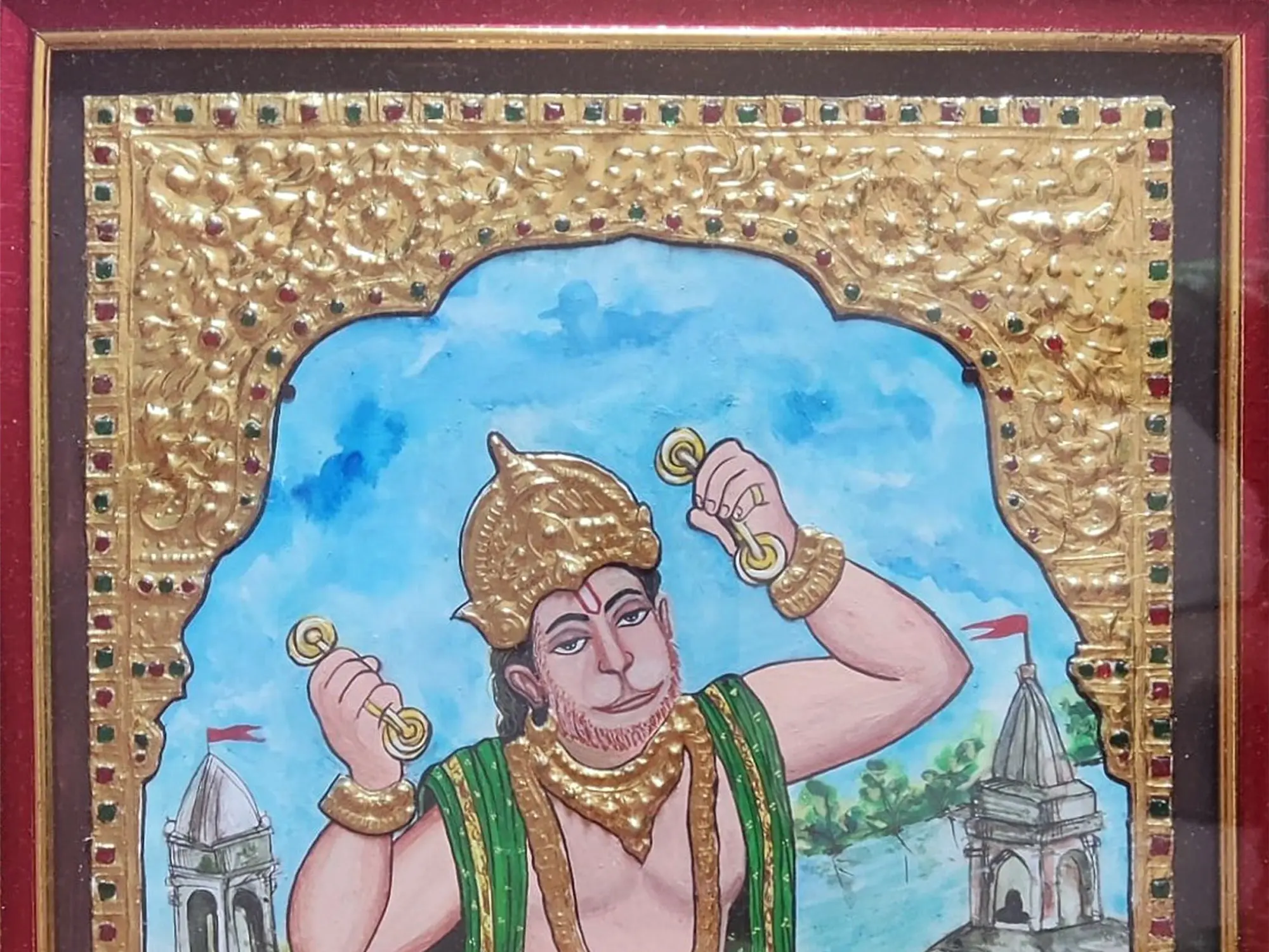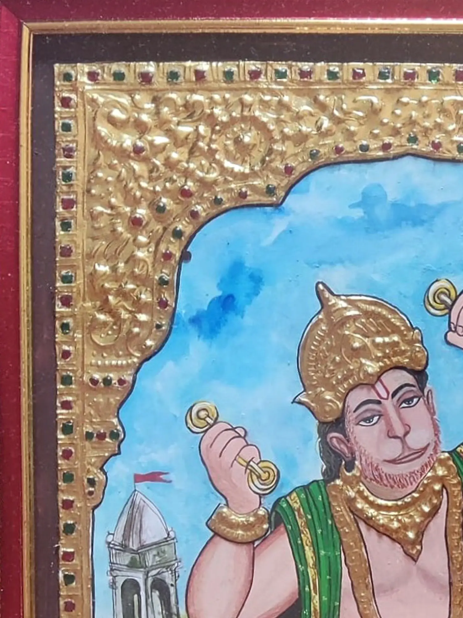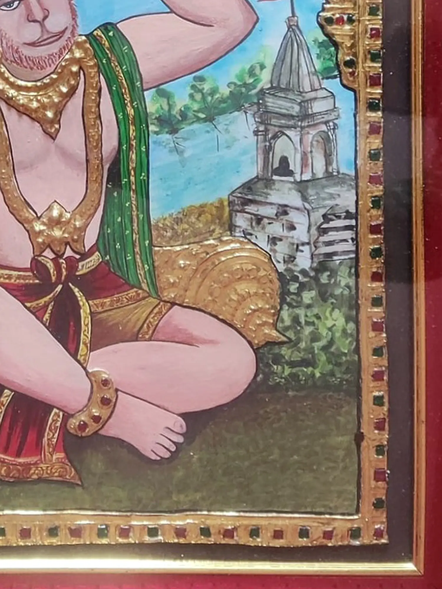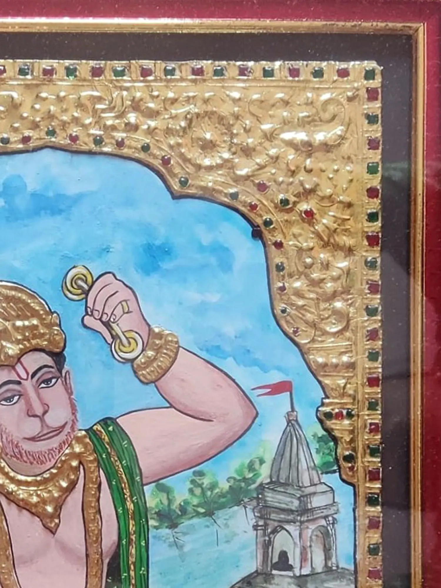 A Teertha or pilgrimage marked by temples and sacred rivers forms the background of this Tanjore painting, adding to the holy aura of Hanuman.