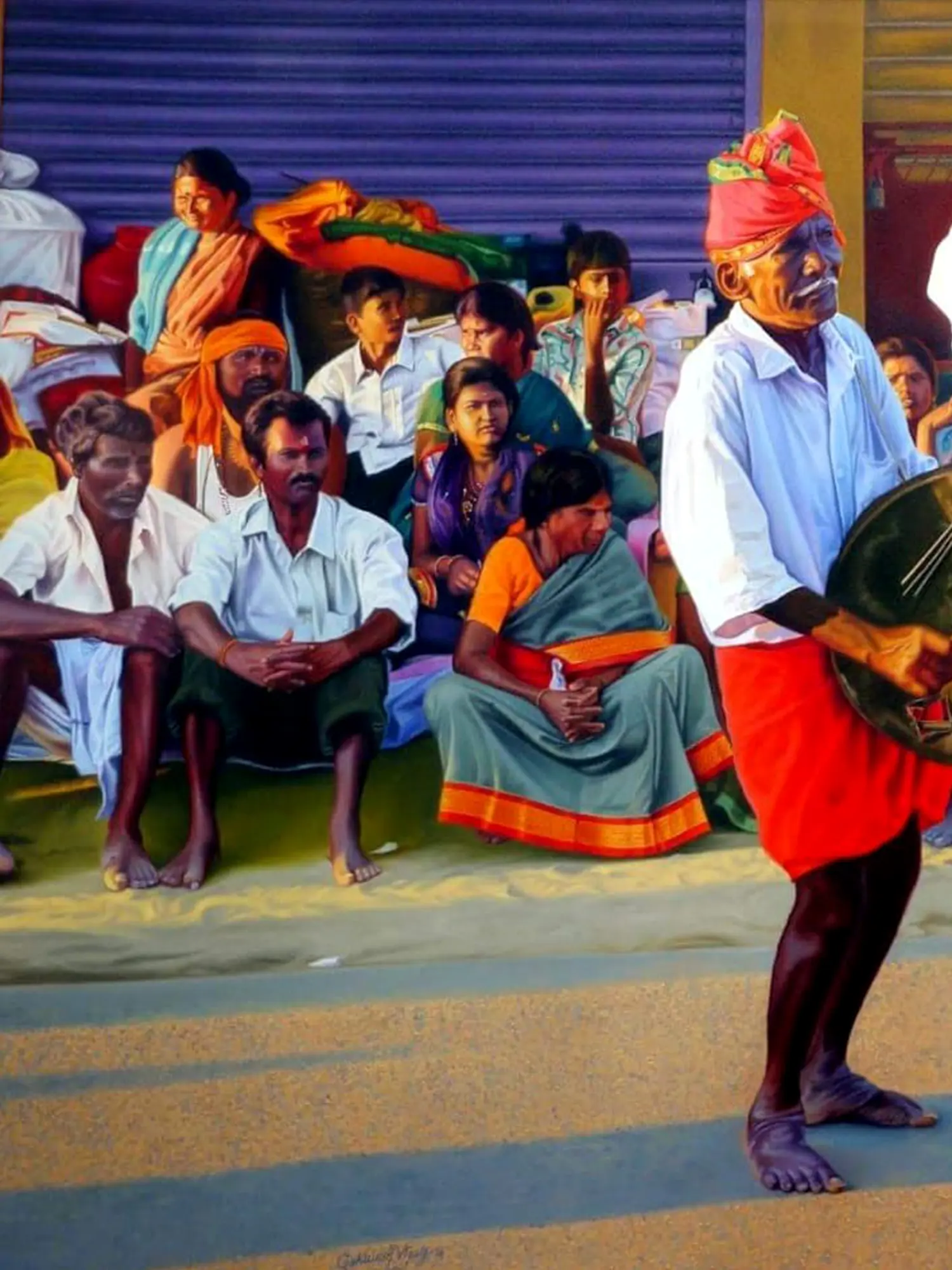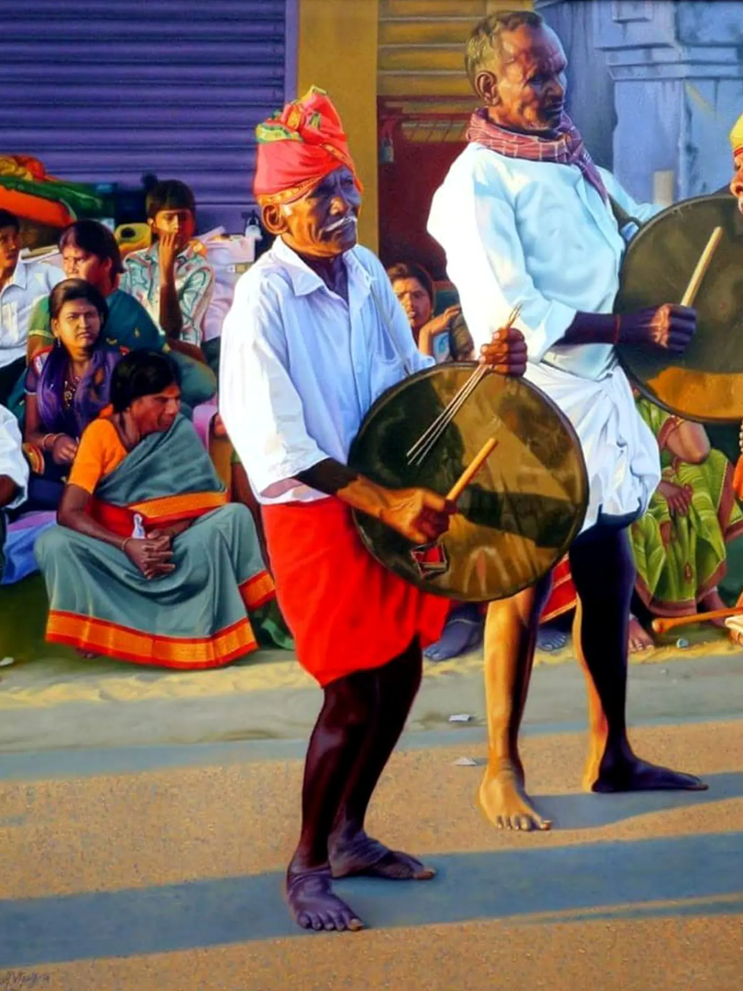 The painting evokes the rich tapestry of Indian mythology and folklore, where music and dance have always played a central role in religious and cultural ceremonies. Think of Shiva's cosmic dance, the Tandava, which symbolizes the creation and destruction of the universe. Or Krishna's enchanting flute, which captivated the hearts of the gopis (milkmaids) and drew them into a divine embrace. The musical instruments depicted in the painting carry their own weight of cultural significance. Drums, in particular, have been used in religious rituals for centuries, their rhythmic beats believed to invoke the presence of deities and drive away evil spirits. The ankle bells worn by one of the performers are reminiscent of the traditional dances performed in temples, where every movement is an offering to the divine. The painting, therefore, is not just a visual feast but a window into a world of ancient traditions and spiritual beliefs. This piece will surely be a conversation starter with depth and beauty.