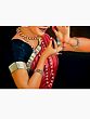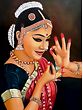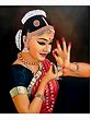 A Bharatnatyam dancer assumes a graceful mudra of the hands. The ends of Her fingers dipped in crushed vermillion liquid, nails painted a solid white colour. The tips of the thumb and forefinger of each hand are brought together near the face. On Her face, a subtle yet unmistakable smile.