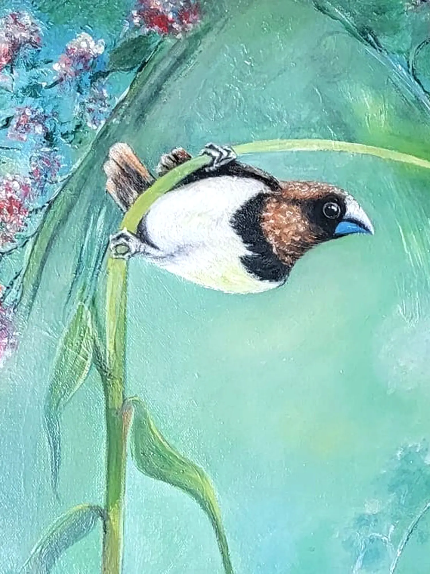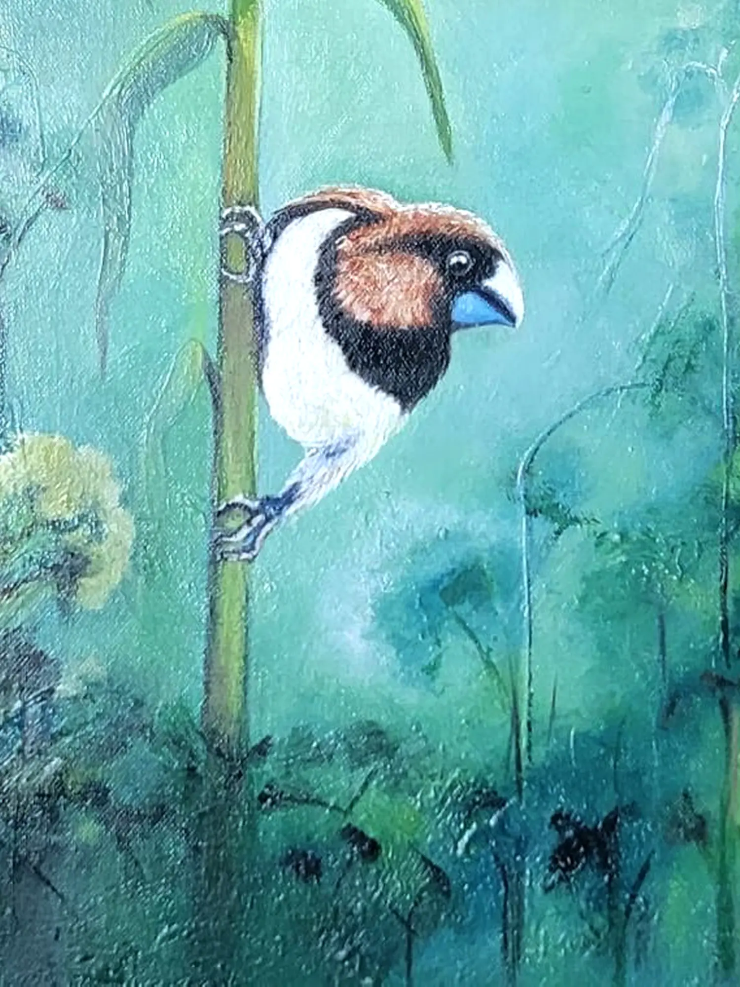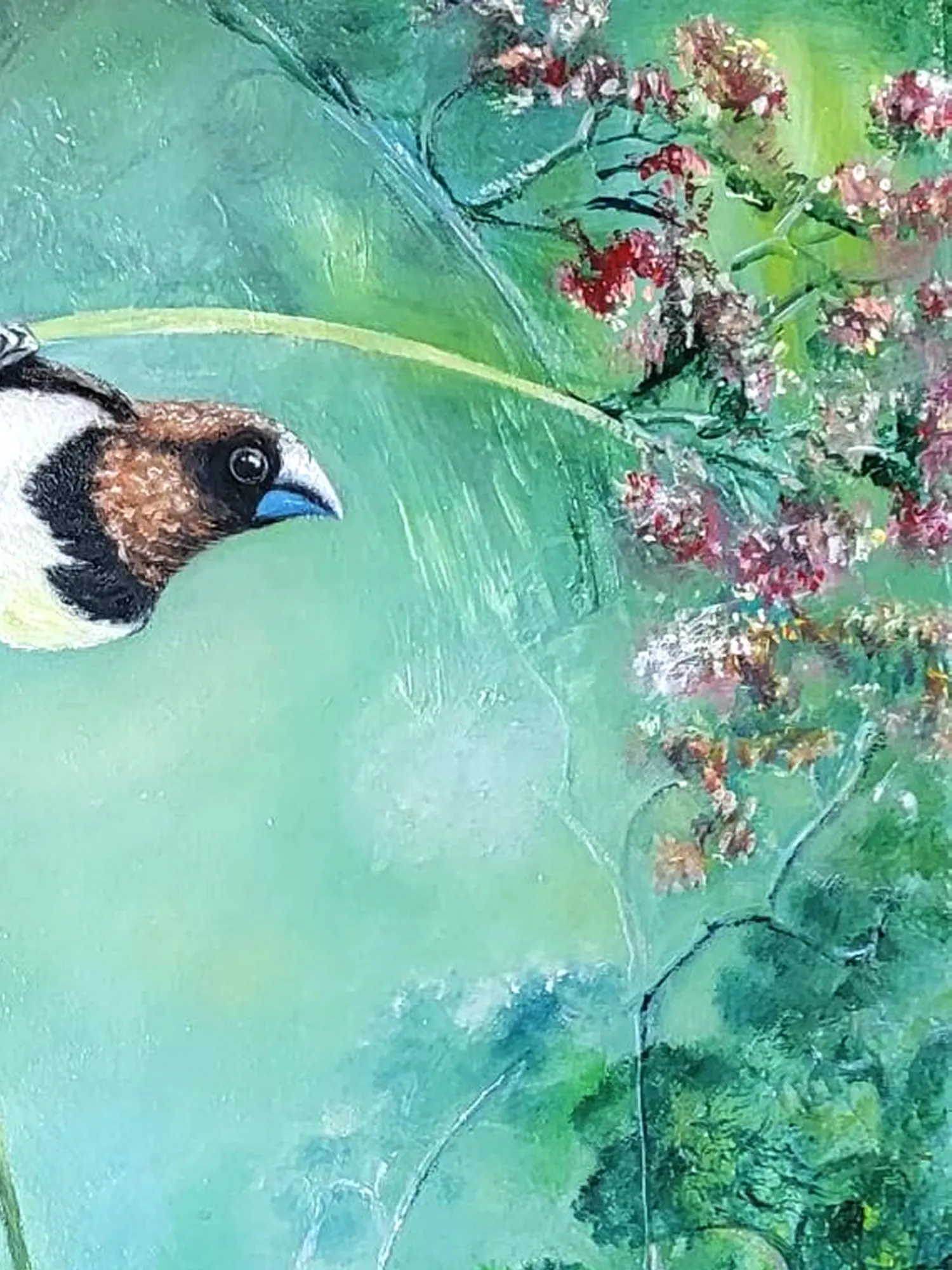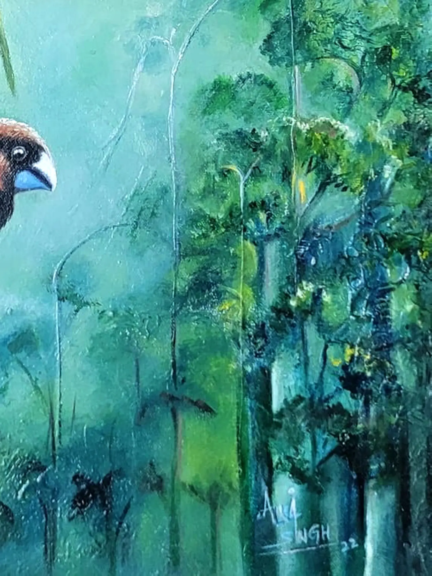 The subtlety of the pastel hues adds a soothing quality to the artwork, creating a tranquil atmosphere. Sengar's meticulous detailing and careful use of colors not only showcase her artistic finesse but also evoke a sense of calmness, turning the painting into a visual poem that celebrates the harmony between birds and their natural surroundings.