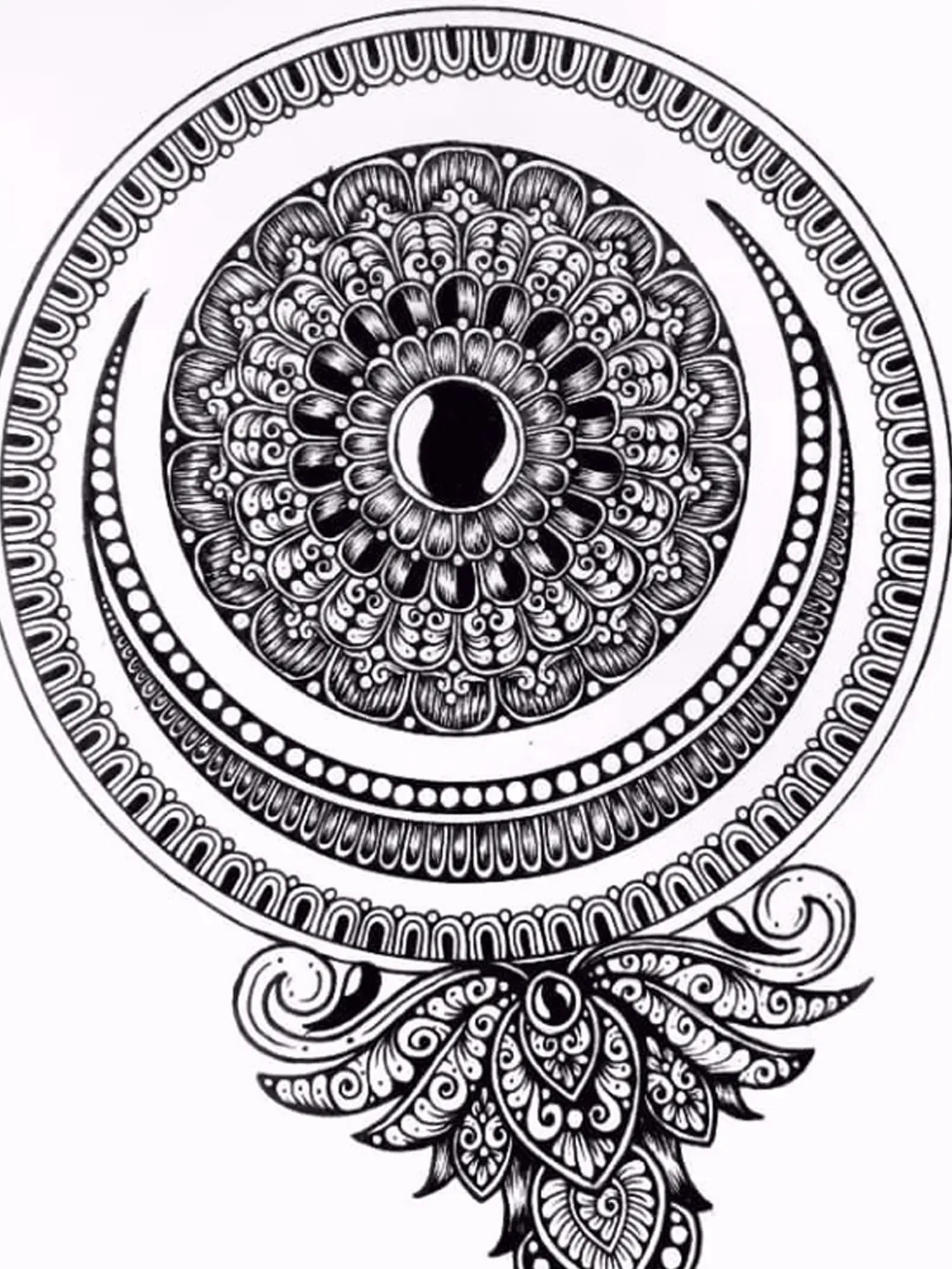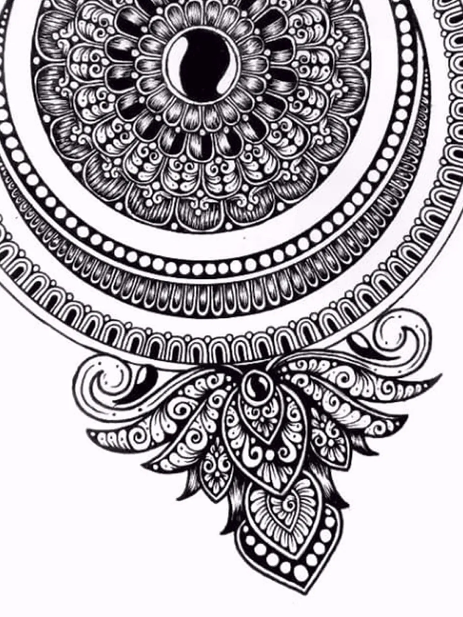 Each stroke of ink is a testament to patient artistry, meticulously applied to bring this complex design to life. Executed on high-quality paper, the pure black ink stands in striking contrast, highlighting the precision and skill involved in its creation. The absence of color amplifies the focus on form and texture, revealing the artist's profound understanding of line and pattern.