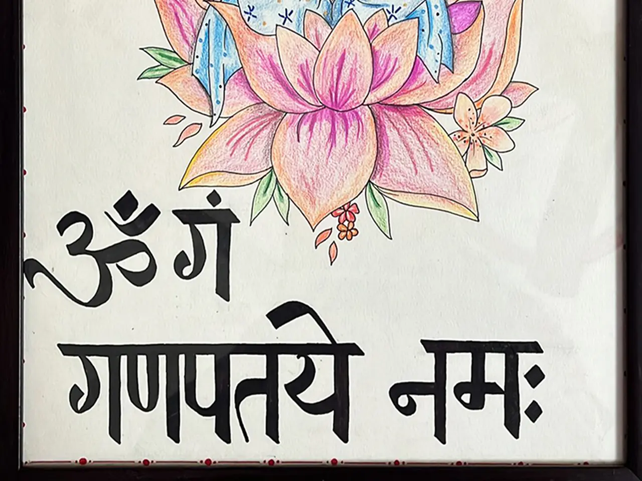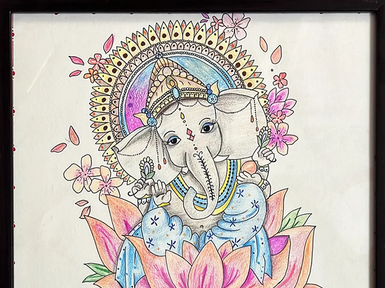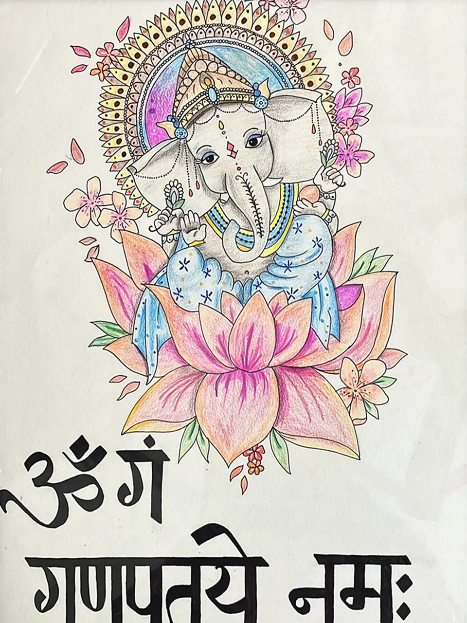 The emergence of gel pen and pencil sketches in contemporary art has brought forth versatile and intricate creations. Parisha Thukral's "Blessing Ganapati" exemplifies this trend, showcasing a blend of meticulous gel pen and pencil work. The artwork features a benevolent Lord Ganesha seated on a lotus, radiating divine blessings. What makes it significant is the inclusion of the sacred mantra "Om Gana Ganpataye Namah" beneath the image.