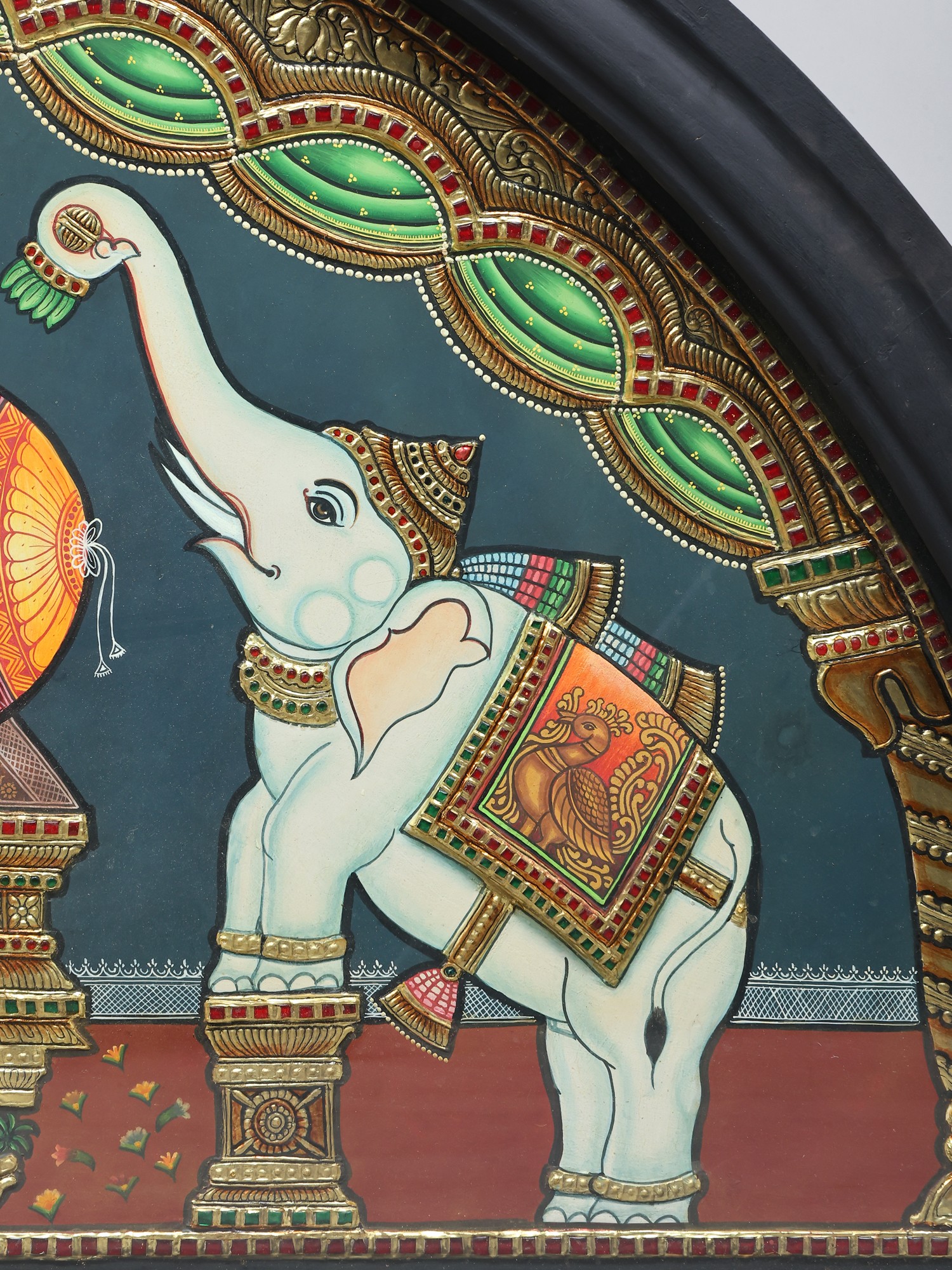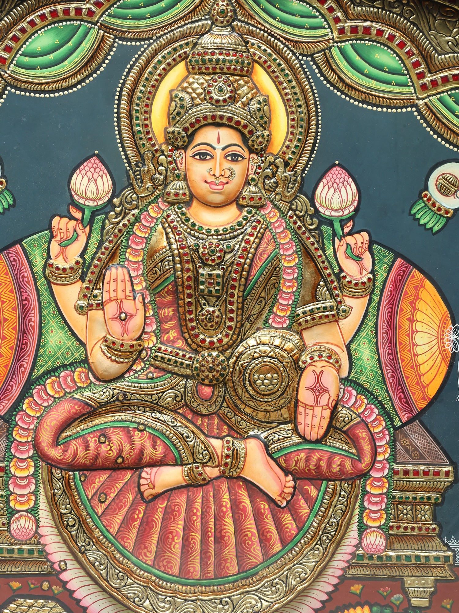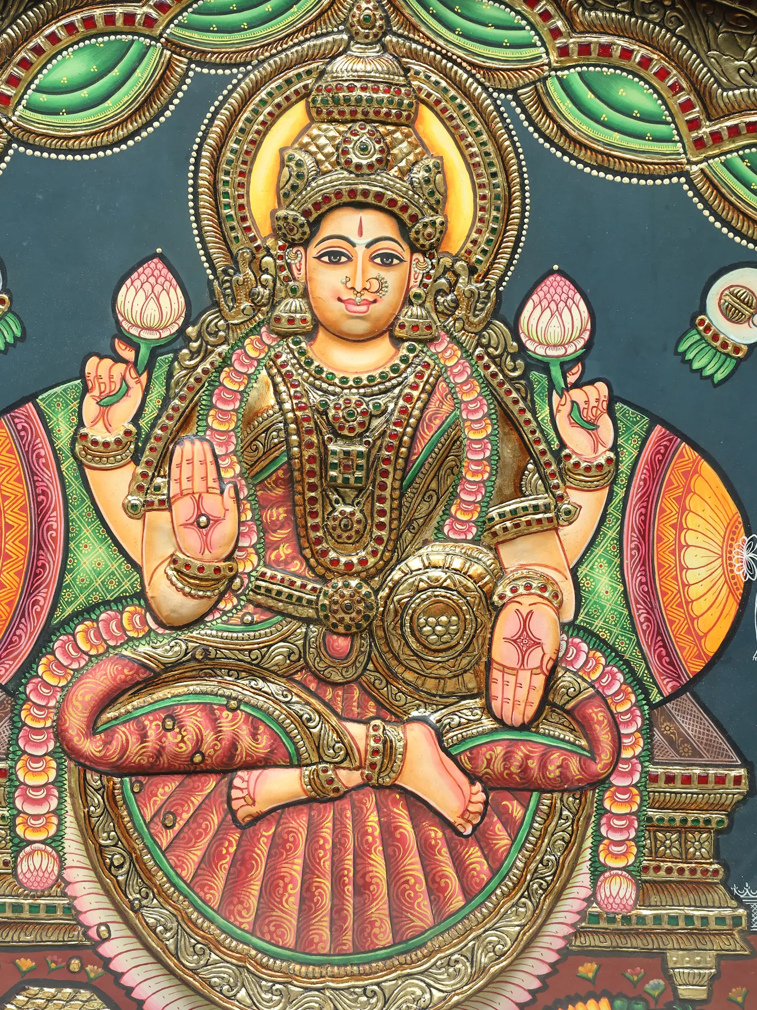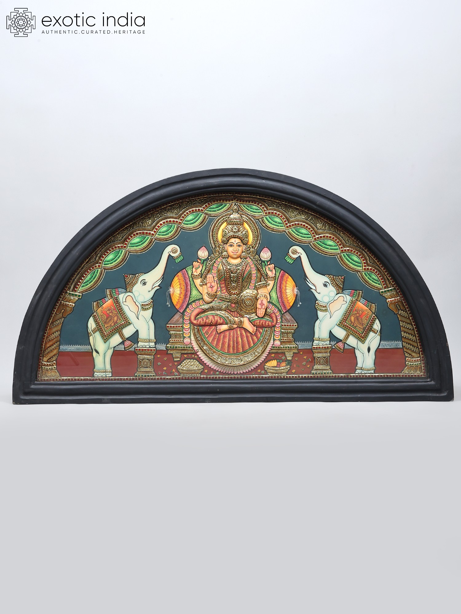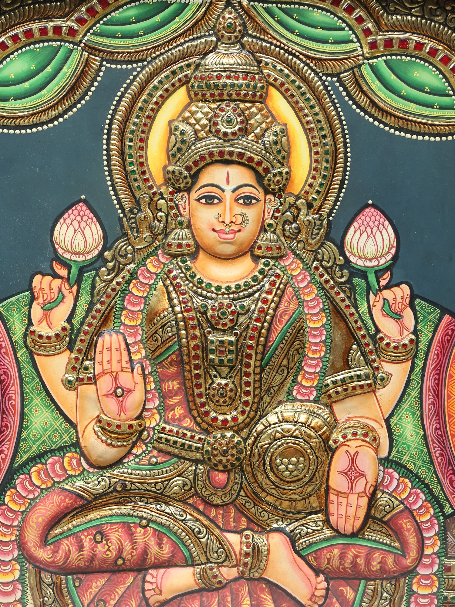 Goddess Gajalakshmi Tanjore Painting | Traditional Colors With 24K Gold | Teakwood Frame
