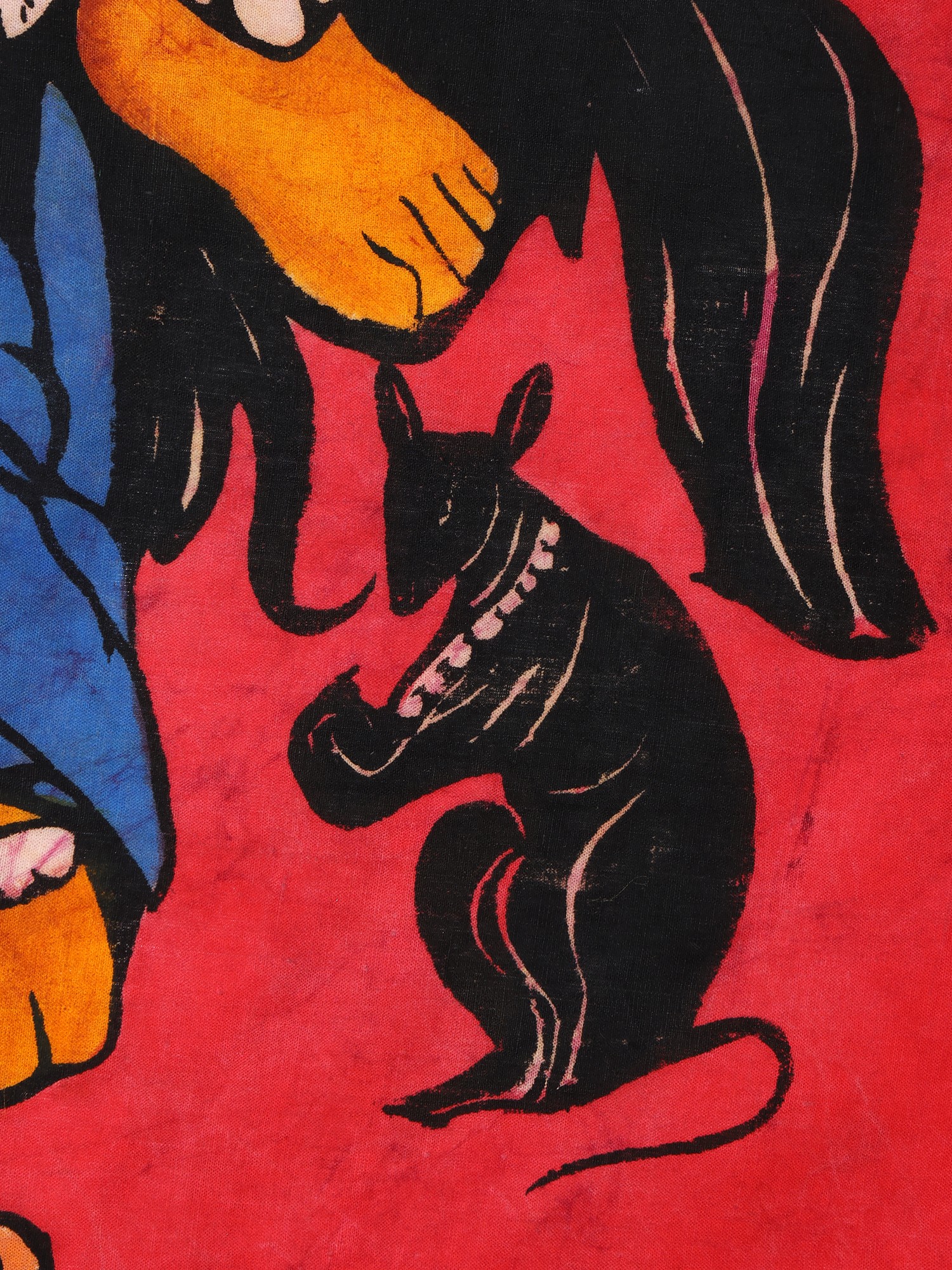 Batik, an ancient art form in India, involves applying wax and dyes to fabric to create intricate designs. It originated in Indonesia but has been adapted and practiced in various regions, including India. This batik painting on cotton cloth depicts Lord Ganesha in the Lalitasana pose, blessing his devotees. His yellow complexion symbolizes his divine presence, while the white halo pays homage to his elevated status.
