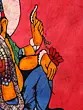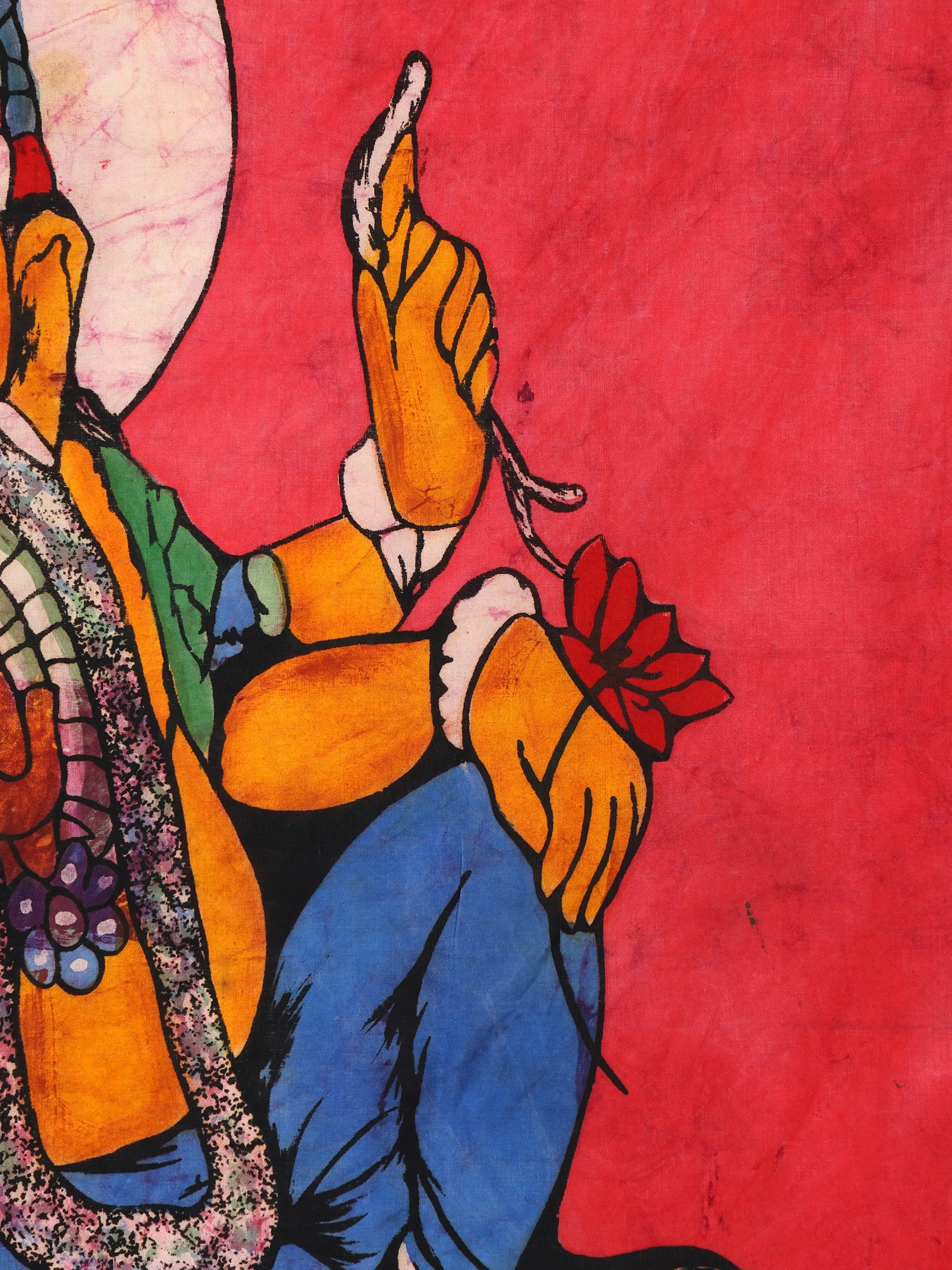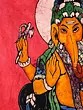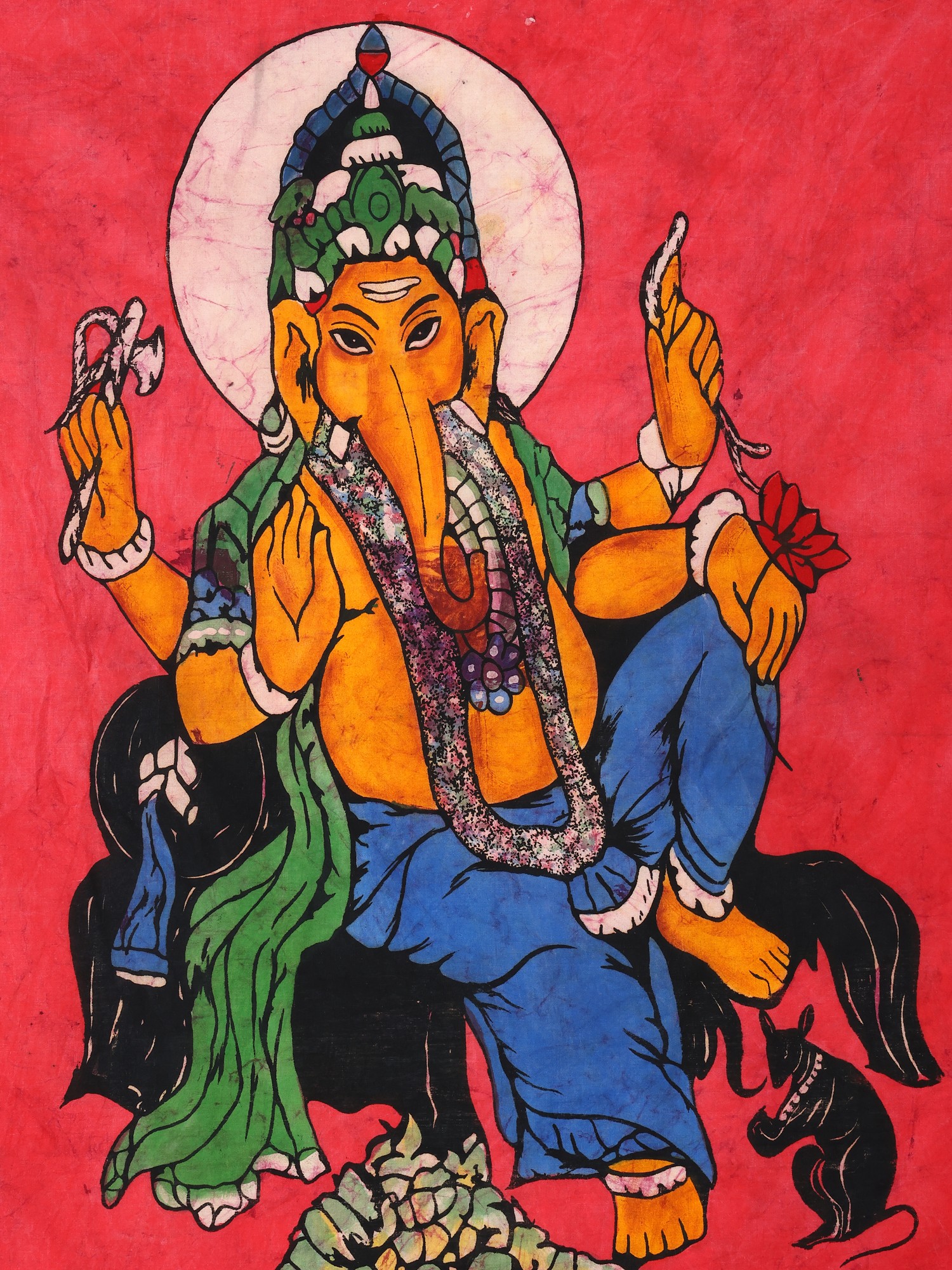 The meticulous application of wax and dyes highlights the details of Ganesha's form, creating a vibrant and visually captivating artwork. Here in this divine painting, he wears a colorful crown. This batik piece not only celebrates Ganesha's divine attributes but also showcases the artistic prowess and cultural heritage of Indian batik artisans.