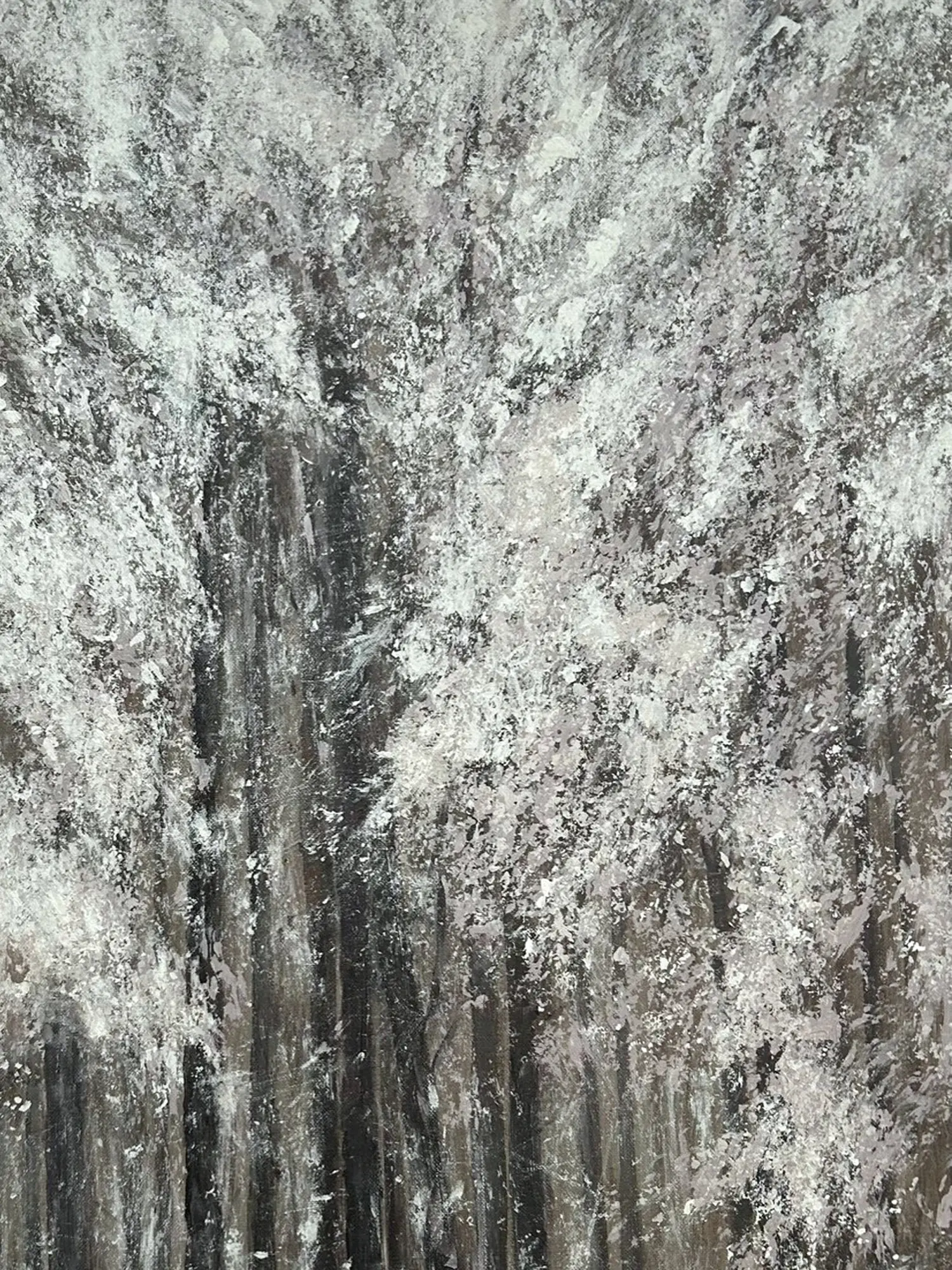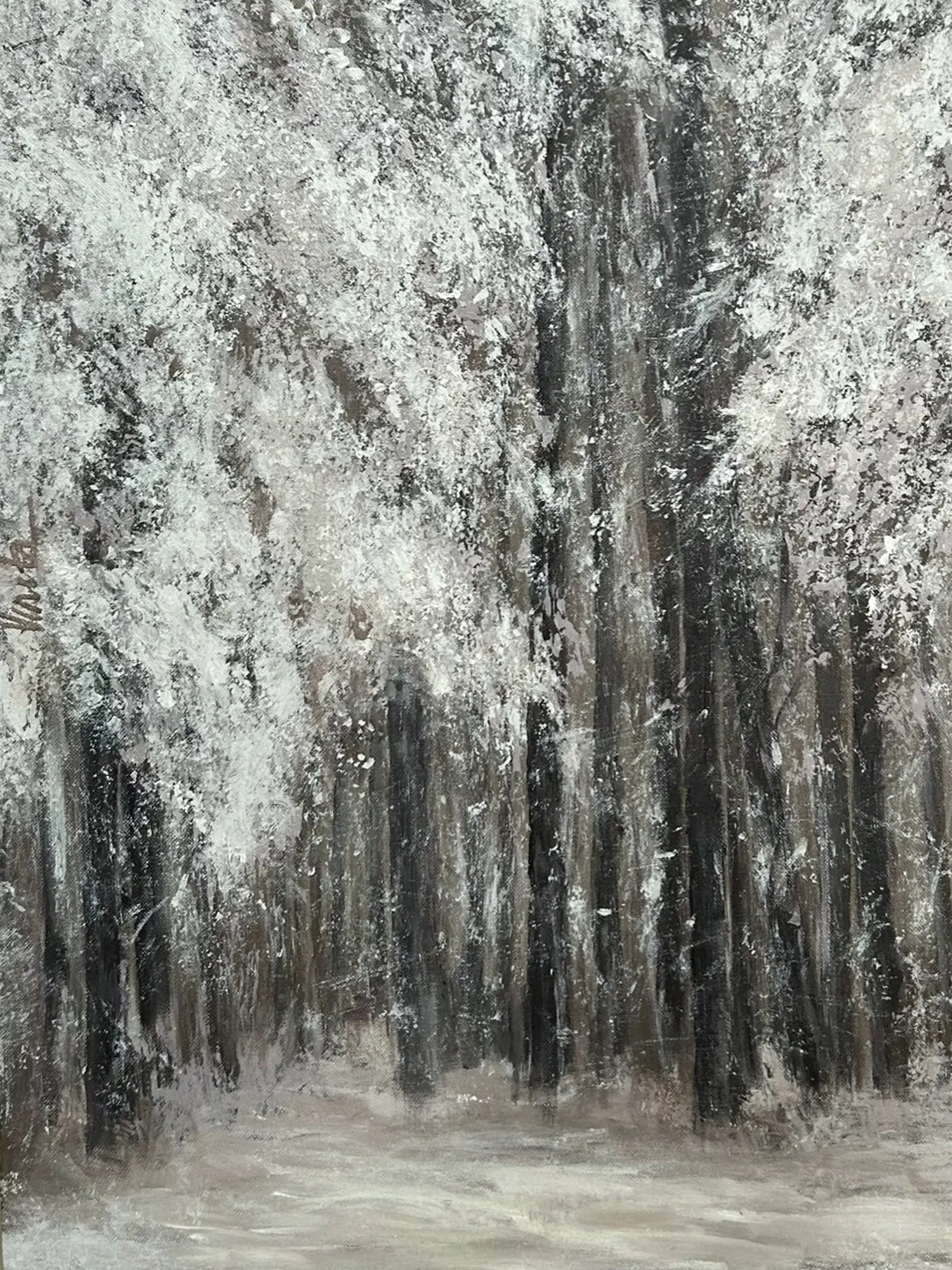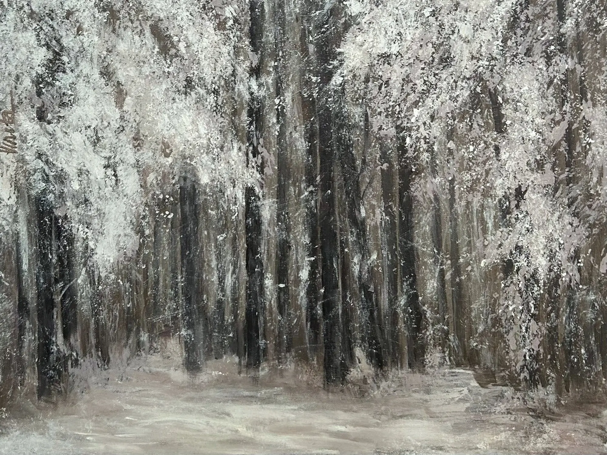 The composition unfolds across a substantial 30 by 24 inches, drawing you into a dense yet inviting woodland scene. You'll be captivated by the interplay of dark, vertical trunks that ground the image, juxtaposed with the soft, textured abundance of snow clinging to branches and the forest floor. The application of acrylic medium allows for a dynamic visual experience, where opaque whites create a stunning contrast against the earthy undertones, mirroring the stark beauty of a winter landscape.