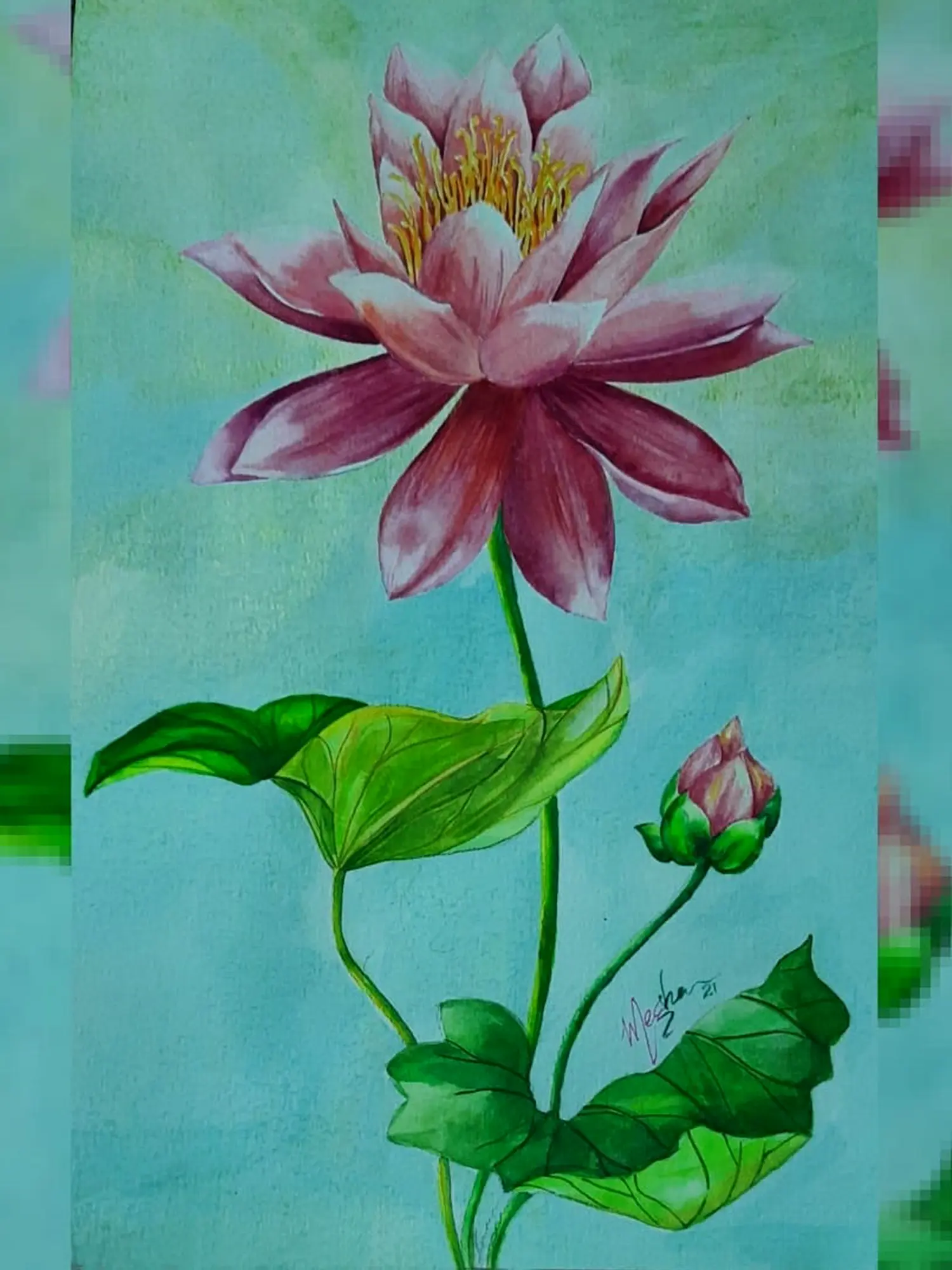 Megha Chakraborty's "Blooming Pink Lotus" in watercolor on Canson sheet is a captivating portrayal of the sacred flower, revered as the divine seat for gods and goddesses in various cultures. The lotus, symbolizing purity and enlightenment, holds a profound meaning as a representation of wisdom. The heartwarming image unfolds against a sea blue background, enhancing the magnificence of the blooming pink lotus.
