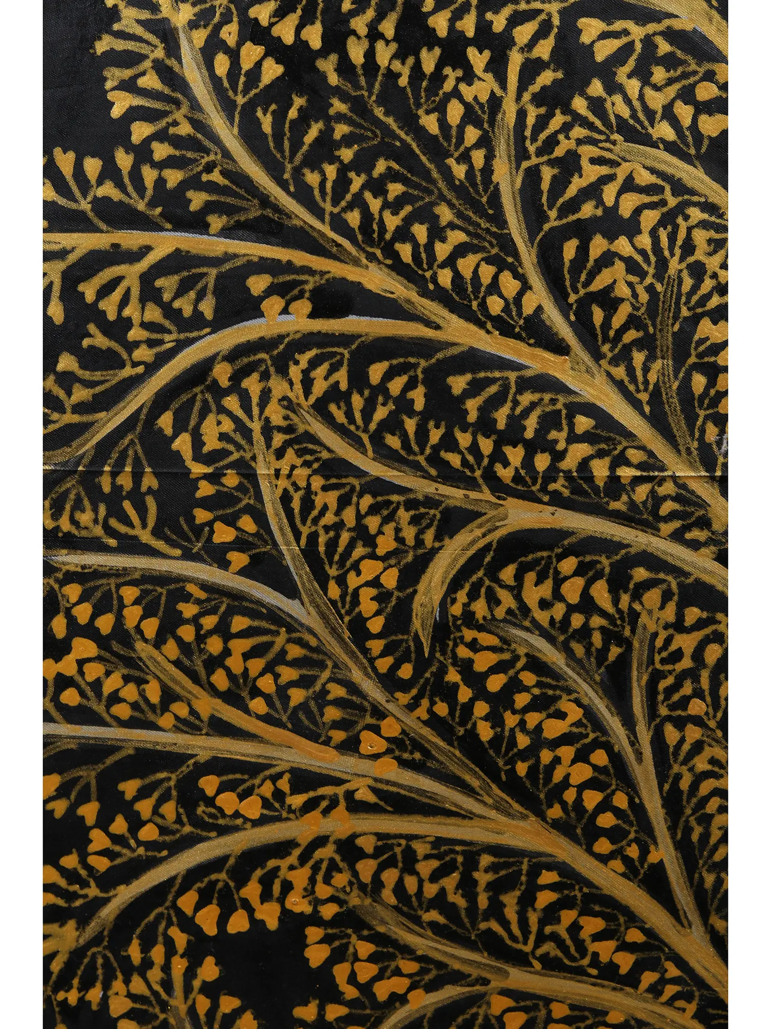This exquisite Pattachitra painting, "The Blooming Tree," transports you to a realm where art intertwines with ancient mythology and cultural symbolism. The Tree of Life, a motif prevalent across diverse cultures and spiritual traditions, is depicted here with breathtaking detail and vibrant artistry. From the roots that anchor it firmly to the earth to the branches reaching towards the heavens, every stroke of the brush speaks volumes about the cyclical nature of existence, growth, and renewal. The rich, gold-toned foliage against the deep black backdrop creates a captivating contrast, reminiscent of the celestial glow against the night sky.