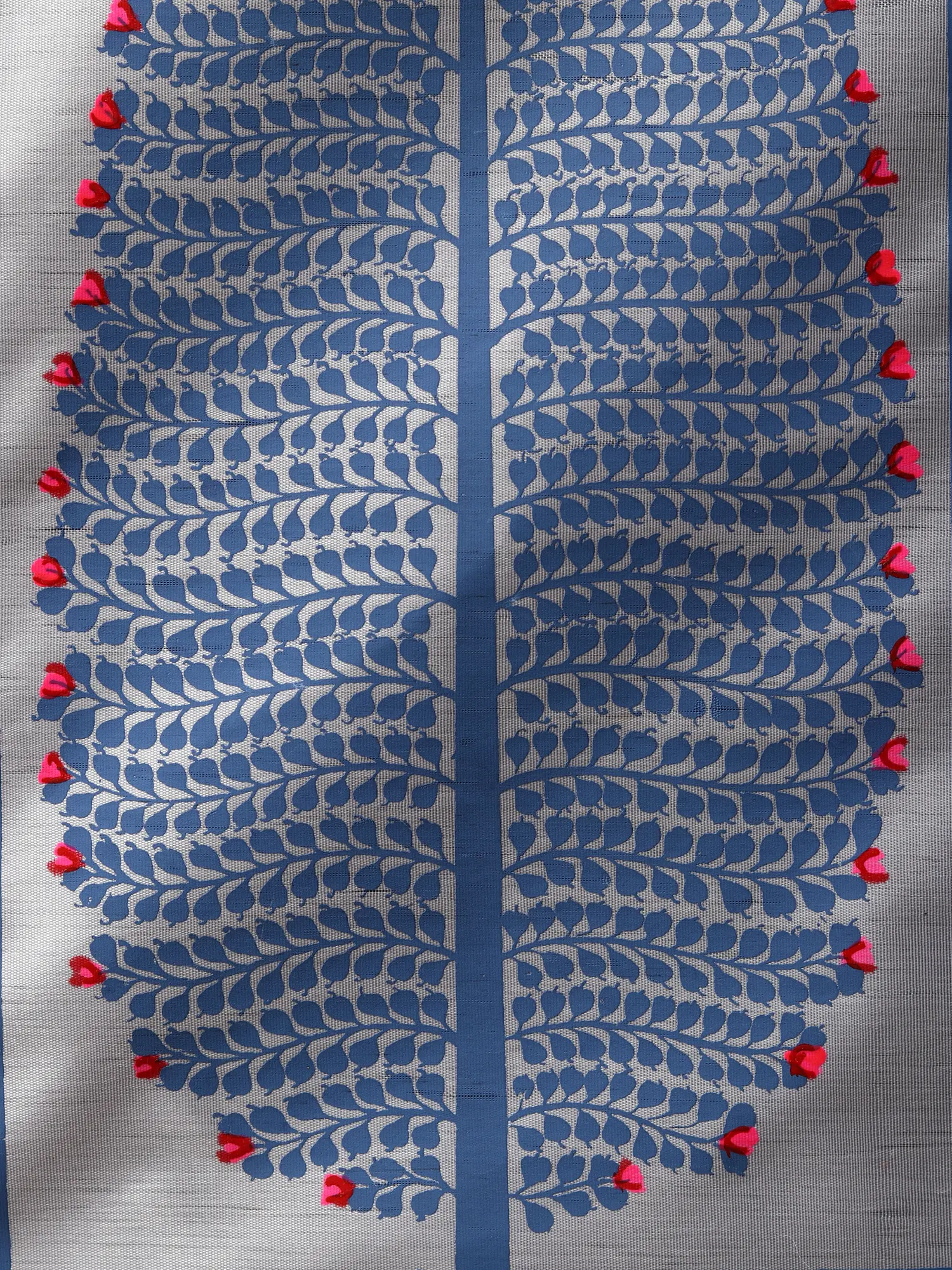 The striking blue of the central tree, adorned with vibrant crimson buds, is framed by an intricately detailed border. This border, a symphony of blue, gold, and hints of orange, draws your eye inward, creating a captivating visual journey. The generous canvas of shimmering silk, measuring 16.5 inches in height and 6.5 inches in width, provides a substantial yet elegant presence, making it a statement piece that feels both grand and intimate.