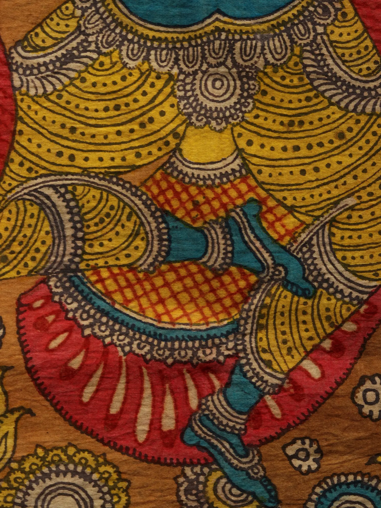 Kalamkari, meaning "pen craft," is a centuries-old art form originating in India. Using natural dyes derived from plants and minerals, artisans meticulously hand-paint or block-print intricate designs onto cotton or silk. The process is arduous, involving multiple stages of dyeing, washing, and painting, requiring immense skill and patience. Kalamkari art often draws inspiration from Hindu mythology, epics, and folklore, serving as a visual narrative of India's rich cultural heritage. This painting exemplifies the meticulous craftsmanship and artistic finesse that define the Kalamkari tradition. The natural dyes imbue the artwork with a unique character and depth, creating a piece that is not only visually appealing but also steeped in history and cultural significance. The use of cotton as the base material underscores the connection to the earth and the natural world, further enhancing the artwork's organic and authentic appeal. Each brushstroke reflects the artist's devotion and mastery of this age-old technique, making this piece a valuable representation of Indian folk art.