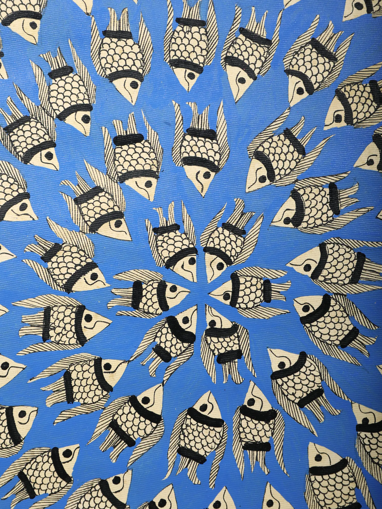 Madhubani painting, originating from the Mithila region of Bihar in India, is a unique form of folk art characterized by its vibrant colors, intricate detailing, and use of natural dyes. Traditionally painted on freshly plastered walls during festivals and special occasions, Madhubani art found its way onto paper and canvas in the 20th century. This piece preserves the spirit of traditional Madhubani art through its use of handmade paper and the distinctive folk-inspired motifs and techniques. The artist's skillful use of line and color captures the essence of this ancient tradition, creating a piece that is both timeless and contemporary. The simple yet potent imagery of the school of fish speaks directly to the traditional themes often found in Madhubani art: nature, religious icons, and cultural practices.