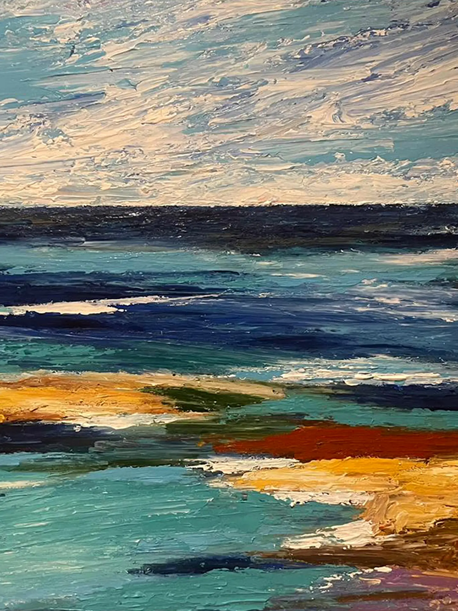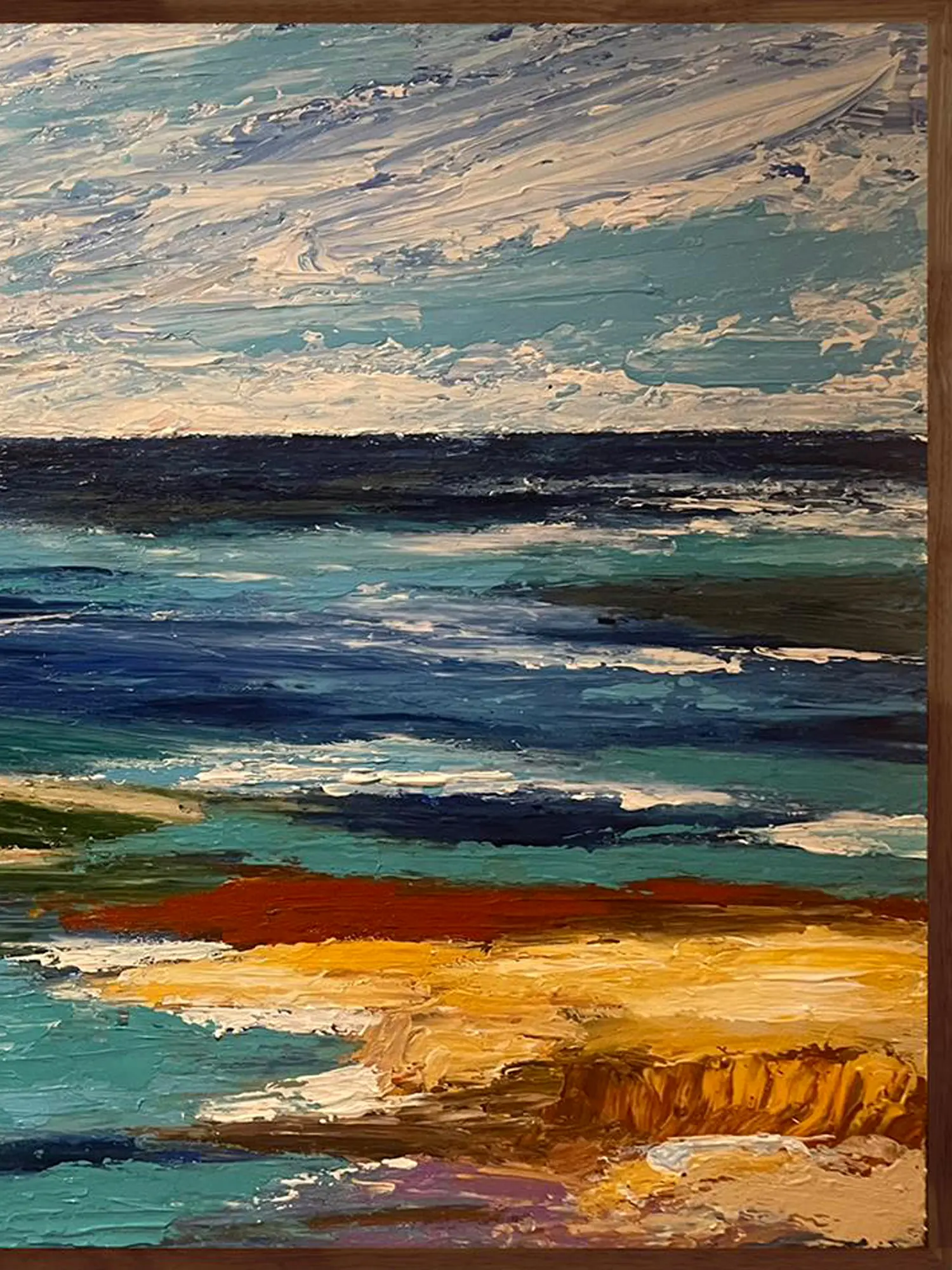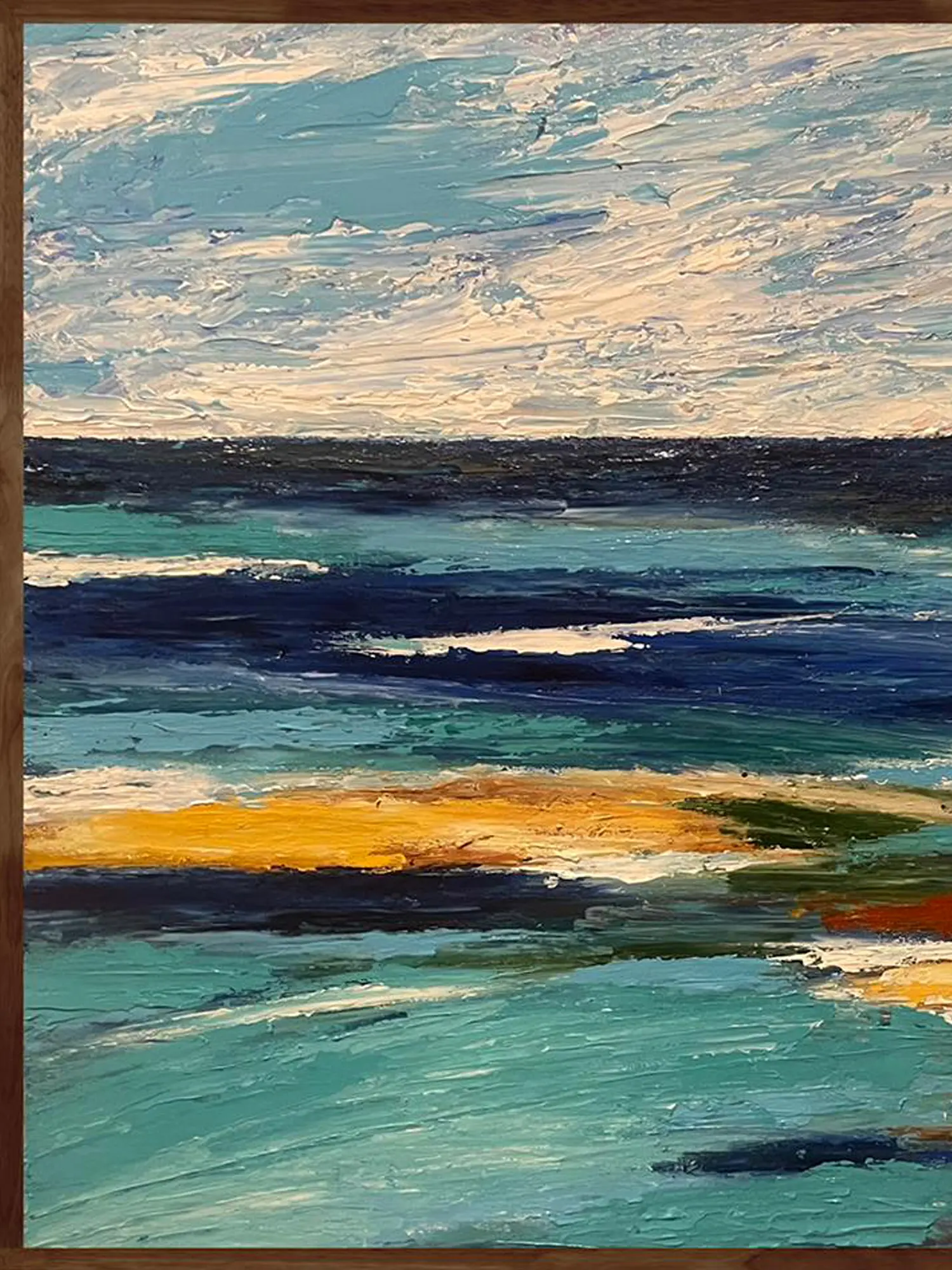 This acrylic artwork captures the ephemeral beauty of nature in a unique and expressive way. The artist’s use of texture and color brings a dynamic quality to the scene, making it feel alive and ever-changing. This piece offers a respite from the everyday, allowing you to escape to the calming presence of the ocean, even if just for a moment. Let this artwork serve as a reminder to pause, breathe, and appreciate the beauty that surrounds us, mirroring the serenity found in nature’s boundless landscapes.