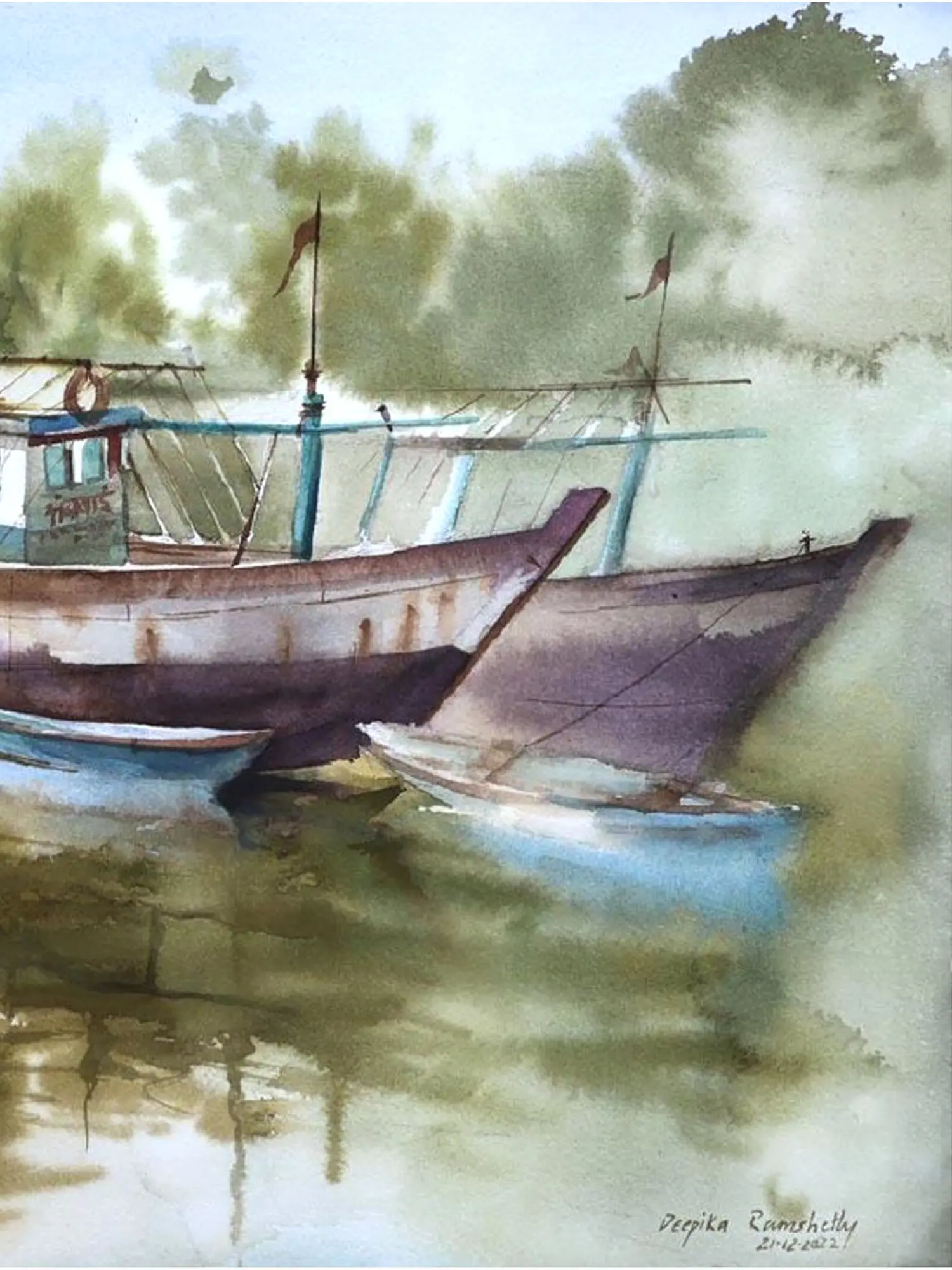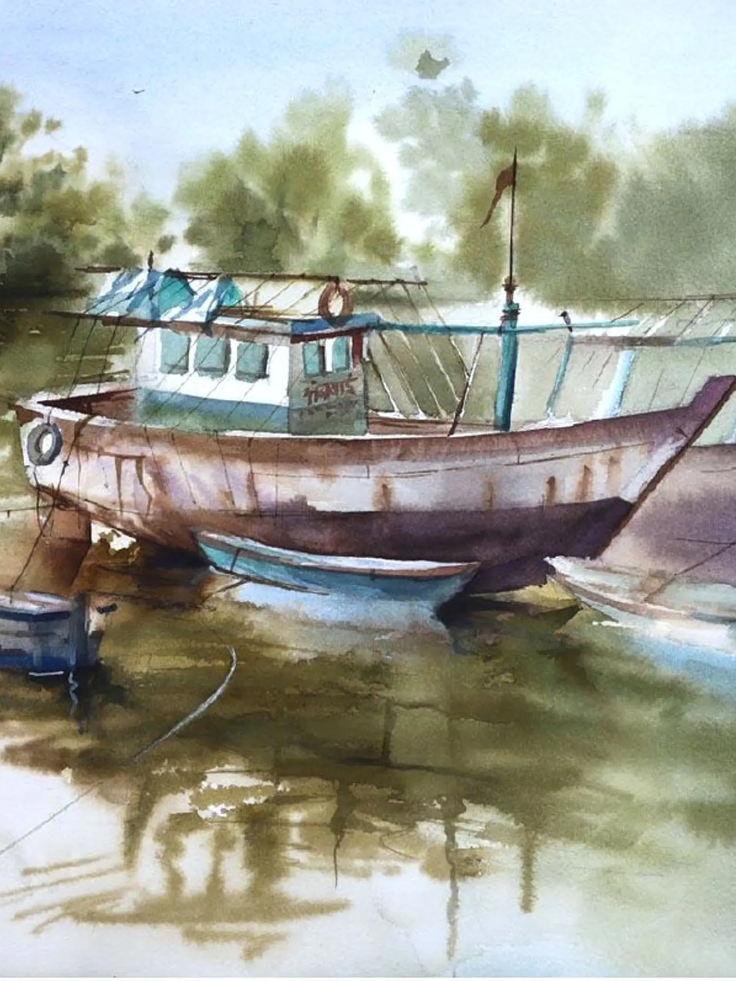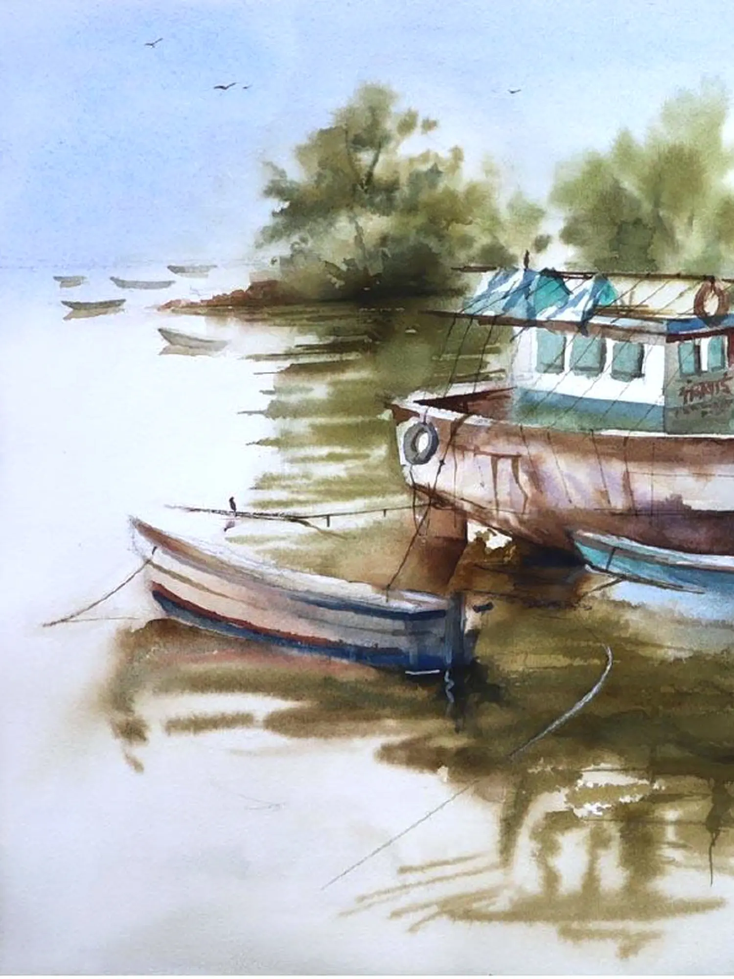 Immerse yourself in a scene of serene stillness with this evocative watercolor. You'll appreciate the quiet beauty of vessels at rest, capturing a pause in their maritime journey. This artwork offers a peaceful escape, inviting contemplation of life's simpler moments.