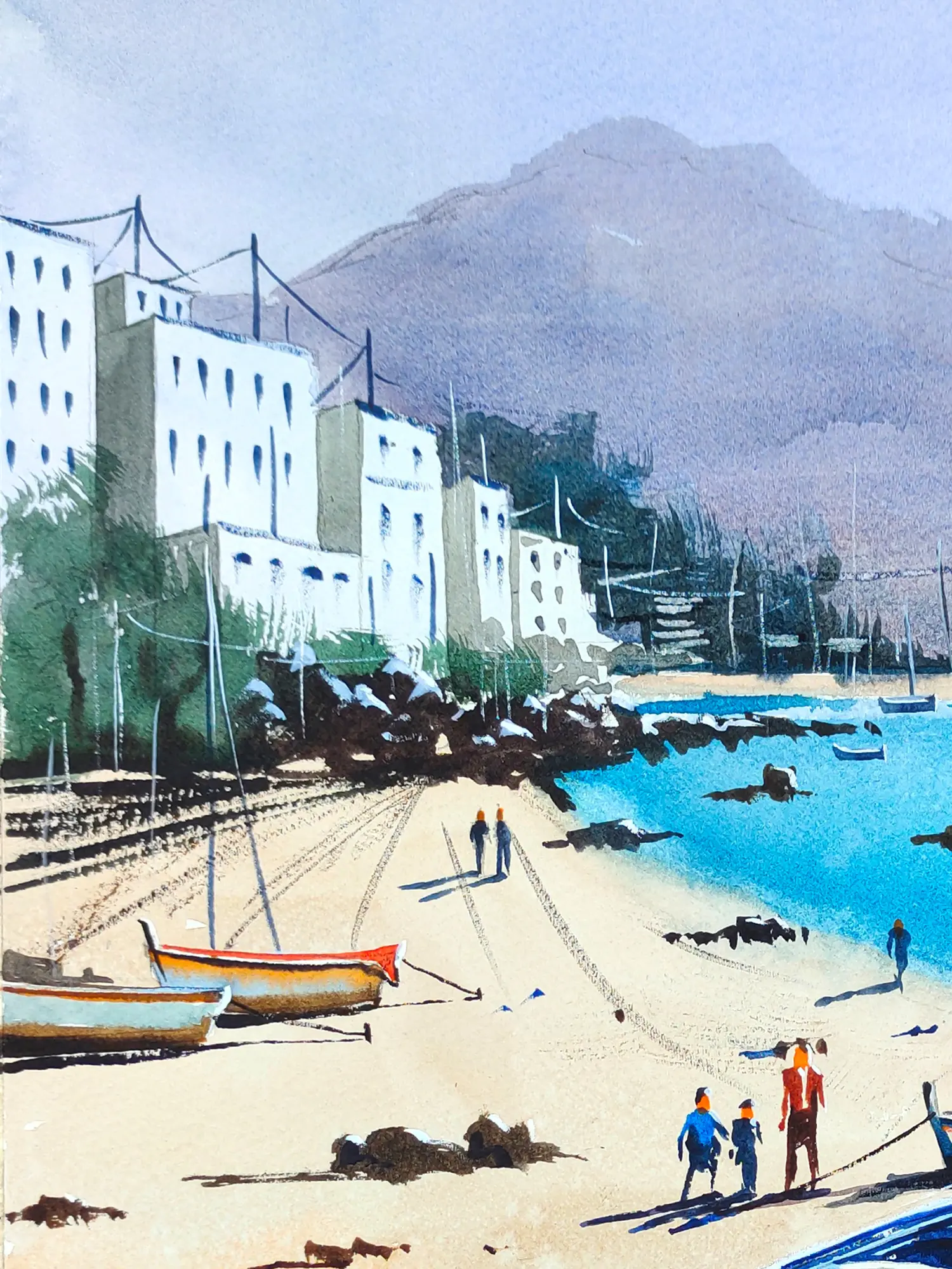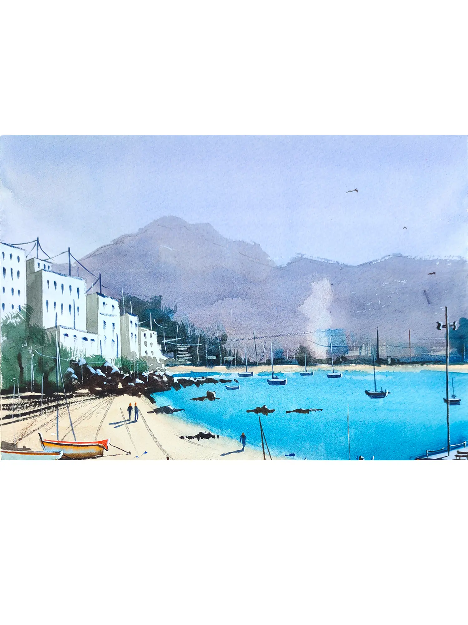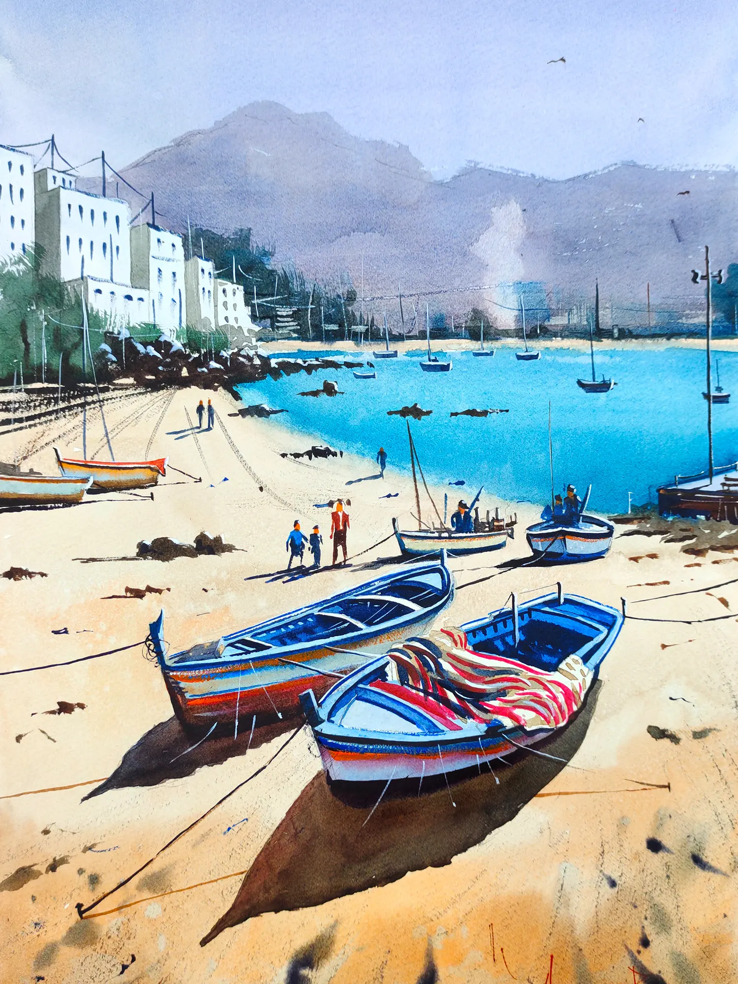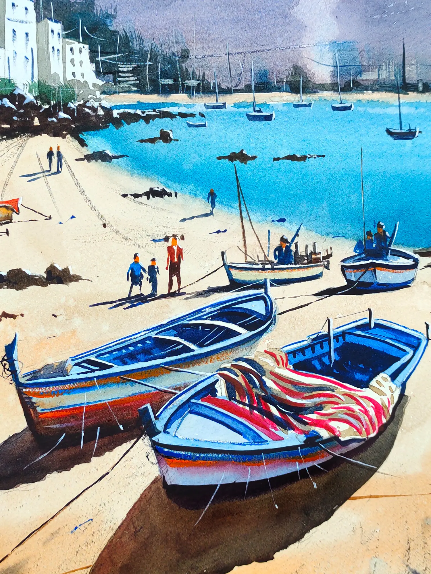 The vibrant blues of the water contrast beautifully with the warm, sandy shores, drawing your eye across the canvas. Observe the intricate details of the boats, their forms rendered with a confident hand, each line and curve conveying a sense of their inherent character. The surrounding architecture and distant mountains are softened by atmospheric perspective, contributing to the overall feeling of calm. This piece measures 14 inches in height and 11 inches in width, an ideal size to bring a touch of coastal charm to any space.