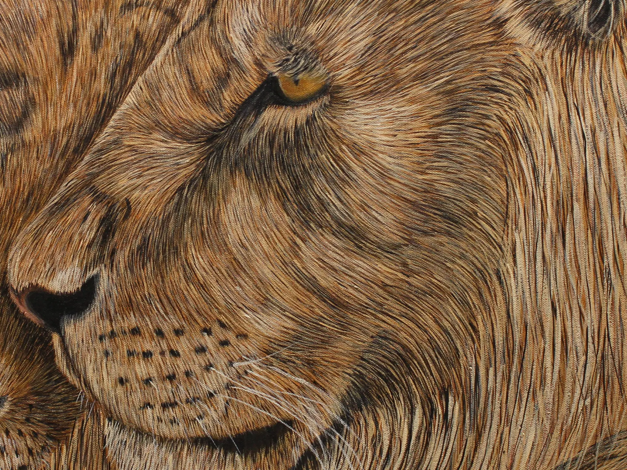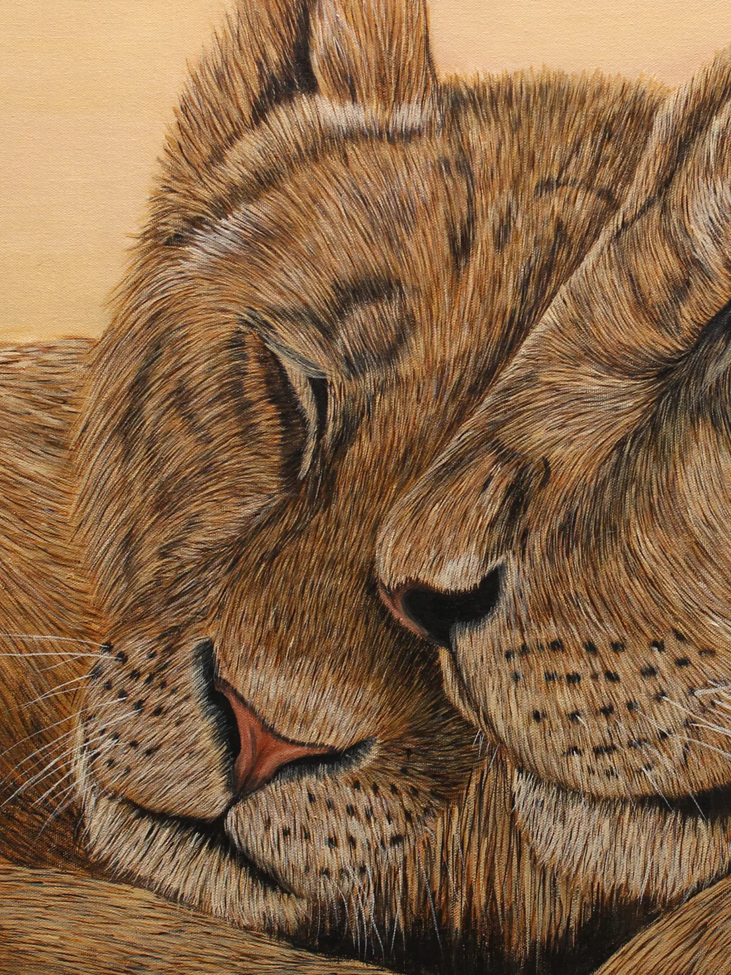 Wildlife and its occurrences fill one’s heart with the most peaceful feelings. Looking at animals being able to move and live in peace is something that makes the world a better place to live. This painting titled "Bond of Emotions" by Karthik, oil on canvas marvel captures the essence of love and unity between the king and queen of the jungle, the lion and lioness. The painting challenges the preconceived notion of these carnivorous animals being ferocious all the time. This painting the lioness lovingly leaning on the Lion also depicts the interdependency and emotional connection that exists among other animals. Amidst a serene brown backdrop, the artwork exudes a sense of harmony, inviting viewers to celebrate the beauty of companionship and the power of shared emotions in the wild embrace of nature.