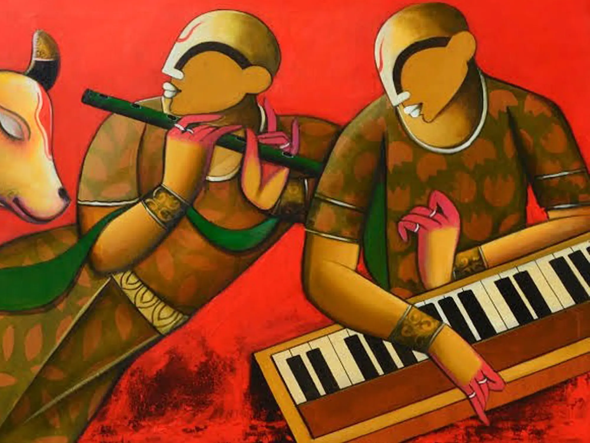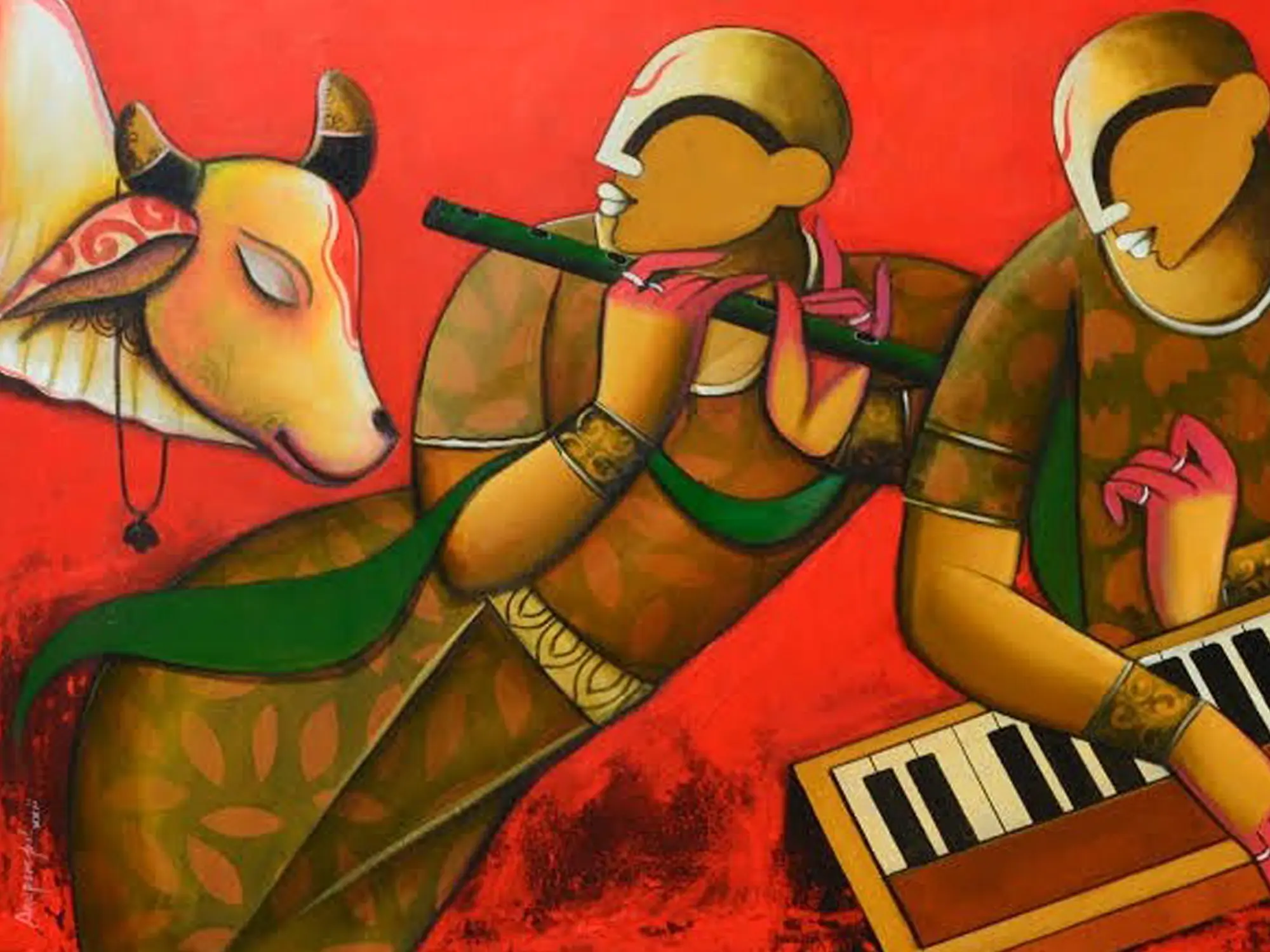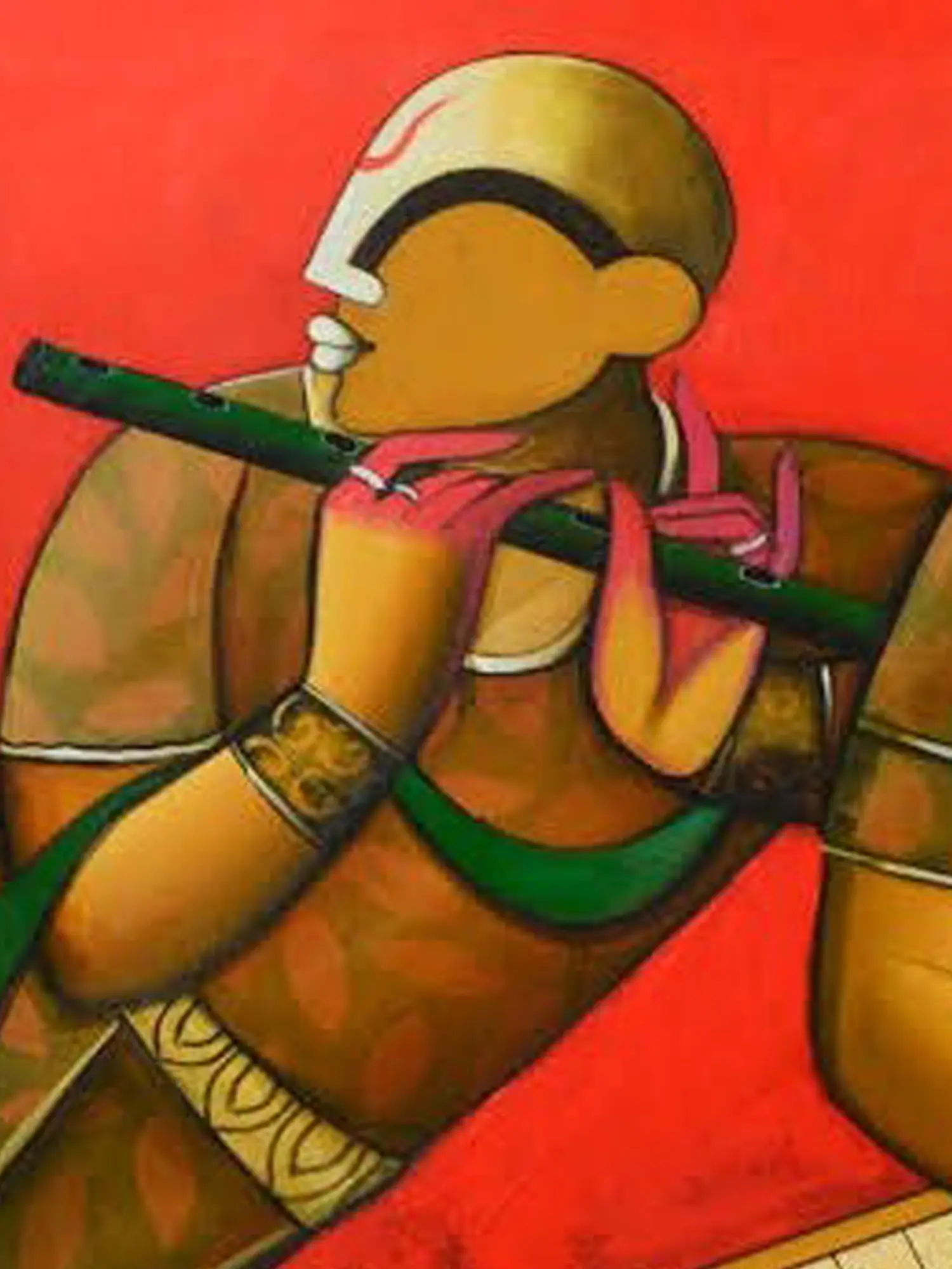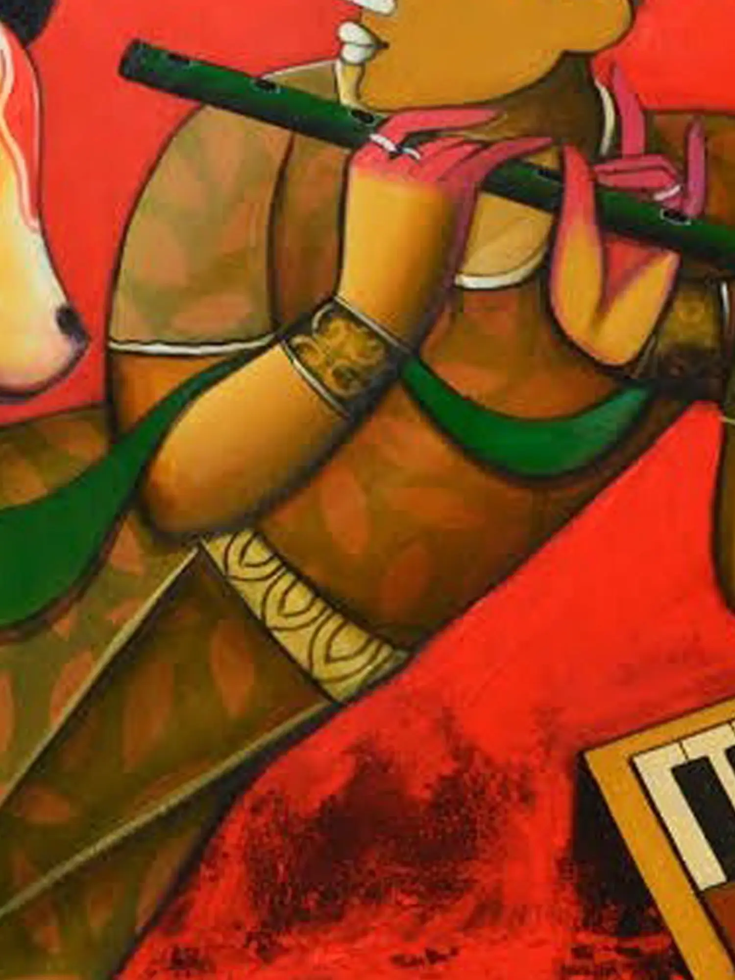 This heartwarming acrylic painting celebrates the concept of "Maitri" - universal love and friendliness - in Indian philosophy. The depiction of a Vaadaks and a Gau (cow) peacefully together transcends the expected boundaries of what’s human or not. The use of soft brushstrokes and a harmonious palette emphasises the gentle bond between these. This artwork serves as a reminder that love and compassion can transcend differences and foster connection in unexpected places.