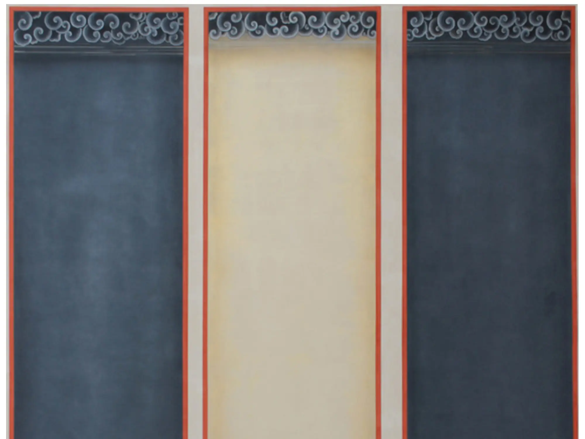 The striking vertical composition, reaching 56 inches in height and spanning 14 inches across each panel, creates a commanding presence. The deep, contemplative blues of the outer panels beautifully frame the ethereal, gradient tones of the central section. Delicate decorative motifs adorn the upper borders, hinting at celestial realms, while the lower sections are adorned with sparse, elegant floral elements. These visual cues not only define the sacred figures but also contribute to an overall atmosphere of serene grandeur.