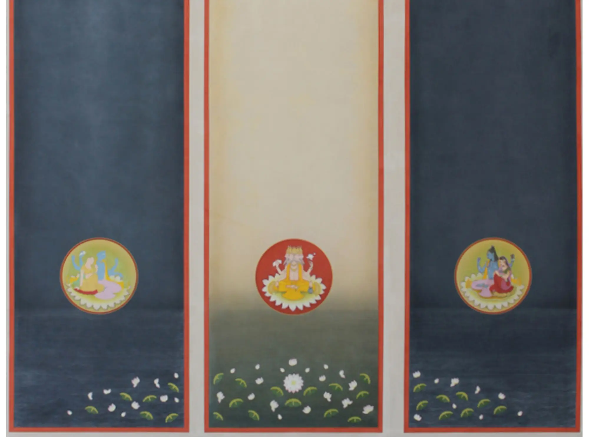 This triptych draws inspiration from the Trimurti, the supreme trinity of deities in Hinduism: Brahma the creator, Vishnu the preserver, and Mahesh (Shiva) the destroyer and transformer. The circular medallions at the base of each panel depict these revered figures in simplified yet evocative forms, inviting viewers to connect with ancient philosophical concepts. The artistic style subtly references the rich heritage of Indian miniature painting, adapted here for a contemporary appreciation of divine iconography.