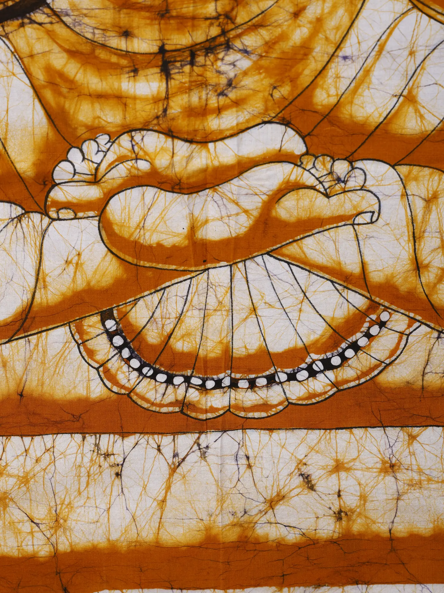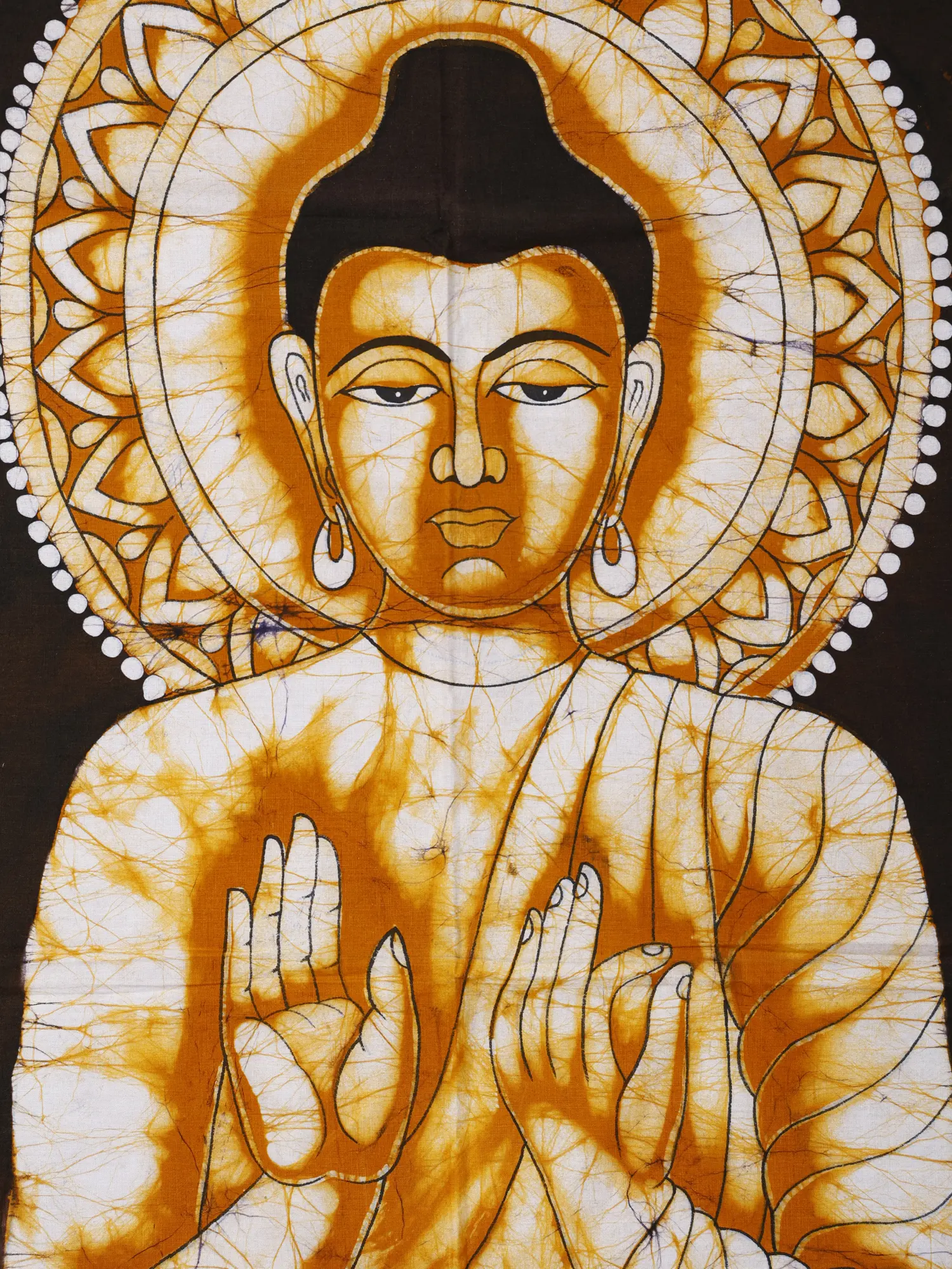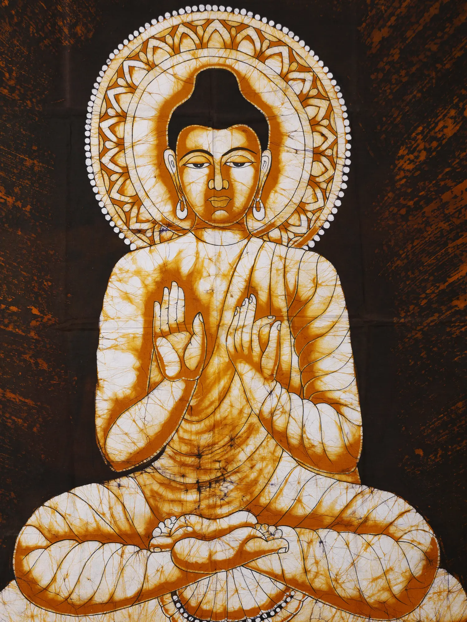 This Buddha in The Dharmachakra Mudra Batik Painting is a visual masterpiece, radiating beauty in simplicity. The yellow-toned portrayal of Buddha in the Dharmachakra Mudra, against a rich, dark brown background, adds an element of mysticism and depth to the artwork. The contrast between the serene yellow hues and the dramatic backdrop not only accentuates the meditative posture but also creates a captivating ambiance.